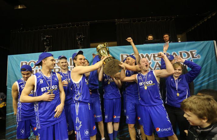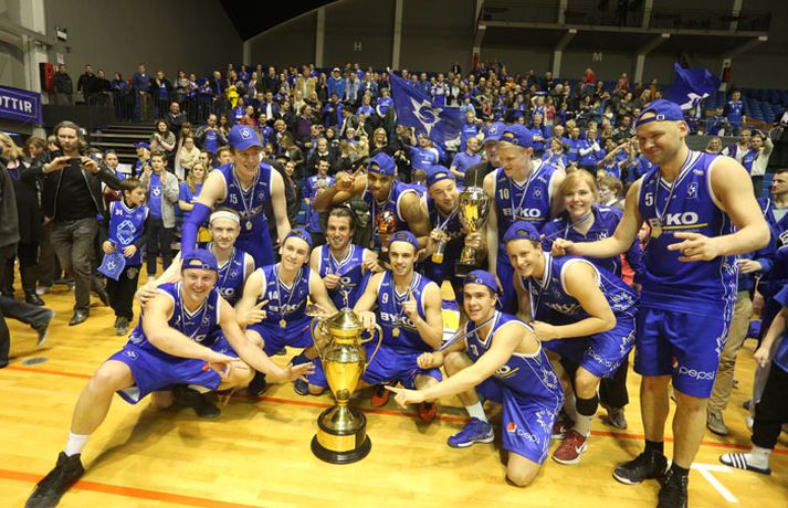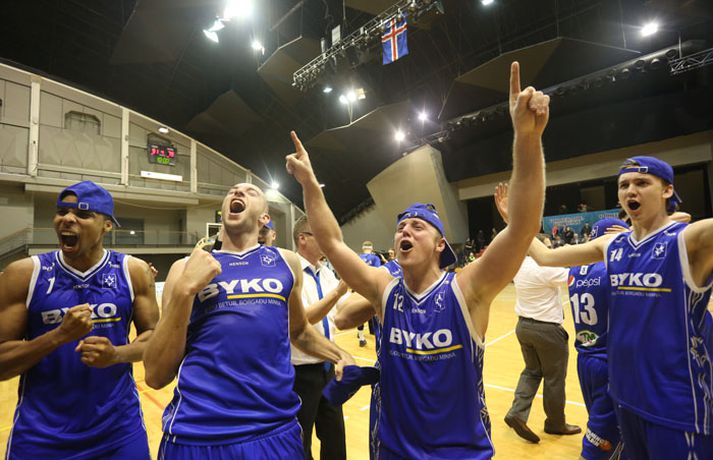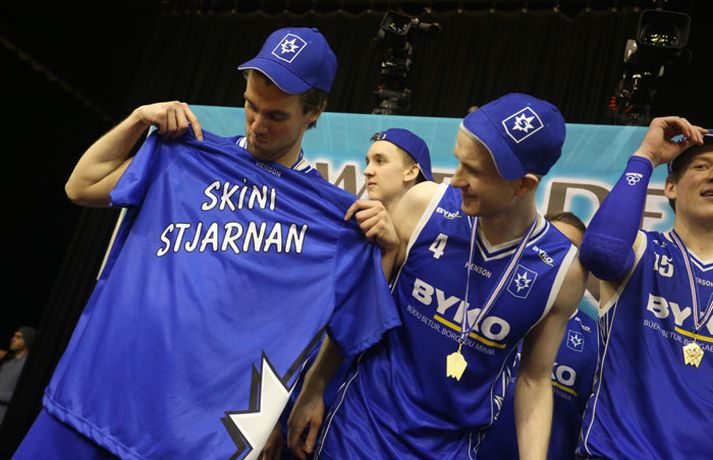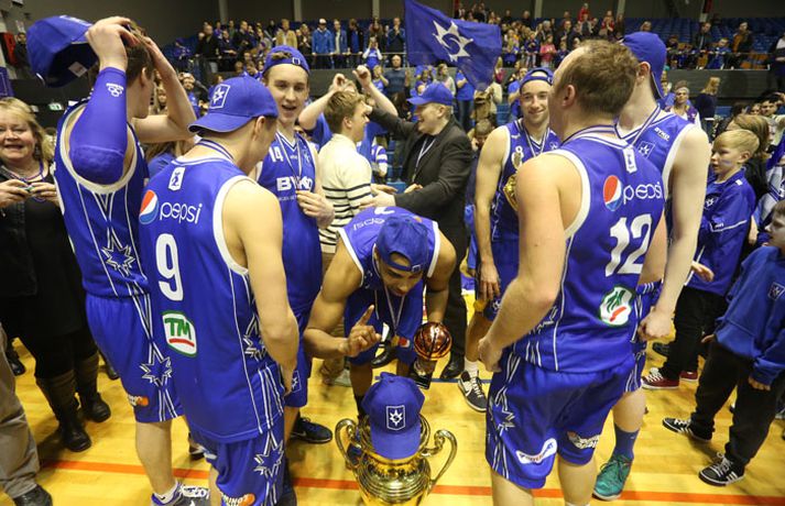 Umfjöllun, viðtöl og myndir: Stjarnan - Grindavík 91-79 | Garðbæingar bikarmeistarar! Elvar Geir Magnússon skrifar 16. febrúar 2013 00:01 Myndir / Daníel Rúnarsson Stjarnan var í miklu stuði og vann Grindavík í bikarúrslitaleik karla í dag 91-79. Grindavík var að spila sinn sjöunda úrslitaleik en Stjörnumenn voru komnir í Höllina í annað skiptið og hafa því unnið báða úrslitaleikina sem þeir hafa spilað. Sigurinn var svo sannarlega sanngjarn en Stjarnan leiddi frá upphafi til enda. Þrátt fyrir nokkrar góðar rispur Grindavíkur þá hleypti Garðabæjarliðið þeim gulu aldrei of nálægt sér. Garðbæingar mættu vel í Höllina og Stjörnuliðið fékk góðan stuðning. Allir voru tilbúnir í slaginn og það skilaði sér. Fyrir leikinn voru fleiri sem bjuggust við sigri Grindavíkur í leiknum en eins og góður maður sagði þá borgar sig ekki að veðja gegn sigurvegaranum Teiti Örlygssyni. Jarrid Frye fór hamförum í leiknum, skoraði 32 stig. Brian Mills gerði 17 stig og tók 9 fráköst.Marvin Valdimarsson: Maður er ekki meiddur í bikarúrslitaleik Einhver vafi var um það fyrir leikinn hvort Marvin Valdimarsson gæti spilað en hann átti flottan leik, skoraði níu stig og átti fjögur fráköst. "Ég æfði lítið en fékk góða aðhlynningu fyrir þennan leik. Ég vildi spila og fékk að spila. Ég náði að keyra mig upp að sársaukamörkum," sagði Marvin efir leikinn. "Maður er ekki meiddur í bikarúrslitaleik." "Við sýndum okkur rétta andlit. Okkur fannst hlægilegt að hlusta á alla tala um að þeir myndu rústa okkur. Við lásum það og undirbjuggum okkur vel. Þetta eru tvö jöfn lið en við vorum tilbúnari í dag." "Við vorum alltaf 10-15 stigum yfir og við héldum haus. Það voru allir tilbúnir í dag."Sverrir Sverrisson: Töpuðum fyrir betra liðiÞjálfari Grindvíkinga, Sverrir Þór Sverrisson, var auðmjúkur eftir leik. "Við vorum slakir. Auðvitað komu menn til leiks og ætluðu sér að spila sinn besta leik. En við lentum í hælunum í vörninni og hittum afleitlega. Stjarnan hitti á frábæran leik og við töpuðum fyrir betra liði í dag," sagði Sverrir. "Því miður fór þetta svona. Það hefur gengið vel hjá okkur í vetur og leiðinlegt að spila illa í svona mikilvægum leik. Það er óafsakanlegt gagnvart stuðningsmönnunum sem eru að mæta. Svona eru íþróttirnar. Það geta ekki allir gert það sem þeir ætla sér." "Stjarnan er með eitt albesta liðið í deildinni. Þetta er hörkulið og það hefði verið gríðarlegt afrek hefðum við unnið þá í dag."Teitur Örlygsson: Vonandi verður lagið hans Kjarra spilað í kvöld Teitur Örlygsson, þjálfari Stjörnunnar, var að vinna sinn annan bikartitil með félaginu. "Þetta var "dead solid" eins og maðurinn sagði. Þetta var flott sett upp hjá okkur. Ég er virkilega ánægður. Spennustigið var alveg hárrétt. Búið var að tala um bekkinn hjá Grindavík og breiddina hjá þeim. Menn voru að koma vel af bekknum og með kraft hjá okkur. Þjálfarar elska það og við verðum að hafa í okkar liði," sagði Teitur eftir leikinn. "Mér fannst liðið aldrei veikjast í þessar 40 mínútur." Fyrir leikinn bjuggust fleiri við sigri Grindavíkur. Var það að hjálpa Stjörnunni í undirbúningnum? "Ég veit það ekki. Ég reyndi að bulla aðeins viljandi í viðtölum í vikunni en ég held að það hafi ekki skipt neinu máli. Þeir eru klárari en það. Það er ekki eins og þetta Grindavíkurlið sé ungt. Þeir eru skynsamir. Við erum ekki heldir ungt lið og skynsamir svo við vorum ekkert að missa sjálfstraustið eftir þessa þrjá ósigra í röð. Við lékum okkur aðeins með það en vorum vel undirbúnir." "Það var æðislegt að sjá alla Garðbæingana í stúkunni og hvað þetta var allt blátt. Kjarri (Kjartan Atli Kjartansson) söng að bikarinn væri blár í ár, ég ætla að vona að það lag verði spilað eitthvað í kvöld." Það er verið að skapa heljarinnar körfuboltahefð í Garðabæ. "Það eru ekki mörg lið sem hafa unnið tvo bikartitla á síðustu árum. Það er virkilega gaman en mér og okkur er langað að taka annan titil. Við ætlum að rífa okkur upp þar og það byrjar á mánudaginn," sagði Teitur Örlygsson eftir leikinn.Stjarnan 91-79 GrindavíkStjarnan: Jarrid Frye 32/8 fráköst/6 stoðsendingar, Brian Mills 17/9 fráköst/3 varin skot, Jovan Zdravevski 15/6 fráköst, Justin Shouse 14/5 fráköst/9 stoðsendingar, Marvin Valdimarsson 9/4 fráköst/3 varin skot, Dagur Kár Jónsson 2, Kjartan Atli Kjartansson 2. Grindavík: Aaron Broussard 30/9 fráköst, Jóhann Árni Ólafsson 12/5 stoðsendingar, Samuel Zeglinski 9/8 fráköst, Sigurður Gunnar Þorsteinsson 8/5 fráköst, Björn Steinar Brynjólfsson 5, Ólafur Ólafsson 5/4 fráköst, Ómar Örn Sævarsson 4/5 fráköst, Þorleifur Ólafsson 4/7 fráköst, Ryan Pettinella 2.LEIK LOKIÐ: TIL HAMINGJU STJARNAN. Frye með 32 stig og Mills 17 fyrir Stjörnuna. Broussard var stigahæstur Grindvíkinga með 30 stig.4. leikhluti: 87-76. Leikurinn að klárast. Byrjað að grafa nafn Stjörnunnar á bikarinn.4. leikhluti: 85-69. Stuðningsmenn Stjörnunnar farnir að syngja sigursöngva.4. leikhluti: 81-67. Það eru 3:33 eftir.4. leikhluti: 77-64. Tveir þristar í röð gefa Grindvíkingum von. Björn Steinar Brynjólfsson, fréttaritari Fótbolta.net í Grindavík, skoraði fyrri þristinn en Broussard þann seinni.4. leikhluti: 77-58 fyrir Stjörnuna. 5:37 eftir. Kjartan Atli, rapparinn síkáti, að skora eftir magnaða sendingu Shouse. Þvílíkur meðbyr með Garðabæjarliðinu! Það er verið að salta Grindvíkinga. Bláklæddir í stuði!4. leikhluti: 69-58. Brian Mills með svakalega troðslu. Fékk boltann í loftinu og skoraði gull af körfu. Grindavík tekur leikhlé. Ég er ekki að sjá Stjörnuna gefa þetta eftir!4. leikhluti: 65-58. Grindavík a