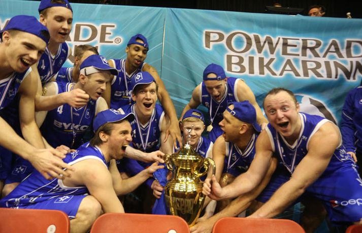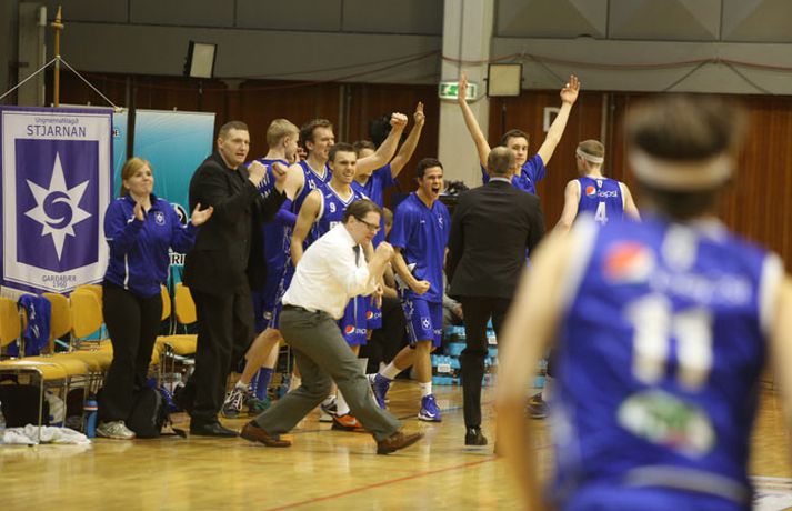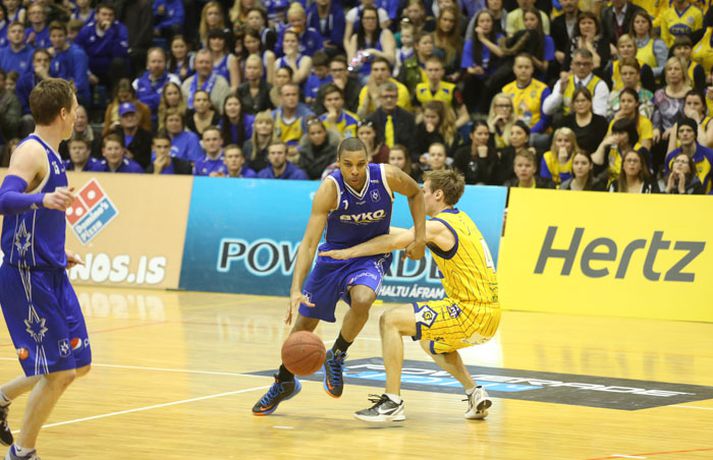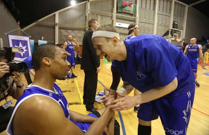 Stjarnan var í miklu stuði og vann Grindavík í bikarúrslitaleik karla í dag 91-79. Grindavík var að spila sinn sjöunda úrslitaleik en Stjörnumenn voru komnir í Höllina í annað skiptið og hafa því unnið báða úrslitaleikina sem þeir hafa spilað. Sigurinn var svo sannarlega sanngjarn en Stjarnan leiddi frá upphafi til enda. Þrátt fyrir nokkrar góðar rispur Grindavíkur þá hleypti Garðabæjarliðið þeim gulu aldrei of nálægt sér. Garðbæingar mættu vel í Höllina og Stjörnuliðið fékk góðan stuðning. Allir voru tilbúnir í slaginn og það skilaði sér. Fyrir leikinn voru fleiri sem bjuggust við sigri Grindavíkur í leiknum en eins og góður maður sagði þá borgar sig ekki að veðja gegn sigurvegaranum Teiti Örlygssyni. Jarrid Frye fór hamförum í leiknum, skoraði 32 stig. Brian Mills gerði 17 stig og tók 9 fráköst.Marvin Valdimarsson: Maður er ekki meiddur í bikarúrslitaleik Einhver vafi var um það fyrir leikinn hvort Marvin Valdimarsson gæti spilað en hann átti flottan leik, skoraði níu stig og átti fjögur fráköst. "Ég æfði lítið en fékk góða aðhlynningu fyrir þennan leik. Ég vildi spila og fékk að spila. Ég náði að keyra mig upp að sársaukamörkum," sagði Marvin efir leikinn. "Maður er ekki meiddur í bikarúrslitaleik." "Við sýndum okkur rétta andlit. Okkur fannst hlægilegt að hlusta á alla tala um að þeir myndu rústa okkur. Við lásum það og undirbjuggum okkur vel. Þetta eru tvö jöfn lið en við vorum tilbúnari í dag." "Við vorum alltaf 10-15 stigum yfir og við héldum haus. Það voru allir tilbúnir í dag."Sverrir Sverrisson: Töpuðum fyrir betra liðiÞjálfari Grindvíkinga, Sverrir Þór Sverrisson, var auðmjúkur eftir leik. "Við vorum slakir. Auðvitað komu menn til leiks og ætluðu sér að spila sinn besta leik. En við lentum í hælunum í vörninni og hittum afleitlega. Stjarnan hitti á frábæran leik og við töpuðum fyrir betra liði í dag," sagði Sverrir. "Því miður fór þetta svona. Það hefur gengið vel hjá okkur í vetur og leiðinlegt að spila illa í svona mikilvægum leik. Það er óafsakanlegt gagnvart stuðningsmönnunum sem eru að mæta. Svona eru íþróttirnar. Það geta ekki allir gert það sem þeir ætla sér." "Stjarnan er með eitt albesta liðið í deildinni. Þetta er hörkulið og það hefði verið gríðarlegt afrek hefðum við unnið þá í dag."Teitur Örlygsson: Vonandi verður lagið hans Kjarra spilað í kvöld Teitur Örlygsson, þjálfari Stjörnunnar, var að vinna sinn annan bikartitil með félaginu. "Þetta var "dead solid" eins og maðurinn sagði. Þetta var flott sett upp hjá okkur. Ég er virkilega ánægður. Spennustigið var alveg hárrétt. Búið var að tala um bekkinn hjá Grindavík og breiddina hjá þeim. Menn voru að koma vel af bekknum og með kraft hjá okkur. Þjálfarar elska það og við verðum að hafa í okkar liði," sagði Teitur eftir leikinn. "Mér fannst liðið aldrei veikjast í þessar 40 mínútur." Fyrir leikinn bjuggust fleiri við sigri Grindavíkur. Var það að hjálpa Stjörnunni í undirbúningnum? "Ég veit það ekki. Ég reyndi að bulla aðeins viljandi í viðtölum í vikunni en ég held að það hafi ekki skipt neinu máli. Þeir eru klárari en það. Það er ekki eins og þetta Grindavíkurlið sé ungt. Þeir eru skynsamir. Við erum ekki heldir ungt lið og skynsamir svo við vorum ekkert að missa sjálfstraustið eftir þessa þrjá ósigra í röð. Við lékum okkur aðeins með það en vorum vel undirbúnir." "Það var æðislegt að sjá alla Garðbæingana í stúkunni og hvað þetta var allt blátt. Kjarri (Kjartan Atli Kjartansson) söng að bikarinn væri blár í ár, ég ætla að vona að það lag verði spilað eitthvað í kvöld." Það er verið að skapa heljarinnar körfuboltahefð í Garðabæ. "Það eru ekki mörg lið sem hafa unnið tvo bikartitla á síðustu árum. Það er virkilega gaman en mér og okkur er langað að taka annan titil. Við ætlum að rífa okkur upp þar og það byrjar á mánudaginn," sagði Teitur Örlygsson eftir leikinn.Stjarnan 91-79 GrindavíkStjarnan: Jarrid Frye 32/8 fráköst/6 stoðsendingar, Brian Mills 17/9 fráköst/3 varin skot, Jovan Zdravevski 15/6 fráköst, Justin Shouse 14/5 fráköst/9 stoðsendingar, Marvin Valdimarsson 9/4 fráköst/3 varin skot, Dagur Kár Jónsson 2, Kjartan Atli Kjartansson 2. Grindavík: Aaron Broussard 30/9 fráköst, Jóhann Árni Ólafsson 12/5 stoðsendingar, Samuel Zeglinski 9/8 fráköst, Sigurður Gunnar Þorsteinsson 8/5 fráköst, Björn Steinar Brynjólfsson 5, Ólafur Ólafsson 5/4 fráköst, Ómar Örn Sævarsson 4/5 fráköst, Þorleifur Ólafsson 4/7 fráköst, Ryan Pettinella 2.LEIK LOKIÐ: TIL HAMINGJU STJARNAN. Frye með 32 stig og Mills 17 fyrir Stjörnuna. Broussard var stigahæstur Grindvíkinga með 30 stig.4. leikhluti: 87-76. Leikurinn að klárast. Byrjað að grafa nafn Stjörnunnar á bikarinn.4. leikhluti: 85-69. Stuðningsmenn Stjörnunnar farnir að syngja sigursöngva.4. leikhluti: 81-67. Það eru 3:33 eftir.4. leikhluti: 77-64. Tveir þristar í röð gefa Grindvíkingum von. Björn Steinar Brynjólfsson, fréttaritari Fótbolta.net í Grindavík, skoraði fyrri þristinn en Broussard þann seinni.4. leikhluti: 77-58 fyrir Stjörnuna. 5:37 eftir. Kjartan Atli, rapparinn síkáti, að skora eftir magnaða sendingu Shouse. Þvílíkur meðbyr með Garðabæjarliðinu! Það er verið að salta Grindvíkinga. Bláklæddir í stuði!4. leikhluti: 69-58. Brian Mills með svakalega troðslu. Fékk boltann í loftinu og skoraði gull af körfu. Grindavík tekur leikhlé. Ég er ekki að sjá Stjörnuna gefa þetta eftir!4. leikhluti: 65-58. Grindavík aðeins að saxa.3. leikhluta lokið: 65-54. Fróðlegur lokafjórðungur framundan. Frye kominn með 22 stig fyrir Stjörnuna. Broussard er með 20 stig.3. leikhluti: 56-47. S