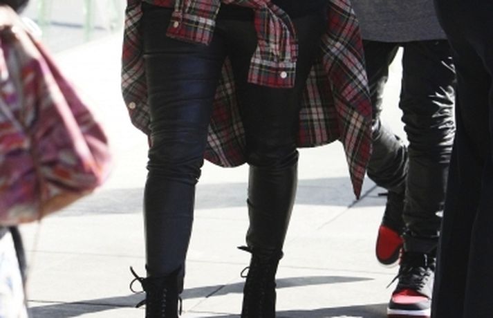 Raunveruleikastjarnan Kim Kardashian bauð upp á níðþröngar leðurbuxur og himinháa hæla er hún keypti sér frosna jógúrt með sínum heittelskaða, tónlistarmanninum Kanye West, í Los Angeles í vikunni. Kim og Kanye eiga von á sínu fyrsta barni og faldi Kim kúluna með því að binda flónelskyrtu um sig miðja.Töffari.Kim hefur miklar áhyggjur af því að fitna á meðgöngunni og stundar ræktina aðeins of stíft með einkaþjálfaranum Tracy Anderson.Jógúrt með kæró."Tracy Anderson heldur mér í formi! Hún hjálpar mér að gera viðeigandi ráðstafanir svo ég sé hamingjusöm og hraust og mikilvægara er að hún er búin að gera ræktarplan sem er öruggt fyrir barnið," segir Kim.Þú gætir unnið - vertu með okkur á Facebook.