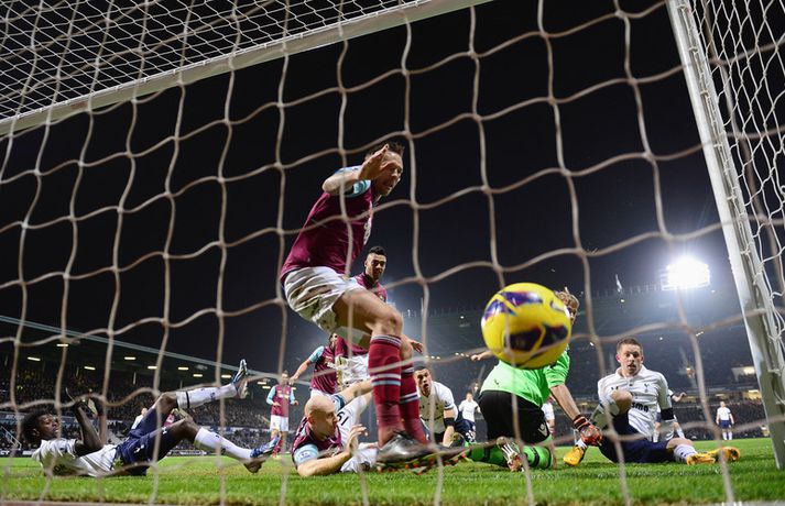 Gylfi Þór Sigurðsson skoraði sitt fyrsta deildarmark fyrir Tottenham í kvöld þegar hann jafnaði metin í 2-2 í 3-2 sigri liðsins á West Ham á Upton Park. Tottenham komst upp í þriðja sætið með þessum sigri en sigurmark Gareth Bale var af betri gerðinni. Gylfi kom inn á sem varamaður á 55. mínútu og var nálægt því að skora skömmu síðar þegar Jussi Jääskeläinen varði skot hans í stöng. Markið hans Gylfa kom á 76. mínútu eftir þvögu í teignum en þetta var nú ekki fallegasta markið hans í ensku úrvalsdeildinni þótt að það hafi verið langþráð. Hér í myndbandinu fyrir ofan má sjá mörkin mikilvægu sem Gylfi og Gareth Bale skoruðu fyrir Tottenham í leiknum í kvöld en Gylfi var fyrir leikinn búinn að spila 22 deildarleiki fyrir Tottenham-liðið án þess að ná að skora.