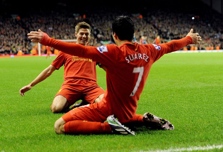 Gerrard: Fáir í heiminum hafa spilað betur en Suarez að undanförnu Eiríkur Stefán Ásgeirsson skrifar 21. febrúar 2013 14:30 Nordic Photos / Getty Images Steven Gerrard segir að Úrúgvæinn Luis Suarez hafi sýnt með frammistöðu sinni á tímabilinu að fáir eru í dag betri knattspyrnumenn en hann. Suarez hefur skorað 23 mörk með Liverpool á tímabilinu, þar af átján í ensku úrvalsdeildinni. „Mér finnst hann leikmaður ársins, bæði í þessari deild og í mörgum öðrum," sagði Gerrard í viðtali við fréttavef BBC. „Það eru líklega bara einn eða tveir knattspyrnumenn sem hafa staðið sig betur en hann. Ég veit ekki hvort hann geti bætt sig eitthvað enn frekar en það er fremur ógnvekjandi tilhugsun." Liverpool mætir Zenit frá St. Pétursborg í síðari viðureign liðanna í 32-liða úrslitum Evrópudeildar UEFA klukkan 20.05 í kvöld. Leikurinn verður sýndur í beinni útsendingu á Stöð 2 Sport. Zenit vann fyrri leikinn á heimavelli, 2-0, en Gerrard hefur ekki gefið upp alla von. „Vonandi nær Suarez að sýna töfra sína. Bestu leikmenn heims eru þekktir fyrir leiki þar sem þeir skora mikilvæga leik og snúa aðstæðum sínum liðum í hag." „Ég myndi gjarnan vilja að Suarez verði hetja leiksins í kvöld. Hann á það skilið." Enski boltinn Mest lesið Sagði fyrst nei við beiðni Kjartans: „Menn hálf skammast sín“ Körfubolti Barði sig til blóðs eftir tap á HM Sport Jafnt í ótrúlegum átta marka leik á Old Trafford Enski boltinn Mætti til leiks berfættur og ber að ofan í snjókomunni Sport „Í dag er dagurinn sem þú fæddist, í dag er dagurinn sem þú munt deyja“ Enski boltinn Uppgjörið: Haukar - Fram 25-27 | Meistararnir unnu toppliðið í naglbít Handbolti „Auðvitað var þetta sjokk“ Körfubolti Breyttist úr hetju í skúrk: Rekinn út af fyrir að ögra LeBron Körfubolti Þórir í skýjunum: „Sit með lítið tár í augnkróknum“ Handbolti „Sé ekkert annað en að dýrasti leikmaður deildarinnar verði áfram á bekknum“ Enski boltinn Fleiri fréttir Skemmtilegt fyrir fólkið heima og United verðskuldaði sigur Jafnt í ótrúlegum átta marka leik á Old Trafford Vildi ekki skýra ummælin um verstu 48 klukkutímana frekar Maresca hafi tekið blaðsíðu úr bók Salah og gert sér óleik Guardiola gagnrýndi Foden þrátt fyrir markið „Finnst þér ekki eins og hann sé þjakaður af pressu yfir því hvað hann sé lélegur?“ Fyrirliði Newcastle eftir tapið fyrir Sunderland: „Þetta er svo vandræðalegt“ Sjáðu klaufalegt sjálfsmark Woltemade í grannaslagnum og öll hin úr enska Amorim verður ánægður ef Mainoo ræðir við hann um lán „Sé ekkert annað en að dýrasti leikmaður deildarinnar verði áfram á bekknum“ „Í dag er dagurinn sem þú fæddist, í dag er dagurinn sem þú munt deyja“ Henderson heiðraði minningu Jota eftir fyrsta markið sitt í fjögur ár Calvert-Lewin jafnaði fyrir Leeds í lokin „Gott fyrir svæðið, félagið og stuðningsmennina“ Sunderland vann nágrannaslaginn fyrir norðan Haaland með tvennu í öruggum útisigri City Sangaré og Hudson-Odoi hrelltu Tottenham Sjáðu sjálfsmörkin sem björguðu Arsenal og hetju Liverpool skora tvö Salah skráði sig á spjöld sögunnar í endurkomunni í dag „Stundum þarf maður heppni“ Tvö sjálfsmörk færðu Arsenal fimm stiga forkost á toppnum „Verstu 48 klukkustundirnar“ síðan að hann kom til Chelsea Fulham vann í markaleik á Turf Moor Ian Rush lagður inn á sjúkrahús „Kannski áttum við heppnina skilið í dag“ „Ég held að þetta hafi ekki verið kveðjustund“ „Þegar þú spilar fyrir Liverpool verðurðu bara að vinna leiki“ Salah lagði upp í endurkomunni en Ekitike sá um mörkin Palmer skoraði í fyrsta sinn síðan í september Mesta heillaskref ferilsins að hafa verið rekinn Sjá meira