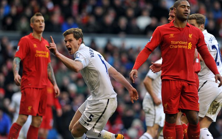 Liverpool skellti Tottenham | Gylfi lék allan leikinn Guðmundur Marinó Ingvarsson skrifar 10. mars 2013 00:01 Mynd/Nordic Photos/Getty Liverpool sigraði Tottenham 3-2 í stórleik dagsins í ensku úrvalsdeildinni í fótbolta. Steven Gerrard tryggði Liverpool sigurinn með marki úr vítaspyrnu átta mínútum fyrir leikslok. Luis Suarez kom Liverpool yfir 21. mínútu þegar hann afgreiddi boltann frábærlega í markið úr þröngu færi. Örfáum andartökum fyrir hálfleik jafnaði Jan Vertonghen með skalla eftir aukaspyrnu Gareth Bale. Bale átti aftur fyrirgjöfina þegar Vertonghen nýtti sér vandræði Liverpool í að hreinsa á áttundu mínútu seinni hálfleiks og Tottenham komið yfir. Stewart Downing jafnaði metin á 66. mínútu með hægri fæti eftir skelfileg mistök Hugo Lloris í marki Tottenham. Það var svo Steven Gerrard sem tryggði Liverpool sigurinn á 82. mínútu með marki úr vítaspyrnu sem dæmd var eftir að Assou-Ekotto braut á Luis Suarez. Liverpool er komið í 45 stig í 6. sæti og er nú sjö stigum á eftir Chelsea í fjórða sæti deildarinnar en Chelsea á leik til góða. Gylfi Þór Sigurðsson lék allan leikinn fyrir Tottenham sem er í þriðja sæti deildarinnar með 54 stig. Gylfi fékk tvö góð færi í leiknum en náði ekki að skora. Enski boltinn Mest lesið Hneysklaður á ósönnum orðrómum Fótbolti Þreytt á umræðu um líkamann sinn: „Á ekki að tjá sig um það“ Sport Ekkja Jota þakklát: „Hefur meiri þýðingu en orð geta lýst“ Enski boltinn Hættir ekki fyrr en hann skorar þúsund mörk Fótbolti Yfirgefur Keflavík vegna komu Martins Körfubolti Skynjar stress hjá Arsenal Enski boltinn Enn kvarnast úr liði Blika Íslenski boltinn Ótrúleg tölfræði Jokic Körfubolti Dagskráin í dag: Pílukast og Íslandsmeistarar Sport Segja að Wirtz græði á fjarveru Salah: „Sé hann fljúga í gang“ Enski boltinn Fleiri fréttir „Knattspyrnustjórar eru ekki töframenn“ Segja að Wirtz græði á fjarveru Salah: „Sé hann fljúga í gang“ Skynjar stress hjá Arsenal Sjáðu frábært samspil Leeds og Gray tryggja Spurs sigurinn Ekkja Jota þakklát: „Hefur meiri þýðingu en orð geta lýst“ Jöfnuðu 128 ára gamalt met Gray hetja Tottenham Calvert-Lewin skoraði í sjötta leiknum í röð Andy Carroll mætir fyrir dóm eftir að hafa verið handtekinn Villa kvartar til Chelsea vegna flösku sem flaug á bekkinn Sjáðu magnaða vörslu Raya: „Þetta var stórkostlegt“ Sjáðu fyrsta mark Wirtz, laglega sjálfsmarkið og Watkins stúta Chelsea Liverpool-skotmarkið ekki á förum í janúar Aldrei spilað þarna en sagði strax já „Viss um að ég myndi skora einn daginn“ Watkins hélt ótrúlegri sigurgöngu Villa áfram Schade og Jiménez sendu Brentford og Fulham í efri hlutann Arsenal aftur á toppinn Fyrsta mark Wirtz í þriðja sigrinum í röð Cherki aðalmaðurinn í sigri City Úlfarnir heiðruðu minningu Jota Andri Lucas frá í mánuð Sjáðu dönsku þrumuna sem færði United-mönnum öll þrjú stigin Segir að Arsenal stefni á sögulega fernu á þessu tímabili Amorim endaði viðtalið á gamansömum nótum „Við eigum heima í Evrópu“ Daninn skaut Man. United upp fyrir Liverpool Amorim segir strákinn í frystinum vera framtíðin hjá Man. United Martinez með fyrirliðabandið og báðir Fletcher-bræðurnir á bekknum Havertz gæti snúið aftur á næstu dögum Sjá meira