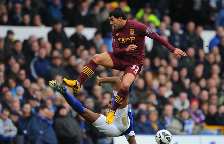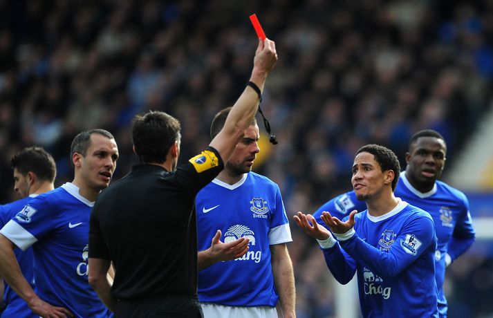 Titilvonir City nánast úr sögunni | Everton í Evrópusæti 16. mars 2013 00:01 Mynd/Nordic Photos/Getty Everton vann 2-0 sigur á Manchester City þrátt fyrir að hafa misst Steven Pienaar af velli með rautt spjald snemma í síðari hálfleik. Manchester United fær því tækifæri til að auka forystu sína á toppi deildarinnar í fimmtán stig þegar að liðið leikur gegn Reading klukkan 17.30 í dag. Ef það tekst má ljóst vera að titilvonir City verða nánast úr sögunni. Everton komst yfir með glæsilegu marki Leon Osman sem skrúfaði boltann í netið af 30 metra færi. Kevin Mirallas hafði þá komið boltanum í mark City en markið var dæmt af. Pienaar fékk svo rautt spjald þegar um stundarfjórðungur var liðinn af síðari hálfleik fyrir sína aðra áminningu í leiknum. City náði þó ekki að nýta sér meðbyrinn og Nikica Jelavic innsiglaði sigur Everton með marki eftir skyndisókn í uppbótartíma. Leikmenn City vildu þó fá víti þegar hendi var dæmd á Fellaini í stöðunni 1-0. Belginn stóð inn í teig þegar hann fékk boltann í sig en dómari leiksins dæmdi engu að síður aukaspyrnu utan teigs, City-mönnum til mikillar gremju. Maður leiksins var Jan Mucha sem stóð vaktina í marki Everton í fjarveru Tim Howard, sem er meiddur. Mucha varði oft glæsilega í leiknum. Sigurinn kom Everton upp í fimmta sæti deildarinnar, upp fyrir Arsenal og Liverpool. Everton er með 48 stig. Enski boltinn Mest lesið Stór nöfn úr leik á HM í pílukasti Sport Dómarinn hlýtur mikið lof fyrir stundarbræði í garð Jake Paul og Joshua Sport Ronaldo á nærbuxunum lætur Elon Musk efast um sjálfan sig Fótbolti Gleði og sorg í sigri Liverpool Enski boltinn Slot fámáll um stöðuna á Isak Enski boltinn Calvert-Lewin hættir ekki að skora Enski boltinn Körfuboltakvöld: Tilþrif tímabilsins til þessa Körfubolti Donni fagnaði EM vali með skotsýningu Handbolti Gyökeres skaut Arsenal aftur á toppinn Enski boltinn Madrídingar anda ofan í hálsmálið á Börsungum Fótbolti Fleiri fréttir Calvert-Lewin hættir ekki að skora Gyökeres skaut Arsenal aftur á toppinn Slot fámáll um stöðuna á Isak Gleði og sorg í sigri Liverpool Dramatík er Broja reyndist hetja Burnley Haaland frábær er Manchester City komst á toppinn Andri Lucas skoraði í langþráðum sigri Blackburn Chelsea vann upp tveggja marka forskot á St James' Park Ekkert fararsnið á Guardiola sem segir að City verði að vera undirbúið Tíu bestu mörkin úr leikjum Liverpool og Tottenham Salah bað samherjana afsökunar Lineker fokillur við blaðamann: „Þvílíkt kjaftæði“ Skírði soninn LFC og Mac Allister lét draum feðganna rætast Jóga og pílates lykillinn að snöggri endurkomu Fantasýn: „Hann setti allt á 3 og það kom upp 19“ Alexander Isak fékk sænska gullboltann „Salah líkaði ekki að vera í skugganum af Isak og Wirtz“ Amorim vill Neves Benti á hinn íslenska Dan Burn Lést á leiðinni heim úr fótboltaleik Forsætisráðherrann hótar Roman Abramovich og segir að „klukkan tifi“ „Sýnum kvennaíþróttir af því að þær eru frábærar“ Snéri aftur í fótbolta eftir 35 ára hlé: „Kalla mig Jackie Grealish“ Óttast að besti leikmaður Liverpool verði frá Ungstirnið skallaði meistarana áfram Gat ekki komið í veg fyrir að City færi áfram City sagt ætla að keppa við Liverpool og United um Semenyo Man United ósátt við Marokkó og FIFA Sápan trolluð: „Þetta er þessi klikkhaus með röddina“ Stjarnan fór í dulargervi: Setti stuðningsmann United á óþekka listann Sjá meira