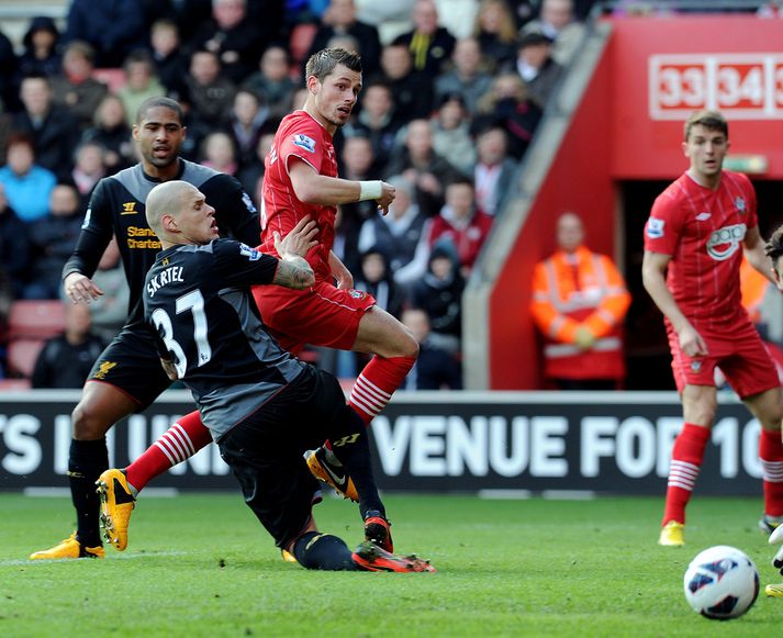 Fjórum leikjum er nú nýlokið í ensku úrvalsdeildinni en Liverpool gaf þá verulega eftir í baráttunni um Evrópusæti. QPR tapaði mikilvægum stigum í botnslagnum en talsvert bil er nú á milli þriggja neðstu liðanna og næstu liða fyrir ofan. Southampton fékk Liverpool í heimsókn og vann sanngjarnan sigur, 3-1. Morgan Schneiderlin og Rickie Lambert komu liðinu yfir í fyrri hálfleik en Coutinho náði reyndar að klóra í bakkann fyrir gestina eftir að hafa hirt frákast af skoti Daniel Sturridge. Liverpool spilaði betur í seinni hálfleik en gekk illa að skapa sér færi. Jay Rodriguez gerði svo út um leikinn þegar hann skoraði þriðja mark Southampton á 80. mínútu. Hann labbaði einfaldlega í gegnum vörn gestanna og skroraði eftir að hann fylgdi eftir fyrra skoti sínu sem Brad Jones varði. Liverpool datt niður í sjöunda sæti deildarinnar en liðið er með 45 stig. Southampton er í fimmtánda sæti með 31 stig. Arsenal komst upp í fimmta sæti deildarinnar með góðum 2-0 útisigri á Swansea. Nacho Monreal skoraði fyrra markið eftir darraðadans í teignum og Gervinho innsiglaði sigurinn í uppbótartíma með marki eftir skyndisókn. QPR hefði getað komist upp úr fallsæti deildarinnar með sigri á Aston Villa og liðið komst yfir með marki Jermaine Jenas. Villa svaraði með tveimur mörkum en QPR náði að jafna áður en Christian Benteke tryggði Aston Villa sigurinn skömmu fyrir leikslok. QPR komst þó nálægt því að jafna leikinn með síðustu spyrnu leiksins en Clint Hill skaut framhjá úr góðu færi. QPR er því enn í neðsta sæti deildarinnar með 23 stig, rétt eins og Reading sem mætir Manchester United síðar í dag. Wigan er í átjánda sæti með 24 stig en á tvo leiki til góða. Aston Villa er nú með 30 stig í sautjánda sæti deildarinnar og er nú sex stigum frá fallsæti. Stoke og West Brom gerðu markalaust jafntefli en með stiginu komst Stoke í hóp tíu efstu liða deildarinnar, þrátt fyrir að hafa einn leik á þessu ári.Úrslit dagsins:Swansea - Arsenal 0-2 0-1 Nacho Monreal (74.) 0-2 Gervinho (90+1.)Aston Villa - QPR 3-2 0-1 Jermaine Jenas (23.) 1-1 Gabriel Agbonlahor (45+3.) 2-1 Andreas Weimann (59.) 2-2 Andros Townsend (73.) 3-2 Christian Benteke (81.)Southampton - Liverpool 3-1 1-0 Morgan Schneiderlin (6.) 2-0 Rickie Lambert (33.) 2-1 Philippe Coutinho (45+1.) 3-1 Jay Rodriguez (80.)Stoke - West Brom 0-0