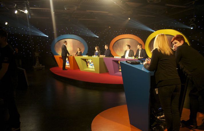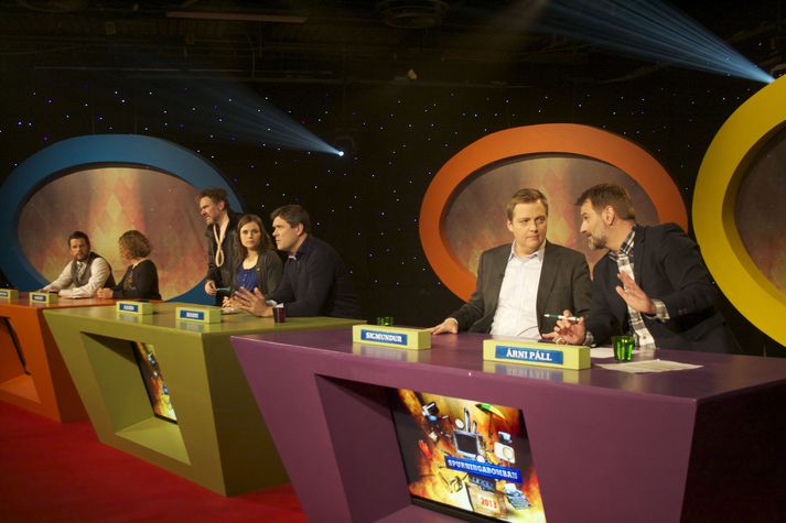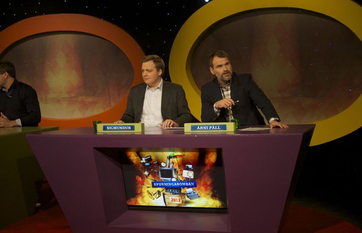 Það verða tímamót í skemmtiþættinum Spurningabombunni í kvöld þegar formenn sex stjórnmálaflokka keppast um að hrósa sigri í þættinum vinsæla. Þáttarstjórnandinn geðþekki Logi Bergmann er ekki þekktur fyrir að taka keppendur sína vettlingatökum og verður engin breyting á í kvöld þó um ráðamenn þjóðarinnar sé að ræða.Í startholunum.Gestir þáttarins eru Sigmundur Davíð Gunnlaugsson, formaður Framsóknar, Árni Páll Árnason, formaður Samfylkingarinnar, Bjarni Benediktsson, formaður Sjálfstæðisflokksins, Katrín Jakobsdóttir, formaður Vinstri Grænna, Margrét Tryggvadóttir hjá Dögun og Guðmundur Steingrímsson hjá Bjartri framtíð. Ýmislegt mun koma á óvart í kvöld og mun Sigmundur Davíð til dæmis segja sögur af vinnustaðagríni á Alþingi.Bjarni hress.Allir pólitíkusarnir fengu sinn skerf af skotum frá Loga en reyndu þó sitt besta að skjalla hann og finna upp á skemmtilegum svörum til að næla sér í aukastig.Logi í sminki.Dregið var í lið og eru Margrét og Guðmundur saman, Bjarni og Katrín saman í liði og Sigmundur Davíð og Árni Páll saman í liði. Síðastnefnda liðið náði afar vel saman og voru þeir félagar duglegir að gefa hvor öðrum fimmu þegar vel gekk.Stund milli stríða hjá Gumma og Kötu.Facebook-síða Spurningabombunnar.Logi ráðfærir sig við framleiðandann Önnu Vigdísi.Þú gætir unnið - vertu með okkur á Facebook.
