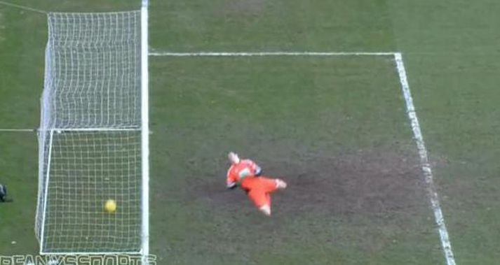 Boltinn langt inni en markið ekki dæmt | Myndband 11. mars 2013 22:45 Leigh Griffith, leikmaður Hibernian í Skotlandi, skoraði glæsilegt mark beint úr aukaspyrnu um helgina. Því miður fyrir hann var markið ekki dæmt gilt. Boltinn fór augljóslega langt inn fyrir línuna en dómaratríóið sá það ekki, leikmönnum Hibs til mikils ama. Marklínutækni er væntanleg í boltann á stærstu mótum heims og líklega í stærstu deildunum líka. Hinir þurfa að sætta sig við að enn verða lögleg mörk ekki dæmd góð og gild. Fótbolti Mest lesið Knorr lofaði Alfreð: Enginn egóisti og róaði okkur Handbolti Dagur henti tveimur leikmönnum sínum upp í stúku Handbolti Utan vallar: Ég get ekki meir Handbolti „Besta íslenska landslið sem við höfum mætt“ Handbolti Aldrei hlegið jafnmikið og við að horfa á Nablann Körfubolti Ísland - Ungverjaland | Úrslitaleikur um efsta sætið í riðlinum Sport Mikil trú á íslenskum sigri meðal stuðningsmanna Íslands Handbolti Átján ára orðin næstfljótust í sögu Íslands Sport Gleðin snerist í sorg hjá Danmörku Handbolti „Sumir ungir þjálfarar nú til dags eru hrokafullir“ Enski boltinn Fleiri fréttir Fyrirliði FHL er mættur í Laugardalinn Bodø/Glimt - Man. City | Haaland á heimaslóðum KSÍ staðfestir leik gegn heimilislausa HM-liðinu Leikmaður Liverpool lenti í eltihrelli Vilja sjá þessa stjóra í brúna hjá United Telma eltir þjálfarann í Garðabæinn Hringdu dag og nótt til að klófesta Guðmund: „Konan var að verða geðveik á þeim“ Ísland spilar við gestgjafa HM og Haítí Bestu mörkin: Sjáðu glæsilegan hjólhest gríska táningsins „Sumir ungir þjálfarar nú til dags eru hrokafullir“ Benoný til bjargar eftir vandræðalegt sjálfsmark liðsfélaga „Carrick gaf stuðningsmönnum „smjörþefinn“ af Ferguson-tímanum“ Hjólhestaspyrna táningsins tryggði Brighton stig Mourinho kallar nýjustu sögusagnirnar sápuóperu Bryndís Arna er komin heim og samdi við Breiðablik Guardiola um Haaland: „Hann svaf ótrúlega vel“ Marokkó leitar réttar síns hjá FIFA: „Þetta sár grær ekki auðveldlega“ Hörður Björgvin tekinn af velli í hálfleik í unnum leik Yfirmaður Jóns Dags í stríði við lögreglu Guéhi genginn til liðs við City Börsungar brjálaðir út í dómara sem tók þrjú mörk af þeim „Þetta eru svakaleg kaup“ Slóst við boltastráka sem vildu stela handklæðinu Tískuspaðinn Þorleifur fer aftur út Sagður fá lengri líflínu „Þegar þú ert ráðinn til Chelsea er bara spurning hvenær þú verður rekinn“ Rauk út eftir lætin í blaðamönnum Algjör upplausn í úrslitaleik Afríkukeppninnar: „Farsakennt“ Aston Villa mistókst að höggva í forskot Arsenal Gummi Tóta orðinn leikmaður ÍA Sjá meira