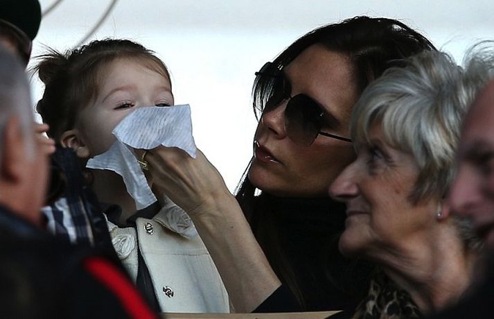 Harper Beckham, dóttir Victoriu og Davids Beckham, er aðeins nítján mánaða gömul en er strax orðin mjög áhugasöm um knattspyrnu. Svo sem ekki skrítið þar sem faðir hennar er einn vinsælasti fótboltamaður heims. Hún fór með móður sinni og bræðrum á leik með pabba á laugardaginn þegar liðið hans Paris St Germain atti kappi við AS Nancy á leikvanginum Parc des Princes í París.Harper í stuði.Harper var gríðarlega spennt á vellinum og lét vel í sér heyra."Sjáðu pabba," gæti Ted verið að segja við afabarnið sitt.Foreldrar Davids, Ted og Sandra, voru líka með í för og nutu þess að eyða tíma með barnabörnum sínum.David sýnir listir sínar.Þú gætir unnið - vertu með okkur á Facebook.