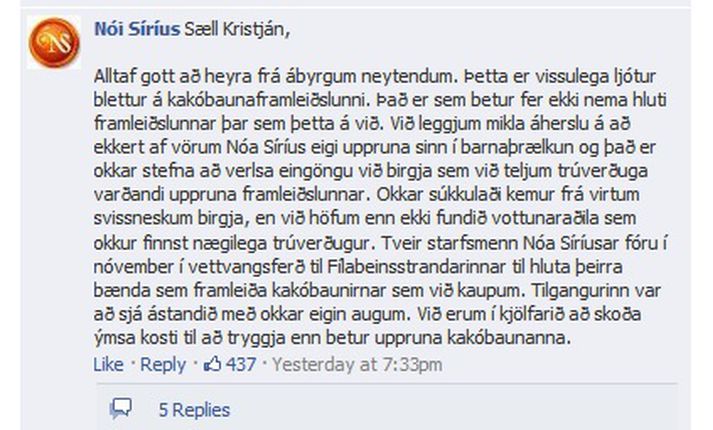 Talsmaður Íslandsdeildar alþjóðasamtakanna Stop the Traffik fullyrðir að börn í ánauð komi nálægt framleiðslu kakóbauna sem notaðar eru í íslenskt súkkulaði. Samtökin skora á íslenskan almenning að þrýsta á íslenska sælgætisframleiðendur um að hefja framleiðslu á vottuðu súkkulaði. „Við höfðum samband við öll stóru fyrirtækin hér á landi í fyrra og fengum ekki viðbrögð frá neinum nema Nóa Síríus sem fengu okkur á fund og voru mjög opnir fyrir þessari umfjöllun," segir Elísabet Ingólfsdóttir, meðlimur samtakanna. „Þeir höfðu greinilega verið undir þrýstingi og höfðu aðeins kynnt sér þessi mál. Við komumst að því að þeir eru að fá kakóbaunir frá tilteknum svissneskum framleiðanda sem er á svörtum lista fyrir að kaupa baunir frá Fílabeinsströndinni, þar sem börn eru í þrælkunarvinnu við kakóframleiðslu. Þeir hjá Nóa sögðust ekki hafa burði í að vera í milliðalausum kaupum við bændur og að þeir væru að skoða þetta, en að þeir væru tortryggnir í garð vottunarfyrirtækjanna." Elísabet segir lítil börn flutt á milli landa í Vestur Afríku eins og Malí og Búrkína Fasó og þeim sé lofað góð vinna og menntun, og að launin þeirra verði send heim. Svo þegar á staðinn sé komið taki við ólaunuð þrælkunarvinna. „Þeir hjá Nóa sögðust þurfa að skoða málið nánar og fá vottun sem þeir gætu treyst. Þegar við fiskuðum eftir því hvað það gæti tekið langan tíma fullyrtu þeir að eftir tíu ár yrði búið að kippa málum í lag, og það leist okkur að sjálfsögðu ekkert rosalega vel á." Elísabet segir að skömmu eftir fundinn hafi starfsfólk Nóa farið í vettvangsferð til Vestur Afríku að skoða kakóframleiðsluna, og þeim hafi ekki litist á blikuna. „Maður vonar því að þeir flýti ferlinu, en samt getur maður ímyndað sér að ýmislegt hafi verið falið fyrir þeim."Nói Síríus svaraði áhyggjufullum neytanda á Facebook.Biðla til neytenda Samtökin hvetja íslenska neytendur til að senda innlendum sælgætisframleiðendum áskorun um að kippa þessum málum í lag. Nói Síríus fékk fyrirspurn á Facebook-síðu sinni í gær frá áhyggjufullum neytanda, sem hafði áhyggjur af uppruna súkkulaðis fyrirtækisins. Nói svaraði á þá leið að fyrirtækið legði áherslu á að ekkert af vörum þess ætti uppruna sinn í barnaþrælkun. Elísabet fullyrðir þó að svo sé. „Ef það er ekki vottað þá koma börn nálægt ræktuninni. Ég get því fullyrt að það koma börn nálægt ræktuninni á kakóinu í súkkulaði frá Nóa."