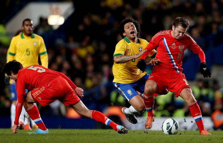 Capello kennir óþekkum áhorfanda um hvernig fór Óskar Ófeigur Jónsson skrifar 26. mars 2013 09:45 Kaka í leiknum. Mynd/Nordic Photos/Getty Fabio Capello, þjálfari rússneska landsliðsins, kennir óþekkum áhorfenda um að hans mönnum hafi ekki tekist að halda út á móti Brasilíu í vináttulandsleik á Stamford Bridge í gærkvöldi. Rússar voru nokkrum mínútum frá því að vinna sinn fyrsta sigur á Brasilíu síðan að Sovétríkin skiptust upp en Fred tryggði Brasilíumönnum 1-1 jafntefli á 90. mínútu leiksins en skömmu áður hafði einn af 35 þúsund áhorfendum leiksins fundið sér leið framhjá öryggisvörðum og komist inn á völlinn. Capello var ánægður með leikinn og úrslitin en taldi innáhlaup áhorfendans spilla einbeitingu leikmanna rússneska liðsins en atvikið gerðist rétt fyrir leikslok. „Ég er ánægður með hvernig við spiluðum og hvernig fór. Einu vonbrigðin eru að mínir menn misstu einbeitinguna eftir að áhorfandinn kom inn á völlinn. Það er ekki hægt á móti liði eins og Brasilíu," sagði Fabio Capello á vel sóttum blaðamannafundi eftir leikinn. Victor Faizulin kom Rússum í 1-0 þegar 17 mínútur voru til leiksloka en Fred jafnaði með sínum þriðja marki í þremur leikjum síðan að Luiz Felipe Scolari tók við. En hvað sagði Scolari þegar hann heyrði af ummælum Capello? „Þegar ég var þjálfari Portúgals og við vorum að spila við Eistland, þá hljóp mjög falleg berbrjósta kona inn á völlinn. Allir voru að horfa á hana og meira að segja ég. Þá var staðan 0-0 í leiknum en við unnum síðan 2-0. Ég veit ekki hvort þessi maður truflaði rússneska liðið en hver veit það getur alveg gerst," sagði Luiz Felipe Scolari í léttum tón. Fótbolti HM 2014 í Brasilíu Mest lesið Klúðraði gullgreininni sinni: „Ég er enn í áfalli“ Sport „Ég hélt ég myndi deyja“ Enski boltinn „Enginn vildi að ég myndi vinna“ Sport Fótboltaþjálfari og þrjú börn hans létust í jólafríinu Fótbolti Hetjuleg barátta dugði ekki gegn heimsmeisturunum Handbolti Dagskráin: Mini Doc stýrir Doczone, Lokasóknin og HM í pílu Sport Senda samúðarkveðjur eftir að nánir vinir Joshua létust í banaslysinu Sport Nottingham Forest vill fá að heyra samtöl dómaranna Enski boltinn Fór grátandi upp á sjúkrahús eftir fall stuttu fyrir ÓL Sport Þungarokkið þaut áfram en á eftir að kaupa afmælisgjöf handa konunni Sport Fleiri fréttir „Fróðari menn segja að maður eigi ekki að láta tilfinningarnar ráða“ Fótboltaþjálfari og þrjú börn hans létust í jólafríinu „Ég hélt ég myndi deyja“ Nottingham Forest vill fá að heyra samtöl dómaranna Ekki góð ferð til Rómarborgar í kvöld Heimamenn í ham og El Kaabi skoraði aftur með hjólhestaspyrnu Sarri gekkst undir hjartaaðgerð Vildi ekki láta undan pressu frá fjölmiðlamönnum Hvíldu Mo Salah en unnu samt riðilinn Beint frá Blikum til Boston í bandarísku deildinni Man Utd samdi við fyrrum liðsfélaga Glódísar Perlu hjá Bayern Gefur í skyn að Arsenal opni veskið í janúar „Einn mesti hugsuðurinn í boltanum“ Semenyo vill að allt verði klárt fyrir nýársdag „Knattspyrnustjórar eru ekki töframenn“ Segja að Wirtz græði á fjarveru Salah: „Sé hann fljúga í gang“ Hættir ekki fyrr en hann skorar þúsund mörk Skynjar stress hjá Arsenal Sjáðu frábært samspil Leeds og Gray tryggja Spurs sigurinn Ekkja Jota þakklát: „Hefur meiri þýðingu en orð geta lýst“ Hneysklaður á ósönnum orðrómum Enn kvarnast úr liði Blika Jafnt í stórleiknum Martínez skaut Inter á toppinn Jöfnuðu 128 ára gamalt met Mahrez tryggði Alsíringum sigur Gray hetja Tottenham Højlund með tvö og Napoli í annað sætið Calvert-Lewin skoraði í sjötta leiknum í röð Andy Carroll mætir fyrir dóm eftir að hafa verið handtekinn Sjá meira
