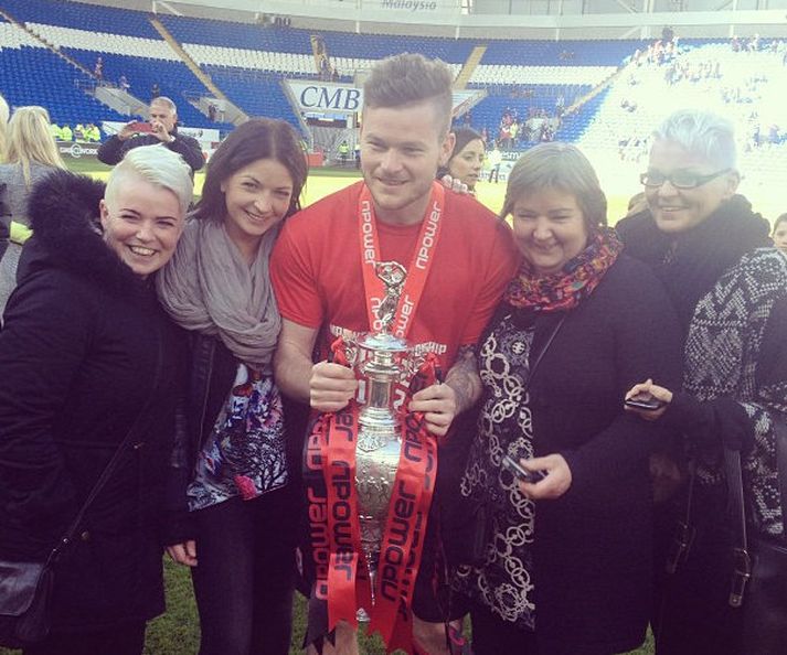 Cardiff lék í dag sinn síðasta heimaleik í ensku B-deildinni á tímabilinu og fékk meistarabikarinn afhendan í leikslok. Cardiff gerði 1-1 jafntefli við Bolton og lék Aron Einar Gunnarsson allan leikinn. Heiðar Helguson er þó frá vegna meiðsla. Fjölskylda Arons Einars var á vellinum í dag en á meðfylgjandi mynd er hann með móður sinni og systrum.