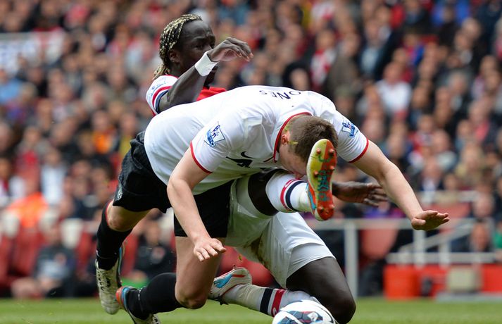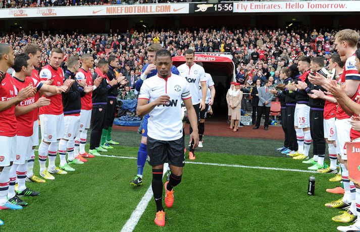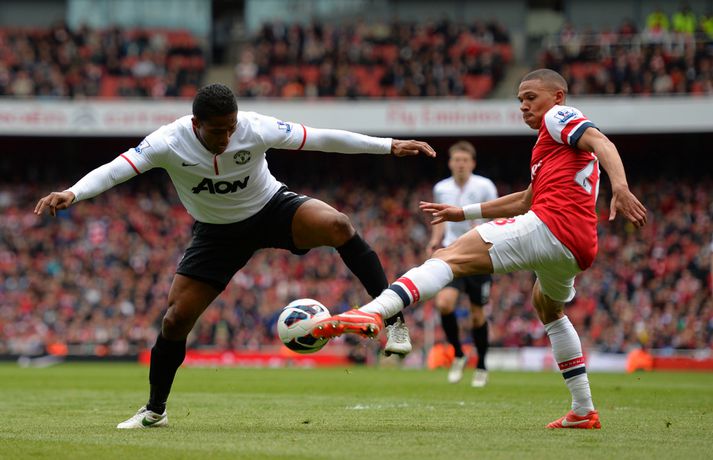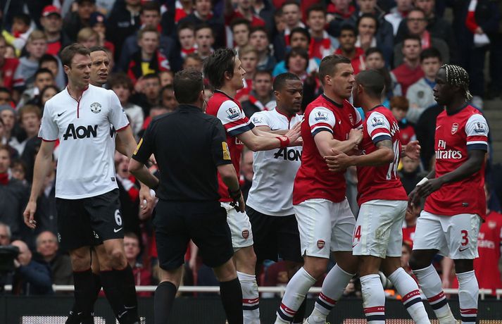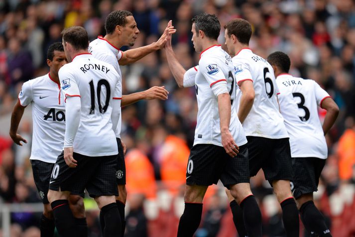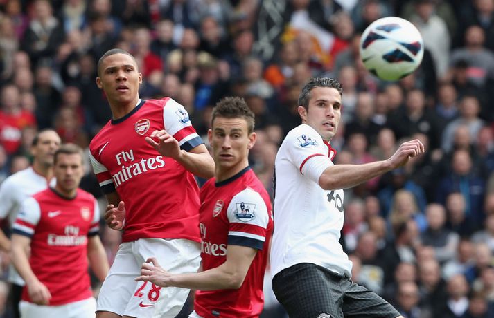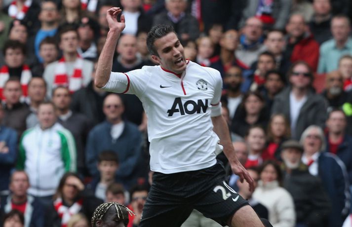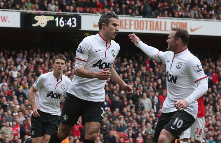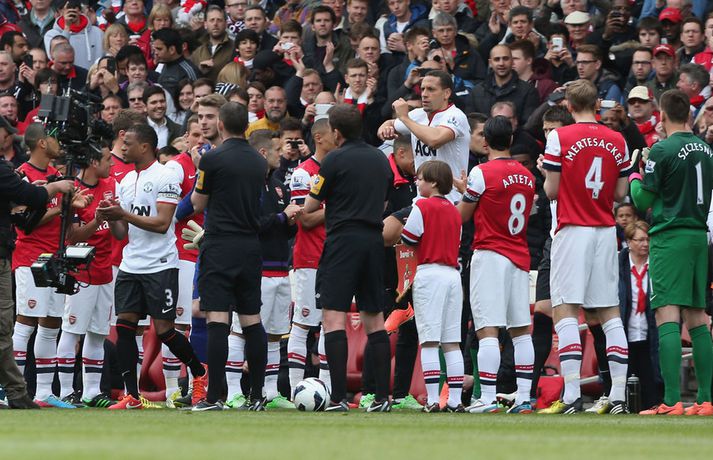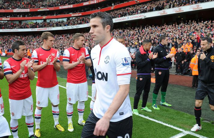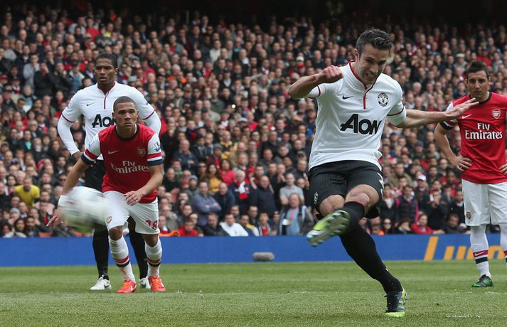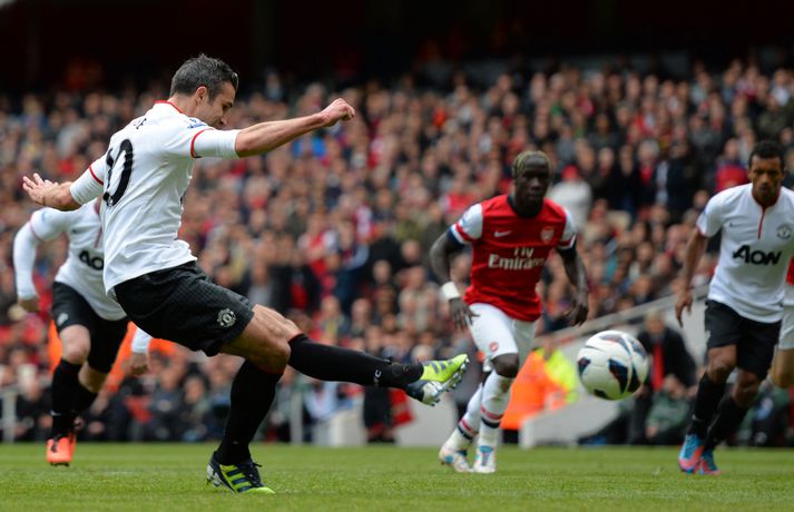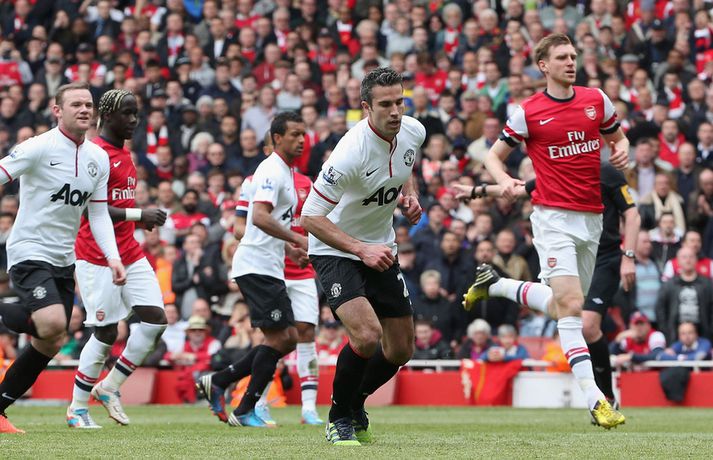Van Persie skoraði á gamla heimavellinum Stefán Árni Pálsson skrifar 28. apríl 2013 00:01 Nordic Photos / Getty Images Manchester United og Arsenal gerði 1-1 jafntefli á Emirates-vellinum í London í dag en Manchester United hafði tryggt sér Englandsmeistaratitilinn í byrjun vikunnar. Fyrsta mark leiksins kom eftir tæplega tveggja mínútna leik þegar Theo Walcott skoraði fínt mark eftir stungusendingu frá Tomás Rosický. Gestirnir náðu að jafna metin rétt fyrir lok fyrri hálfleiksins þegar Bacary Sagna braut á Robin van Persie innan vítateigs. Persie fór sjálfur á punktinn og skoraði af öryggi á sínum gamla heimavelli. Framherjinn fagnaði ekki markinu, enda fyrrum leikmaður Arsenal. Síðari hálfleikurinn var ekki jafn fjörugur og sá fyrri og hvorugt liðið náði að setja mark sitt á leikinn. Niðurstaðan því 1-1 jafntefli og því getur Manchester United ekki náð stigametinu af Chelsea á þessu tímabili. Liðið nær ekki að fara yfir 95 stiga múrinn en þeir hafa 85 stig þegar þrjár umferðir eru eftir. Arsenal er í fjórða sætinu með 64 stig, tveimur stigum á undan Tottenham sem er í því fimmta. Enski boltinn Mest lesið Lætur drauminn rætast og opnar kínverskan veitingastað Sport Fyrirliðinn áreitti dómara og mátti ekki spila lokaleikinn Fótbolti Sjáðu allt það besta úr enska boltanum á árinu 2025 Enski boltinn „Hann sér framtíðina fyrir sér hjá Napoli“ Fótbolti Fílabeinsstrendingar tryggðu toppsætið í uppbótartíma Fótbolti „Feginn að þú lifðir krabbameinið af svo þú gætir séð skítaliðið þitt fara niður“ Handbolti „Ég mun ekki keppa við Rússa á meðan stríð er í gangi“ Sport Mbappé þurfti að játa sig sigraðan Fótbolti Alveg sama um úrvalsdeildina og ætlar í veiði eftir HM Sport Segir Ísland eiga tvo af tíu bestu í heimi Handbolti Fleiri fréttir Sjáðu allt það besta úr enska boltanum á árinu 2025 Alls ekki síðasti leikur Semenyo Segir dómarana bara hafa verið að giska Sjáðu Arsenal rúlla yfir Villa og Úlfana ná í stig á Old Trafford Réttlætti Zirkzee-skiptinguna: „Stundum sækirðu betur með færri framherja“ Arsenal rústaði Villa og náði fimm stiga forskoti Neyðarlegt jafntefli United gegn Úlfunum Welbeck skoraði úr einu víti og brenndi af öðru Fékk á sig víti í mögulegum kveðjuleik „Þetta er rebbabragð sem ég vissi nú reyndar ekki að hann kynni“ Liðið sem gerir stólpagrín að xG Þjálfari Liverpool í föstum leikatriðum látinn fara „Fróðari menn segja að maður eigi ekki að láta tilfinningarnar ráða“ „Ég hélt ég myndi deyja“ Nottingham Forest vill fá að heyra samtöl dómaranna Vildi ekki láta undan pressu frá fjölmiðlamönnum Man Utd samdi við fyrrum liðsfélaga Glódísar Perlu hjá Bayern Gefur í skyn að Arsenal opni veskið í janúar „Einn mesti hugsuðurinn í boltanum“ Semenyo vill að allt verði klárt fyrir nýársdag „Knattspyrnustjórar eru ekki töframenn“ Segja að Wirtz græði á fjarveru Salah: „Sé hann fljúga í gang“ Skynjar stress hjá Arsenal Sjáðu frábært samspil Leeds og Gray tryggja Spurs sigurinn Ekkja Jota þakklát: „Hefur meiri þýðingu en orð geta lýst“ Jöfnuðu 128 ára gamalt met Gray hetja Tottenham Calvert-Lewin skoraði í sjötta leiknum í röð Andy Carroll mætir fyrir dóm eftir að hafa verið handtekinn Villa kvartar til Chelsea vegna flösku sem flaug á bekkinn Sjá meira