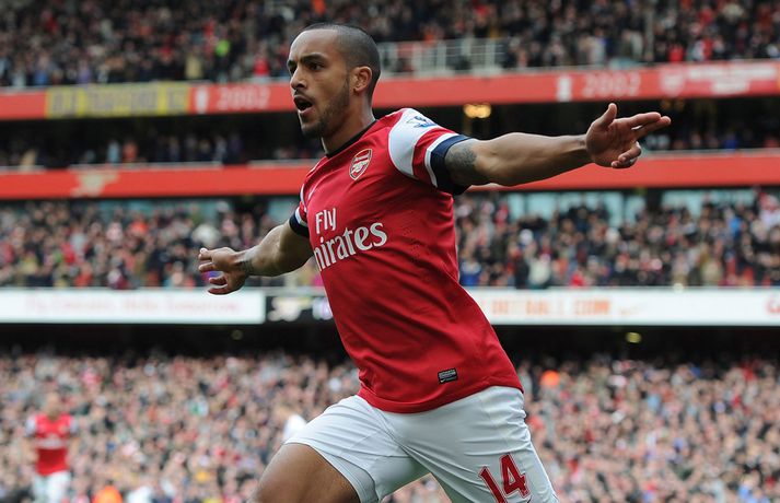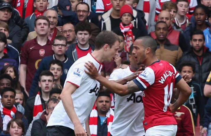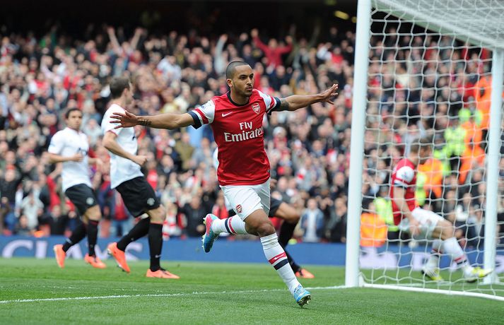 Manchester United og Arsenal gerði 1-1 jafntefli á Emirates-vellinum í London í dag en Manchester United hafði tryggt sér Englandsmeistaratitilinn í byrjun vikunnar. Fyrsta mark leiksins kom eftir tæplega tveggja mínútna leik þegar Theo Walcott skoraði fínt mark eftir stungusendingu frá Tomás Rosický. Gestirnir náðu að jafna metin rétt fyrir lok fyrri hálfleiksins þegar Bacary Sagna braut á Robin van Persie innan vítateigs. Persie fór sjálfur á punktinn og skoraði af öryggi á sínum gamla heimavelli. Framherjinn fagnaði ekki markinu, enda fyrrum leikmaður Arsenal. Síðari hálfleikurinn var ekki jafn fjörugur og sá fyrri og hvorugt liðið náði að setja mark sitt á leikinn. Niðurstaðan því 1-1 jafntefli og því getur Manchester United ekki náð stigametinu af Chelsea á þessu tímabili. Liðið nær ekki að fara yfir 95 stiga múrinn en þeir hafa 85 stig þegar þrjár umferðir eru eftir. Arsenal er í fjórða sætinu með 64 stig, tveimur stigum á undan Tottenham sem er í því fimmta.