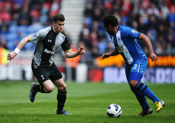 Sjálfsmark kom Tottenham til bjargar | Þrjú rauð á St. Mary's Eiríkur Stefán Ásgeirsson skrifar 27. apríl 2013 01:25 Nordic Photos / Getty Images Tottenham gaf eftir í baráttunni um Meistaradeildarsæti í ensku úrvalsdeildinni í dag en bjargaði þó jafntefli gegn Wigan. Alls er fjórum leikjum nú nýlokið í deildinni en Everton vann góðan sigur á Fulham, 1-0, og er nú aðeins tveimur stigum á eftir Tottenham í fimmta sætinu. Stoke hafði betur gegn Norwich, 1-0, og þá vann West Brom 3-0 útisigur á Southampton þar sem þrjú rauð spjöld fóru á loft.Wigan - Tottenham 2-2 0-1 Gareth Bale (9.) 1-1 Emmerson Boyce (11.) 2-1 Callum McManaman (49.) 2-2 Emmerson Boyce, sjálfsmark (89.). Wigan hefði komist upp úr fallsæti með sigri á Tottenham í dag en liðið er nú tveimur stigum frá öruggu sæti. Það byrjaði þó ekki vel fyrir Wigan því liðið gaf hreinlega Tottenham 1-0 forystu. Maynor Figueroa gaf boltann aftur á markvörðinn Joel Robles sem reyndi að hreinsa frá marki. Hann sparkaði þó beint í Gareth Bale en af honum fór boltinn í markið. Emmerson Boyce var þó aðeins tvær mínútur að jafna metin fyrir Wigan þegar hann skoraði með skalla á elleftu mínútu og Callum McManaman kom liðinu yfir með fallegu skoti í upphafi síðari hálfleiks. Allt leit út fyrir að Wigan myndi vinna góðan sigur þegar að sjálfsmarkið kom. Aaron Lennon á sendingu fyrir markið og varð Boyce fyrir því óláni að senda knöttinn í eigið net úr þvögunni. Tottenham fékk svo tækifæri til að skora í uppbótartíma en allt kom fyrir ekki. Gylfi Þór Sigurðsson var allan leikinn á varamannabekk Tottenham.Everton - Fulham 1-0 1-0 Steven Pienaar (16.) Steven Pienaar skoraði sigurmark Everton gegn Fulham í dag en það gerði hann eftir fyrirgjöf Seamus Coleman. Fulham hefur nú tapað fjórum af síðustu fimm leikjum sínum í deildinni. Aðeins fjögur stig skilja að liðin í 3.-6. sæti en fjögur efstu liðin komast í Meistaradeildina.Southampton - West Brom 0-3 0-1 Marc-Antoione Fortune (6.) 0-2 Romelu Lukaku (67.) 0-3 Shane Long (77.) West Brom vann sinn fyrsta sigur síðan í byrjun síðasta mánaðar er liðið gerði góða ferð á St. Mary's-leikvanginn í Southampton. Þrjú rauð spjöld fóru á loft. Gaston Ramirez kom inn á sem varamaður og fékk að líta rautt í stöðunni 2-0. Stuttu síðar fór Fortune sömu leið. Danny Fox, leikmaður Southampton, fékk svo rautt fyrir tveggja fóta tæklingu á Steven Reid undir lok leiksins.Stoke - Norwich 1-0 1-0 Charlie Adam (46.) Charlie Adam tryggði Stoke 1-0 sigur á Norwich og er nú með 40 stig. Norwich er í fjórtánda sæti með 38 stig - sex stigum frá fallsæti. Enski boltinn Mest lesið Segir Ísland eiga tvo af tíu bestu í heimi Handbolti Neyðarlegt jafntefli United gegn Úlfunum Enski boltinn „Feginn að þú lifðir krabbameinið af svo þú gætir séð skítaliðið þitt fara niður“ Handbolti Arsenal rústaði Villa og náði fimm stiga forskoti Enski boltinn Farin frá Braga eftir aðeins hálft ár Fótbolti Býst núna við því versta frá áhorfendum Sport Gleymdi Íslendingurinn fékk loks að spila: „Ég er ekki vitlaus“ Fótbolti Jordan lagði NASCAR Sport Klúðraði gullgreininni sinni: „Ég er enn í áfalli“ Sport Réttlætti Zirkzee-skiptinguna: „Stundum sækirðu betur með færri framherja“ Enski boltinn Fleiri fréttir Sjáðu allt það besta úr enska boltanum á árinu 2025 Alls ekki síðasti leikur Semenyo Segir dómarana bara hafa verið að giska Sjáðu Arsenal rúlla yfir Villa og Úlfana ná í stig á Old Trafford Réttlætti Zirkzee-skiptinguna: „Stundum sækirðu betur með færri framherja“ Arsenal rústaði Villa og náði fimm stiga forskoti Neyðarlegt jafntefli United gegn Úlfunum Welbeck skoraði úr einu víti og brenndi af öðru Fékk á sig víti í mögulegum kveðjuleik „Þetta er rebbabragð sem ég vissi nú reyndar ekki að hann kynni“ Liðið sem gerir stólpagrín að xG Þjálfari Liverpool í föstum leikatriðum látinn fara „Fróðari menn segja að maður eigi ekki að láta tilfinningarnar ráða“ „Ég hélt ég myndi deyja“ Nottingham Forest vill fá að heyra samtöl dómaranna Vildi ekki láta undan pressu frá fjölmiðlamönnum Man Utd samdi við fyrrum liðsfélaga Glódísar Perlu hjá Bayern Gefur í skyn að Arsenal opni veskið í janúar „Einn mesti hugsuðurinn í boltanum“ Semenyo vill að allt verði klárt fyrir nýársdag „Knattspyrnustjórar eru ekki töframenn“ Segja að Wirtz græði á fjarveru Salah: „Sé hann fljúga í gang“ Skynjar stress hjá Arsenal Sjáðu frábært samspil Leeds og Gray tryggja Spurs sigurinn Ekkja Jota þakklát: „Hefur meiri þýðingu en orð geta lýst“ Jöfnuðu 128 ára gamalt met Gray hetja Tottenham Calvert-Lewin skoraði í sjötta leiknum í röð Andy Carroll mætir fyrir dóm eftir að hafa verið handtekinn Villa kvartar til Chelsea vegna flösku sem flaug á bekkinn Sjá meira