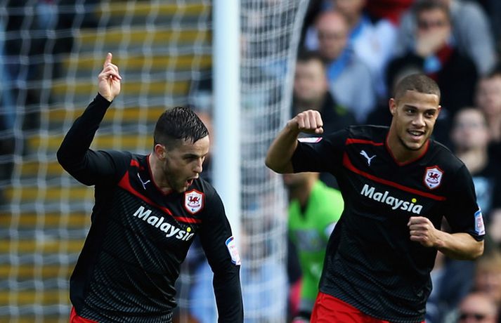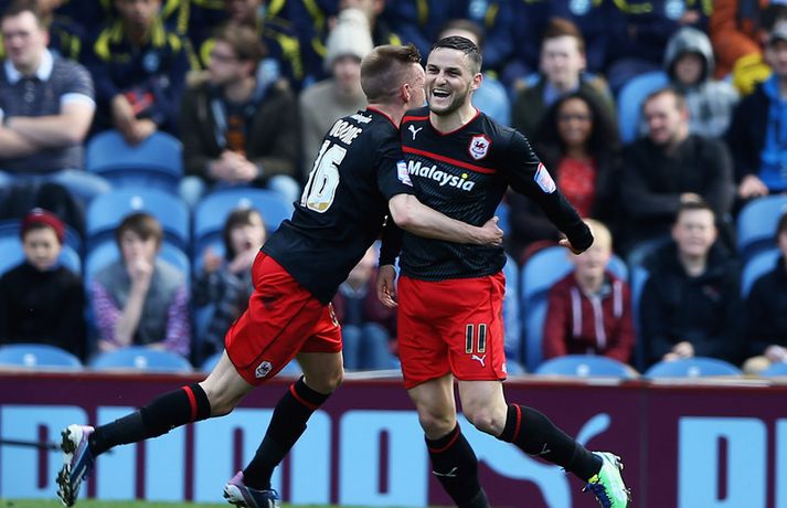 Aron Einar og Heiðar deildarmeistarar Kolbeinn Tumi Daðason skrifar 20. apríl 2013 00:20 Stuðningsmenn Cardiff fögnuðu sæti í ensku úrvalsdeildinni á miðvikudag. Nordicphotos/Getty Cardiff tryggði sér í dag deildarmeistaratitilinn í Championship-deildinni með 1-1 jafntefli gegn Burnley á Turf Moor. Aron Einar Gunnarsson lék allan leikinn með Cardiff. Craig Conway kom gestunum frá Wales yfir með fínu skoti á 27. mínútu. Þannig stóðu leikar allt þar til komið var fram í viðbótartíma. David Edgar skallaði þá boltann í netið af stuttu færi og tryggði heimamönnum stig við mikinn fögnuð stuðningsmanna Burnley. Heimaliðið styrkti stöðu sína í botnbaráttunni með stiginu. Cardiff hefur nú sjö stiga forskot á Hull þegar tvær umferðir eru eftir. Enski boltinn Tengdar fréttir Ákvað að sleppa mér alveg Aron Einar Gunnarsson og félagar í Cardiff tryggðu sér sæti í ensku úrvalsdeildinni á næstu leiktíð í vikunni. Landsliðsfyrirliðinn hefur aldrei leikið betur og segist tilbúinn að spila fótbolta með þeim bestu. 20. apríl 2013 06:00 Mest lesið „Feginn að þú lifðir krabbameinið af svo þú gætir séð skítaliðið þitt fara niður“ Handbolti Farin frá Braga eftir aðeins hálft ár Fótbolti Segir dómarana bara hafa verið að giska Enski boltinn Mest lesið í innlenda sportinu: Danskar bullur, oddaleikur á Króknum og miskátir hlauparar Sport „Mér var bara tjáð að þeir ætluðu að leita eitthvað annað“ Íslenski boltinn Alveg sama um úrvalsdeildina og ætlar í veiði eftir HM Sport Réttlætti Zirkzee-skiptinguna: „Stundum sækirðu betur með færri framherja“ Enski boltinn Neyðarlegt jafntefli United gegn Úlfunum Enski boltinn Alls ekki síðasti leikur Semenyo Enski boltinn Segir Ísland eiga tvo af tíu bestu í heimi Handbolti Fleiri fréttir Alls ekki síðasti leikur Semenyo Segir dómarana bara hafa verið að giska Sjáðu Arsenal rúlla yfir Villa og Úlfana ná í stig á Old Trafford Réttlætti Zirkzee-skiptinguna: „Stundum sækirðu betur með færri framherja“ Arsenal rústaði Villa og náði fimm stiga forskoti Neyðarlegt jafntefli United gegn Úlfunum Welbeck skoraði úr einu víti og brenndi af öðru Fékk á sig víti í mögulegum kveðjuleik „Þetta er rebbabragð sem ég vissi nú reyndar ekki að hann kynni“ Liðið sem gerir stólpagrín að xG Þjálfari Liverpool í föstum leikatriðum látinn fara „Fróðari menn segja að maður eigi ekki að láta tilfinningarnar ráða“ „Ég hélt ég myndi deyja“ Nottingham Forest vill fá að heyra samtöl dómaranna Vildi ekki láta undan pressu frá fjölmiðlamönnum Man Utd samdi við fyrrum liðsfélaga Glódísar Perlu hjá Bayern Gefur í skyn að Arsenal opni veskið í janúar „Einn mesti hugsuðurinn í boltanum“ Semenyo vill að allt verði klárt fyrir nýársdag „Knattspyrnustjórar eru ekki töframenn“ Segja að Wirtz græði á fjarveru Salah: „Sé hann fljúga í gang“ Skynjar stress hjá Arsenal Sjáðu frábært samspil Leeds og Gray tryggja Spurs sigurinn Ekkja Jota þakklát: „Hefur meiri þýðingu en orð geta lýst“ Jöfnuðu 128 ára gamalt met Gray hetja Tottenham Calvert-Lewin skoraði í sjötta leiknum í röð Andy Carroll mætir fyrir dóm eftir að hafa verið handtekinn Villa kvartar til Chelsea vegna flösku sem flaug á bekkinn Sjáðu magnaða vörslu Raya: „Þetta var stórkostlegt“ Sjá meira