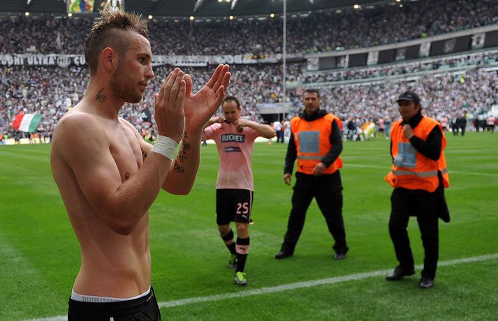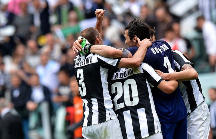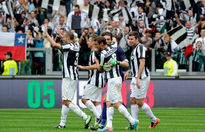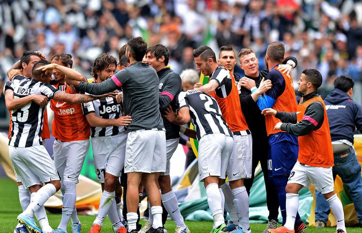 Juventus ítalskur meistari í 29. sinn Óskar Ófeigur Jónsson skrifar 5. maí 2013 21:53 Mynd/NordicPhotos/Getty Juventus tryggði sér í dag ítalska meistaratitilinn annað árið í röð með því að vinna 1-0 sigur á Palermo. Þetta er 29. meistaratitilinn félagsins frá upphafi. Juventus er með fjórtán stiga forskot á Napoli þegar aðeins þrjár umferðir eru eftir. Liðið hefur unnið 26 af 35 leikjum og aðeins tapað fjórum. Juventus varð meistari 2005 og 2006 en missti báða titlana þegar hneykslismálið mikla kom upp þar sem félagið flæktist inni í umsvifamikið net þar sem úrslitum margra leikja á Ítalíu var hagrætt. Stuðningsmenn félagsins telja þá titla samt enn með og mátti sjá borða á lofti þar sem þeir fögnuðu 31. meistaratitlinum. Arthur Vidal skoraði sigurmarkið úr vítaspyrnu á 59. mínútu leiksins en vítið fiskaði Mirko Vucinic. Antonio Conte, þjálfari Juventus, var kátur í leikslok. „Þetta hefur verið mikil glæsiför að titlinum. Við erum ánægðir og stoltir. Strákarnir eiga allan heiðurinn skilinn því þeir hafa verið magnaðir allt þetta tímabil. Ég er stoltur af þeim því það var ekki auðvelt að vinna titilinn aftur," sagði Antonio Conte en liðið hefur orðið meistari á tveimur fyrsti tímabilum hans sem þjálfari. Conte vann titilinn fimm sinnum sem leikmaður Juve. Ítalski boltinn Mest lesið Hættur aðeins þrítugur Golf Sjáðu geggjaðan snúning Alberts áður en hann skoraði frábært mark Fótbolti Bunting dró orð sín til baka með tárin í augunum: „Ég er ekki meistari fólksins“ Sport Sakaður um svindl á HM í pílukasti Sport Táningur fær mikið hrós fyrir viðbrögð sín þegar mótherji missti meðvitund Fótbolti Afkáralegt fagn hjá hetju Sambíu Fótbolti Steraleikarnir segi ungu fólki að það sé aldrei nógu fullkomið Sport Áfallið staðreynd og Isak búinn í aðgerð Enski boltinn Áhorfendur ærðust eftir mögulega mark mótsins í fyrsta leik Fótbolti Klappstýrur Björgvins Karls slógu í gegn Sport Fleiri fréttir Áfallið staðreynd og Isak búinn í aðgerð Neres hetja Napoli í Sádi-Arabíu Aron Einar lagði upp dýrmætt sigurmark Afkáralegt fagn hjá hetju Sambíu Glódís Perla veik í jólafríið en enn taplaus Glódís og Hákon best í fótboltanum á árinu Frelsaði fjárfestirinn Dani Alves gefur sjálfum sér samning Fagnaði titli Liverpool sem óður maður um alla borg Mbappé breytti um fagn af góðu tilefni „Allir virðast elska hann“ Meira en 37 stöðugildi hjá Knattspyrnusambandi Íslands Táningur fær mikið hrós fyrir viðbrögð sín þegar mótherji missti meðvitund „Þetta mun ekki buga okkur“ Guardiola mun vigta leikmenn Man City eftir jólin „Ef þið væruð Antoine Semenyo, hvert mynduð þið fara?“ Freyr himinlifandi með íslensku strákana Sjáðu geggjaðan snúning Alberts áður en hann skoraði frábært mark Óskar Hrafn um komu Arnórs Ingva: „Gífurlega dýrmætt fyrir KR“ Áhorfendur ærðust eftir mögulega mark mótsins í fyrsta leik Sjáðu mörkin: Rogers sá um Manchester United Hleður Kjartan lofi eftir frábæra frumraun með Aberdeen Óttast að Isak hafi fótbrotnað Túfa gerir þriggja ára samning í Svíþjóð Arnór Ingvi orðinn leikmaður KR Albert skoraði í fyrsta sigri Fiorentina Bæjarar aftur á sigurbraut Tvenna frá Rogers tryggði Villa sigur gegn Manchester United Barcelona með fjögurra stiga forskot inn í nýtt ár Alvöru innkoma: Kjartan með stoðsendingu gegn Celtic í sínum fyrsta leik Sandra María hetjan og með þeim markahæstu í Þýskalandi Sjá meira