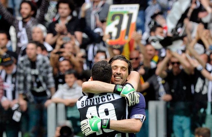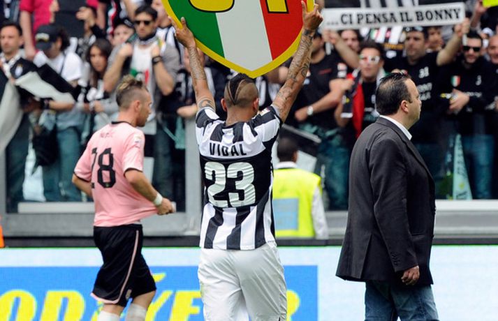 Juventus tryggði sér í dag ítalska meistaratitilinn annað árið í röð með því að vinna 1-0 sigur á Palermo. Þetta er 29. meistaratitilinn félagsins frá upphafi. Juventus er með fjórtán stiga forskot á Napoli þegar aðeins þrjár umferðir eru eftir. Liðið hefur unnið 26 af 35 leikjum og aðeins tapað fjórum. Juventus varð meistari 2005 og 2006 en missti báða titlana þegar hneykslismálið mikla kom upp þar sem félagið flæktist inni í umsvifamikið net þar sem úrslitum margra leikja á Ítalíu var hagrætt. Stuðningsmenn félagsins telja þá titla samt enn með og mátti sjá borða á lofti þar sem þeir fögnuðu 31. meistaratitlinum. Arthur Vidal skoraði sigurmarkið úr vítaspyrnu á 59. mínútu leiksins en vítið fiskaði Mirko Vucinic. Antonio Conte, þjálfari Juventus, var kátur í leikslok. „Þetta hefur verið mikil glæsiför að titlinum. Við erum ánægðir og stoltir. Strákarnir eiga allan heiðurinn skilinn því þeir hafa verið magnaðir allt þetta tímabil. Ég er stoltur af þeim því það var ekki auðvelt að vinna titilinn aftur," sagði Antonio Conte en liðið hefur orðið meistari á tveimur fyrsti tímabilum hans sem þjálfari. Conte vann titilinn fimm sinnum sem leikmaður Juve.
