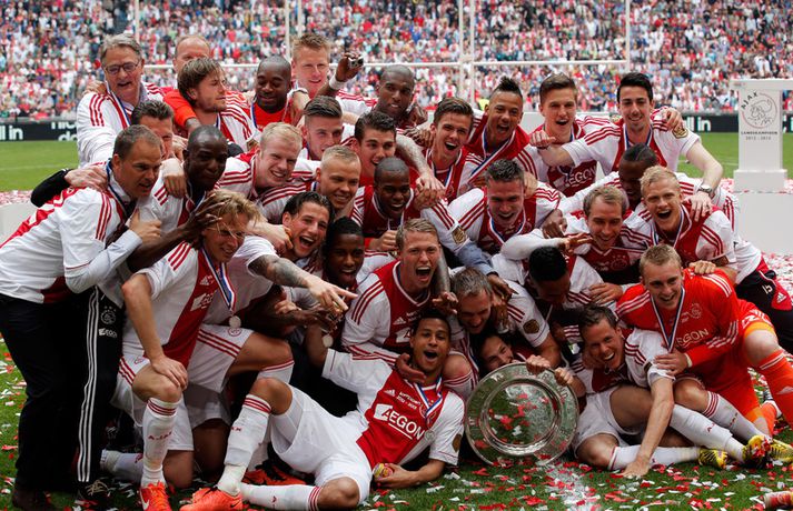 Kolbeinn Sigþórsson varð í dag hollenskur meistari með félögum sínum í Ajax en liðið tryggði sér titilinn með því að bursta lið Willem II 5-0 á heimavelli. Kolbeinn byrjaði markaveisluna með því að skora fyrsta markið í leiknum. Kolbeinn hefur skorað fimm mörk í síðustu átta leikjum liðsins en hann skoraði markið sitt með laglegum skalla strax á 12. mínútu leiksins. Það var mikil gleði í leikslok þegar Ajax-menn tóku við meistaraskildinum en Kolbeinn hefur nú orðið meistari á fyrstu tveimur árum sínum hjá félaginu. Hann hefur missti úr mikið vegna meiðsla bæði tímabilin en hefur skorað reglulega þegar hann er heill. Hér fyrir ofan má sjá bæði ljósmyndir af Kolbeini og félögum hans fagna titlinum í dag sem og svipmyndir frá leiknum í dag.