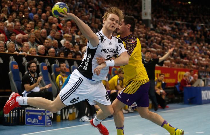 Aron Pálmarsson varð Þýskalandsmeistari í þriðja sinn með Kiel í gærkvöldi þegar liðið vann sannfærandi 31-25 sigur á Rhein-Neckar Löwen og Kiel búið að tryggja sér titilinn þrátt fyrir að liðið eigi þrjá deildarleiki eftir. Aron ákvað að halda upp á kvöldið með því að birta mynd af hundinum sínum á fésbókarsíðu sinni. Aron gerði meira en það því hann var búinn að klæða hann upp í búning Kiel sem var að sjálfsögðu merktur Aroni og með númerinu 24 á bakinu. Forráðamenn Kiel vöktu athygli á uppátæki Arons í frétt á heimasíðu félagsins sem var annars uppfull af sigurgleði leikmanna Kiel frá því í gærkvöldi. „Það er frábært að við séum orðnir meistarar í maí því núna getum við farið að einbeita okkur að Meistaradeildinni og að ná öðrum titli í hús í júní," sagði Aron Pálmarsson í viðtali við Kieler Nachrichten. Aron skoraði tvö mörk í leiknum og hefur þar með skorað 72 deildarmörk á tímabilinu eða 2,8 mörk að meðaltali í leik. Hann varð einnig meistari með Kiel 2010 og 2012.