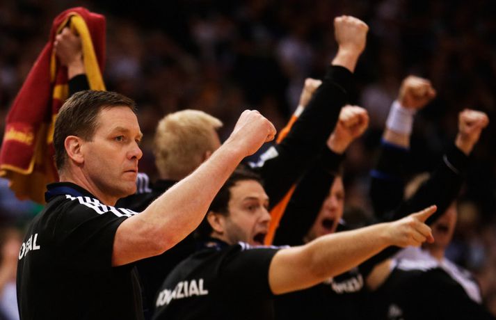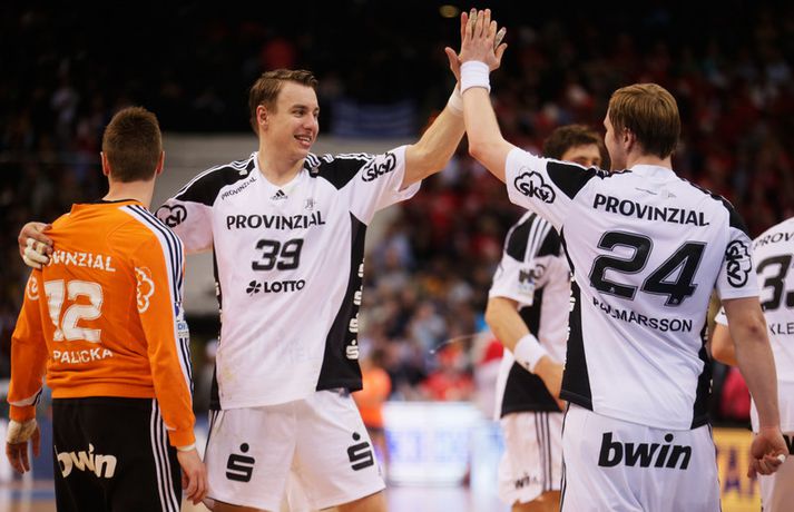 Alfreð, Aron og Guðjón Valur þýskir meistarar með Kiel Óskar Ófeigur Jónsson skrifar 14. maí 2013 19:41 Mynd/Nordic Photos/Bongarts Kiel tryggði sér í kvöld þýska meistaratitilinn í handbolta eftir sannfærandi sex marka sigur á heimavelli á móti Guðmundi Guðmundssyni og lærisveinum hans í Rhein-Neckar Löwen, 31-25. Kiel er með fimm stiga forskot á Löwen sem er í 2. sætinu en Löwen-liðið á aðeins tvo leiki eftir og getur því ekki náð Kiel. Það var ekki að sjá að þarna væru tvö efstu lið deildarinnar að mætast. Guðjón Valur Sigurðsson skoraði 3 mörk í leiknum og Aron Pálmarsson skoraði tvö mörk. Guðjón Valur varð í kvöld þýskur meistari í fyrsta sinn á ferlinum en Aron var að vinna titilinn í þriðja sinn. Stefán Rafn Sigurmannsson skoraði tvö mörk fyrir Löwen en Alexander Petersson komst ekki á blað. Kiel hefur unnið 27 af 31 leik sínum á leiktíðinni og þetta var sjötti deildarsigur liðsins í röð. Kiel vann einnig þýska bikarinn og er komið í úrslit í Meistaradeildinni. Það stefnir því í enn eitt frábært tímabil hjá Alfreð Gíslasyni og lærisveinum hans. Alfreð var búinn að kveikja vel í sínum mönnum því Kiel gaf tóninn strax í byrjun og komst í 3-0 á fyrstu sex mínútunum. Kiel fór illa með Löwen-liðið allan hálfleikinn og bauð upp á kennslustund í handbolta. Kiel náði mest ellefu marka forskot í seinni hálfeik en Rhein-Neckar Löwen lagaði stöðuna á lokakaflanum. Aron Pálmarsson skoraði fyrsta mark leiksins en Guðjón Valur Sigurðsson var með þrjú mörk í fyrri hálfleiknum sem Kiel vann 15-7. Aron bætti einu marki við í seinni hálfleik en þá fékk Guðjón Valur ekkert að spila. Marko Vujin var markahæstur hjá Kiel með sex mörk. Kiel er að vinna titilinn annað árið og í fjórða sinn undir stjórn Alfreðs sem tók við liðinu sumarið 2008. Kiel hefur alls orðið þýskur meistari 18 sinnum þar af fimmtán sinnum frá árinu 1994. Mest lesið Besta sætið um Ómar: Væri búið að heyrast eitthvað ef þetta væri Aron eða Óli Handbolti „Ég er að fara aftur til Svíþjóðar“ Handbolti Össur gagnrýndi fýlulegar og miskunnarlausar spurningar Loga Handbolti Sjáðu myndirnar: Beygðir en ekki brotnir á bóndadegi Handbolti Sonur Wayne Rooney spilaði á Old Trafford Enski boltinn Náðu loksins Ólympíufaranum á lista FBI yfir hættulegustu glæpamennina Sport „Börnin mín fengu mig til að hætta með reiðiköstin“ Fótbolti Jói Berg vill draga úr auglýsingaflóðinu í kringum handboltann Handbolti Skýrsla Vals: Ekki aftur Handbolti Vill umræðu um sniðgöngu HM vegna Trump Fótbolti Fleiri fréttir Anton og Jónas dæma mikilvægan leik hjá Alfreð Jói Berg vill draga úr auglýsingaflóðinu í kringum handboltann Besta sætið um Ómar: Væri búið að heyrast eitthvað ef þetta væri Aron eða Óli Sjáðu myndirnar: Beygðir en ekki brotnir á bóndadegi Svíar voru fljótir að snúa við blaðinu í seinni hálfleik „Ég er að fara aftur til Svíþjóðar“ Skýrsla Vals: Ekki aftur Össur gagnrýndi fýlulegar og miskunnarlausar spurningar Loga Ungverjar með magnaða endurkomu en hvorugt náði Íslandi að stigum EM í dag: Ísland fer alltaf Krýsuvíkurleiðina „Náðum ekki að hjálpa markvörðunum okkar nóg“ „Þeir spila hægan bolta og reyna að svæfa mann“ „Þetta er klárlega högg“ Aron Kristjáns tapaði líka með minnsta mun Einkunnir Strákanna okkar á móti Króatíu: Basl á Bóndadaginn „Fannst við stýra leiknum vel og láta þetta fara í okkar átt“ „Tveggja ára barn að labba við sundlaugarbakkann og enginn gerði neitt“ Tölurnar á móti Króatíu: 15-1 fyrir Króata í mörkum með langskotum „Þurfum við ekki að fá fleiri varða bolta?“ Botna ekkert í Snorra: „Við erum teknir í bólinu“ Þorsteinn inn en Andri og Elvar fyrir utan Myndir: Fjölskyldustemning í Fan Zone Elvar úr leik í átta vikur: „Hans verður sárt saknað“ Líkur Íslands á verðlaunum hafa snaraukist „Hann gæti gert fullt af sóknum léttari“ Ómar segist eiga meira inni Svona var EM-Pallborðið: Allt sem þarf að vita fyrir stórleikinn í dag Uppgjörið: Ísland - Króatía 29-30 | Aftur súrt tap gegn Króötunum hans Dags „Ef ég hitti Dag þá mun ég knúsa hann“ „Virkar eins og maður sé að væla“ Sjá meira