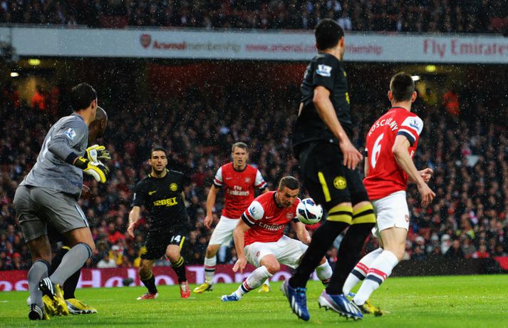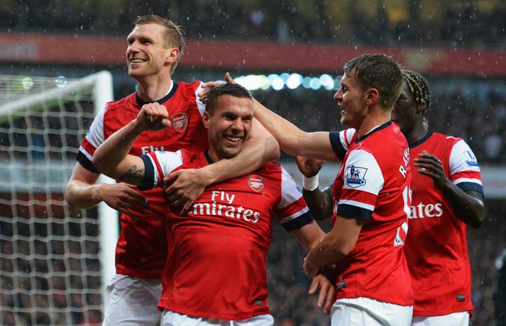 Arsenal felldi bikarmeistarana Óskar Ófeigur Jónsson skrifar 14. maí 2013 18:15 Mynd/Nordic Photos/Getty Arsenal felldi nýkrýnda bikarmeistara Wigan með því að vinna þá 4-1 á Emirates-leikvanginum í kvöld en Wigan-menn urðu að vinna til þess að eiga möguleika á því að bjarga sér í lokaumferðinni. Lukas Podolski skoraði tvö mörk fyrir Arsenal og Santi Cazorla átti þrjár stoðsendingar. Sigurinn var afar mikilvægur fyrir Arsenal-liðið sem komst aftur upp fyrir Tottenham og í 4. sætið. Arsenal getur þar með tryggt sér sæti í Meistaradeildinni með sigri á Newcastle í lokaumferðinni en Gylfi Þór Sigurðsson og félagar í Tottenham þurfa bæði að vinna sinn leik og treysta á það að Arsenal tapi stigum. Wigan Athletic er hinsvegar fallið úr deildinni ásamt Queens Park Rangers og Reading og það verður því engin fallbarátta í gangi í lokaumferðinni. Wigan var búið að vera í úrvalsdeildinni frá árinu 2005. Lukas Podolski kom Arsenal í 1-0 á 11. mínútu eftir sofandahátt í Wigan-vörnni. Podolski fékk boltann í markteignum og skallaði hann í markið eftir að hornspyrna Santi Cazorla sigldi í gegn hóp varnarmanna Wigan. Wigan tókst hinsvegar að jafna á lokamínútu fyrri hálfleiks þegar Shaun Maloney skoraði beint úr aukaspyrnu. Wojciech Szczesny komst í boltann en tókst ekki að bjarga marki. Theo Walcott kom Arsenal aftur yfir á 63. mínútu eftir frábæra sendingu Santi Cazorla og þá var eins og Wigan-liðið brotnaði því Arsenal skoraði tvö mörk til viðbótar á næstu átta mínútum. Lukas Podolski skoraði þriðja markið á 68. mínútu eftir að Cazorla skallaði boltann inn fyrir vörnina og Aaron Ramsey skoraði síðan fjórða markið á 71. mínútu eftir stoðsendingu frá Kieran Gibbs.Staðan í ensku úrvalsdeildinni. Enski boltinn Mest lesið Sumir hneykslast á hegðun heimsmeistarans Sport Mourinho grætti Cristiano Ronaldo í klefanum Fótbolti Van Veen síðastur inn í undanúrslit: „Hætti ekki að brosa næstu 24 tímana“ Sport Giftu sig á gamlársdag Handbolti Áfall fyrir Heimi Hallgríms og drauminn um að komast á HM Fótbolti Varar íþróttafólk við ákveðinni tegund áfengis Sport Kemst bakdyramegin inn í sína bestu grein á Ólympíuleikunum Sport „Mjög svekkjandi“ Enski boltinn Arsenal græddi á mistökum dómarans í 1-0 sigrinum á Everton Enski boltinn Sunderland hjálpaði Arsenal með því að taka stig af Man. City Enski boltinn Fleiri fréttir Sunderland hjálpaði Arsenal með því að taka stig af Man. City „Mjög svekkjandi“ Líklegast að Chelsea ráði stjóra Strassborg Fyrsta mark Mateta í langan tíma dugði ekki Palace til að taka öll stigin Bitlausir meistarar byrjuðu árið á því að tapa stigum á heimavelli Arsenal græddi á mistökum dómarans í 1-0 sigrinum á Everton Sjáðu Mateta skora fyrsta mark ársins 2026 Biðin mikla hjá Unai Emery tók aðeins nokkrar sekúndur Tók báða Íslendingana út af í hálfleik „Ekki jólin sem ég bjóst við“ Andri Lucas missti af þriðja leiknum í röð og áfram markaleysi án hans Aganefndin í fríi og Romero fær að spila í dag Chelsea búið að reka Enzo Maresca Slá því upp að Maresca gæti verið rekinn frá Chelsea í dag Hvað á Liverpool að gera með Mo Salah og Alexander Isak? Sjáðu allt það besta úr enska boltanum á árinu 2025 Alls ekki síðasti leikur Semenyo Segir dómarana bara hafa verið að giska Sjáðu Arsenal rúlla yfir Villa og Úlfana ná í stig á Old Trafford Réttlætti Zirkzee-skiptinguna: „Stundum sækirðu betur með færri framherja“ Arsenal rústaði Villa og náði fimm stiga forskoti Neyðarlegt jafntefli United gegn Úlfunum Welbeck skoraði úr einu víti og brenndi af öðru Fékk á sig víti í mögulegum kveðjuleik „Þetta er rebbabragð sem ég vissi nú reyndar ekki að hann kynni“ Liðið sem gerir stólpagrín að xG Þjálfari Liverpool í föstum leikatriðum látinn fara „Fróðari menn segja að maður eigi ekki að láta tilfinningarnar ráða“ „Ég hélt ég myndi deyja“ Nottingham Forest vill fá að heyra samtöl dómaranna Sjá meira