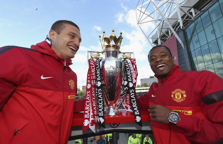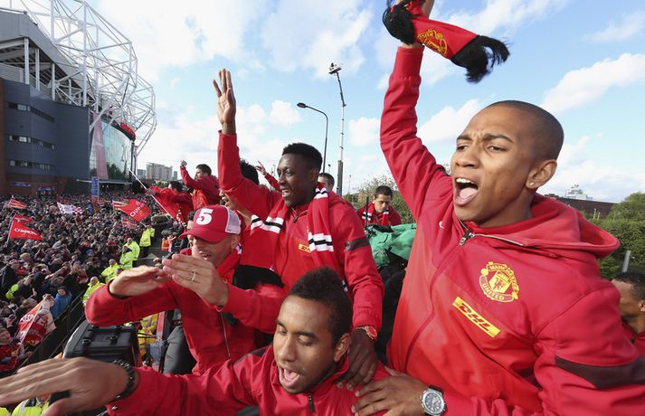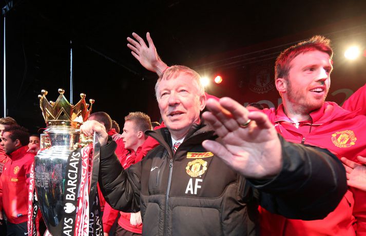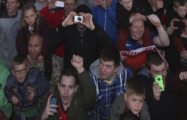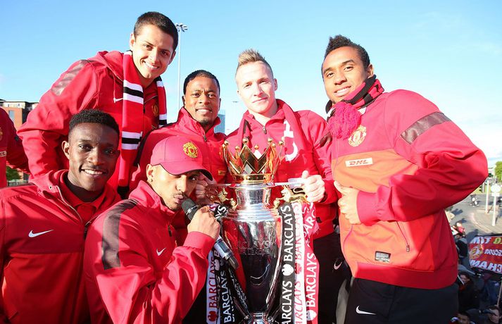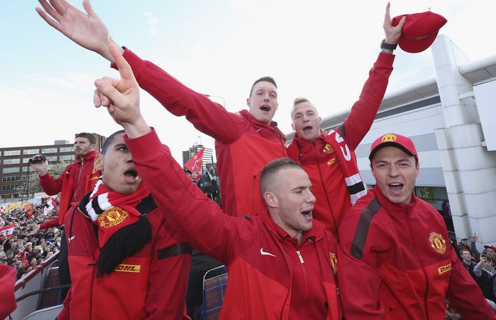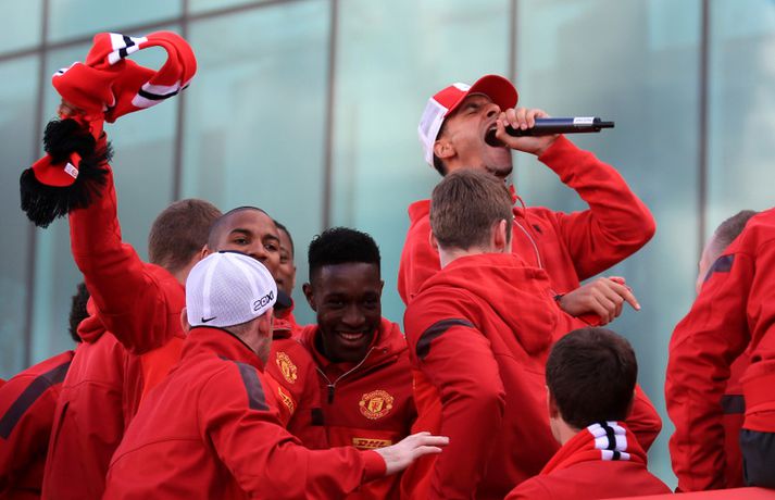 Leikmenn Manchester United tóku við Englandsmeistaratitlinum á Old Trafford í gær eftir 2-1 sigur á Swansea City í síðasta heimaleik liðsins undir stjórn Sir Alex Ferguson. Tilfinningarnar báru suma ofurliði í kveðjuveislu Fergie í gær en menn þar á bæ tóku upp þráðinn í dag og héldu áfram að fagna tuttugasta Englandsmeistaratitli félagsins. Liðsmenn og þjálfarar Manchester United fóru í rútuferð um Manchester-borg í kvöld þar sem þeir skemmtu sér og öllum þeim stuðningsmönnum félagsins sem umkringdu leiðina frá Old Trafford niður á Albert torgið. Hér fyrir ofan má sjá myndir af fögnuðinum í Manchester í dag en það var ekkert leiðinlegt fyrir stuðningsfólk Manchester United að syngja og tralla með hetjunum sínum í kvöld.Vísir/NordicPhotos/Getty