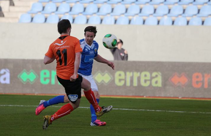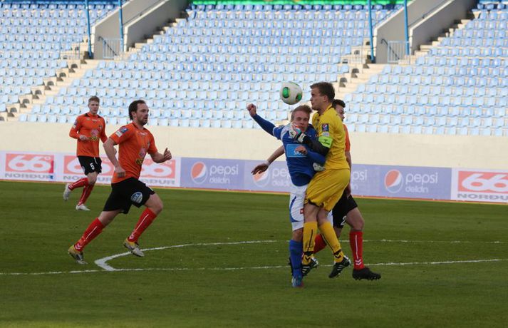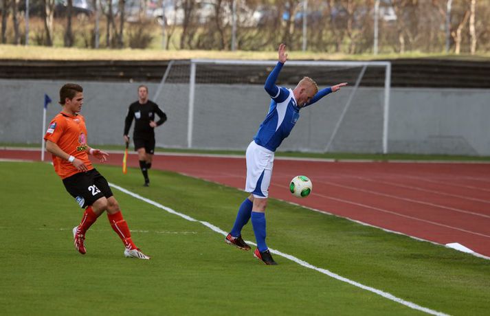 Viðar Örn Kjartansson tryggði Fylki 1-1 jafntefli á móti Fram á Laugardalsvelli í annari umferð Pepsi deildar karla í kvöld. Leikurinn fór heldur rólega af stað í fyrri hálfleik og liðin sköpuðu sér fá færi. Töluverður vindur gerði mönnum erfitt fyrir og fjölmargar sendingar rötuðu ekki á samherja. Í seinni hálfleik var annað upp á teningnum. Kristinn Ingi Halldórsson kom inn af bekknum hjá Fram á 61. mínútu leiksins og var ekki lengi að setja mark sitt á leikinn. Fjórum mínútum seinna átti hann ágætis sprett upp kantinn og lagði upp markið sem Lennon skoraði fyrir sína menn. Við markið virtust Fylkismenn vakna upp úr værum svefni og gáfu í. Þessi aukni kraftur drengjanna frá Árbænum skilaði sér í frábæru marki. Gamla kempan Tryggvi Guðmundsson átti þá góða sendingu inn á teig frá vinstri kanti, á kollinn á Viðari Erni, sem skoraði með skalla á 87. mínútu leiksins. Flott mark hjá Selfyssingnum knáa. Eftir þetta jöfnunarmark Fylkis færðist mikil spenna í leikinn. Fylkismenn töldu sig hafa skorað mark þegar Heiðar Geir Júlíusson tæklaði boltann í netið en Guðmundur Ársæll dæmdi markið af. Jafntefli líklega sanngjörn niðurstaða þó bæði lið séu svekkt með aðeins eitt stig. Framarar hafa fjögur stig eftir tvo leiki en stigið var það fyrsta hjá Árbæingum í sumar. Viðar Örn: Tryggvi einbeitir sér að stoðsendingunum„Það var ekkert að gerast fyrr en við fáum á okkur markið eftir barnaleg mistök. Það var eins og við hefðum gengið klip í bakið og loksins byrjað að ógna þeim,“ sagði markaskorarinn Viðar Örn Kjartansson. „Það er auðvitað gott að ná jafntefli eftir að hafa verið undir en samt er ég ósáttur að við höfum ekki náð að stela þessu,“ sagði Viðar sem er kominn með tvö mörk í tveimur leikjum. Aðspurður hvað Tryggva Guðmundssyni fyndist um að einhver annar sæi um að skora mörkin hló Viðar: „Hann er bara ánægður með þetta enda finnst honum gaman að leggja það upp. Hann sagði mér það inni í klefa áðan. Hann er kominn með markametið og ætlar að bæta stoðsendingametið.“ Steven Lennon: Ég hef ekkert að sanna„Þeir settu okkur undir pressu í seinni hálfleiknum. Það gerðist ítrekað síðustu tvö tímabil og ef við ætlum okkur hluti í deildinni þurfum við að hætta að fá á okkur mörk undir lokin,“ sagði Steven Lennon markaskorari Fram. Lennon kom Fram yfir á 65. mínútu en í kjölfarið blésu Fylkismenn til sóknar. „Vindurinn hafði sitt að segja en ef við hefðum sett 5% meiri orku í leikinn hefðum við líklega landað sigri. “ Steven Lennon átti frábært undirbúningstímabil í fyrra en meiðsli plöguðu hann á tímabilinu sjálfu þar sem Framarar stóðu ekki undir væntingum. „Persónulega tel ég mig ekki hafa neitt að sanna. Undirbúningstímabilið í fyrra gekk mjög vel en svo hef ég glímt lengi við meiðsli. Nú virðist ég vera að komast á ról,“ segir Lennon. Nú sé engin pressa á Frömurum. „Það var pressa á okkur í fyrra en nú reikna flestir með því að við verðum í neðri hlutanum. Við þurfum ekki að sanna okkur fyrir neinum heldur bara einbeita okkur að leiknum,“ sagði Skotinn. Þorvaldur: Spurning hvort við áttum að fá víti„Það er spurning hvort við hefðum átt að fá víti þegar Sverrir Garðarsson fer í Hólmbert. Hann fór ekki niður en Sverrir fær samt sem áður gult spjald. Við fengum ágætis sókn úr þessu og áttum að klára leikinn þá,“ sagði Þorvaldur Örlygsson, þjálfari Fram, eftir leik. „Vinnslan var góð og við vorum duglegir. Við náðum aldrei almennilegu spili því Fylkismenn lágu aftarlega á vellinum,“ sagði Þorvaldur. „Úr því sem komið var er ég sáttur með stigið hérna í kvöld.“ Ásmundur: Ekki sáttur við eitt stig„Sigurinn hefði geta dottið báðum megin en mér fannst við eiga fleiri möguleika. Mér fannst líka að við hefðum átt að fá víti sem ekki var dæmt og þá var mark sem átti að standa ekki dæmt. Miðað við það er maður ekki sáttur við eitt stig hérna í kvöld,“ sagði Ásmundur Arnarsson, þjálfari Fylkis, eftir leik.Mynd/Daníel