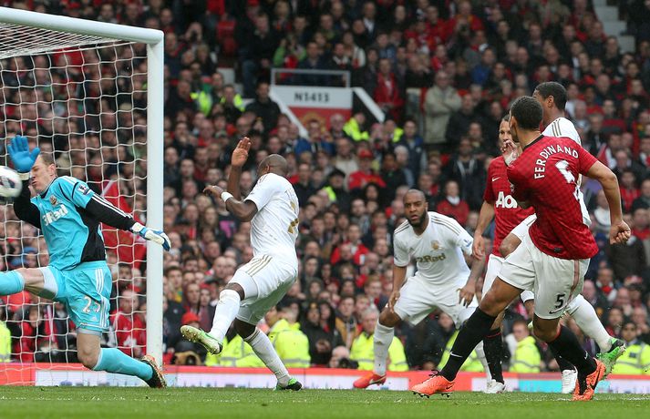 Manchester United fékk afhentan enska meistaratitilinn í 20. skipti í sögu félagsins þegar liðið bara sigur úr býtum, 2-1, gegn Swansea í næst síðustu umferð deildarkeppninnar. Þetta var síðasti leikur Sir Alex Ferguson, knattspyrnustjóra United, á Old Trafford og kvaddi hann með stæl. Hér að ofan má sjá myndir af fagnaðarlátunum í dag og þegar leikmenn og þjálfarar liðsins fengu afhendan bikarinn.