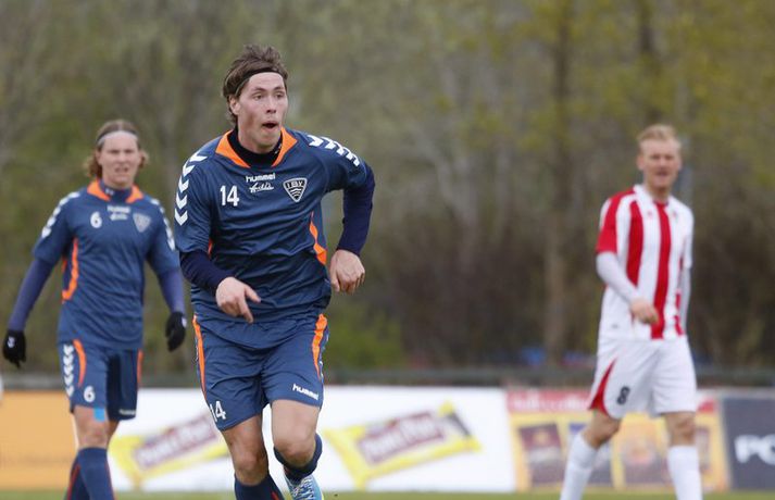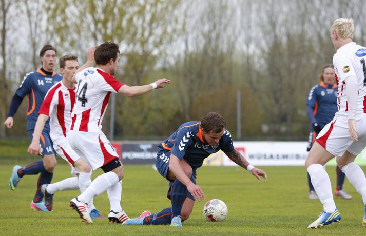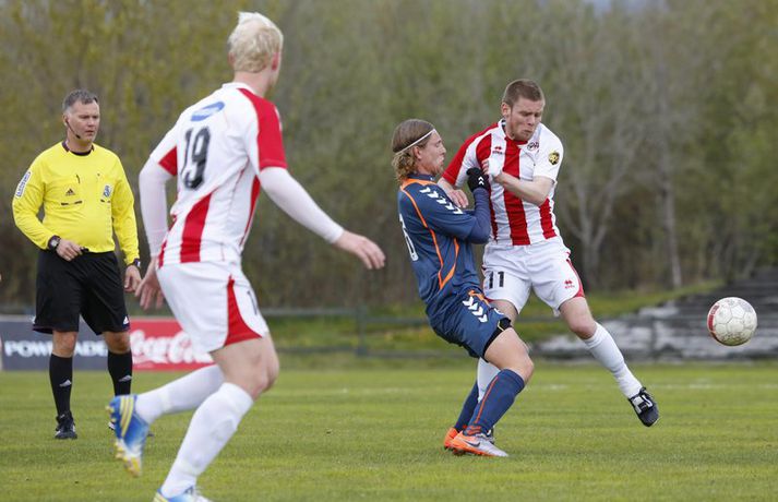 Umfjöllun og viðtöl: Þróttur - ÍBV 1-5 | Þróttarar brotnuðu í lokin Eyþór Atli Einarsson á Valbjarnarvelli skrifar 29. maí 2013 10:35 Aron Bjarnason í baráttunni við Tonny Mawejje og Ragnar Pétursson. Mynd/Valli Fjögur mörk á síðustu tíu mínútum leiksins tryggðu ÍBV 5-1 sigur á Þrótti og sæti í 16-liða úrslitum Borgunarbikars karla í knattspyrnu. Leikurinn fór nokkuð fjörlega af stað og leit út fyrir að gestirnir frá Heimaeynni ætluðu að pressa stíft á brotið fyrstu deildarlið Þróttara og slá þá svolítið út af laginu. Það gerðist þó ekki þar sem Þróttur fékk fyrsta alvöru færi leiksins þegar Halldór Arnar Hilmisson átti skot sem Guðjón Orri varði. Eftir það slökuðu Eyjamenn á pressunni og leikurinn var allur í járnum lengi vel. Á 23. mínútu fyrri hálfleiks fékk Ragnar Leósson sendingu frá nafna sínum Péturssyni. Hann var einn á auðum sjó um miðjan völl og trítlaði í rólegheitum í átt að markinu. Varnarmenn Þróttara gerðu lítið til að stöðva hann og því lét hann vaða á markið. Ögmundur Ólafsson, markvörður Þróttara, fór aðeins fram úr sjálfum sér og var búinn að skutla sér í hægra hornið en boltinn breytti um stefnu eftir viðkomu í Aaron Spear og í markið fór hann. Staðan 0-1 Eyjamönnum í vil. Fátt markvert gerðist það sem eftir lifði hálfleiksins en Þróttarar sýndu mikinn vilja og gáfu gestunum ekki mörg færi eftir þetta. Síðari hálfleikurinn hófst eins og sá fyrri hafði endað. Bæði lið skiptust á sóknum sem skiluðu ekki neinum frábærum færum. Á 53. mínútu fékk Andri Björn Sigurðsson boltann í teig ÍBV og veilaði ekki fyrir sér að láta vaða á markið. Þrumuskot, smellhitti tuðruna. Guðjón Orri Sigurjónsson, markvörður ÍBV átti ekki möguleika. 1-1. Eftir markið voru Þróttarar ívið sterkari aðilinn í leiknum og fengu þeir færi til að komast yfir. Hlynur Hauksson komst fyrst í ákjósanlegt færi en átti laflaust skot sem Guðjón Orri átti ekki í vandræðum með að verja. Á 72. mínútu sýndi Hermann Hreiðarsson að hann hefur virkilega gott auga fyrir góðum skiptingum því hann skipti Gunnari Má Guðmundssyni inn á völlinn, líklega eingöngu vegna þess að hann var í spánýjum Copa Mundial takkaskóm og þá vantaði á völlinn. Þróttarar voru farnir að þreytast eftir mikla baráttu og Hermann fékk ferska fætur inn á völlinn. Áður hafði Víðir Þorvarðarson komið inn á og þessir tveir herramenn áttu aldeilis eftir að koma við sögu. Eyjamenn fagna marki Ragnars Leóssonar.Mynd/Valli Átta mínútum eftir að Gunnar Már kom inn á hafði hann sett mark sitt á leikinn. Ian Jeffs tók hornspyrnu og gaf stuttan bolta á Gunnar Þorsteinsson, að mér sýndist, sem vippaði inn í teiginn. Þar reif Gunnar Már sig upp af jörðinni í nýju skónum og skallaði boltann í netið. Fallegt mark og staðan orðin 1-2 gestunum í vil. Páll Einarsson þjálfari Þróttara gerði þá skiptingu og tók Erling Jack varnarmann út af og bætti í sóknarþungann. Því miður fyrir Þrótt þá gekk það ekki upp í þetta skiptið og gestirnir gengu á lagið með Gunnar Már fremstan meðal jafningja. Á 85. mínútu fékk Gunnar Már boltann við teig Þróttara og rakti hann aðeins áfram, sendi síðan á Ian Jeffs sem mundaði vinstri fótinn og lagði boltann þéttingsfast í þaknetið og staðan skyndilega orðin 1-3. Gestirnir voru ekki hættir, en því miður fyrir stuðningsmenn Þróttara þá voru heimamenn það, því Gunnar Már, í nýju skónum, skoraði sitt annað mark á 87. mínútu eftir laglegan undirbúning Víðis Þorvarðarsonar. Víðir vildi ekki verða skilinn út undan í markaskorunarkeppni varamannanna og rak smiðshöggið á þriðju mínútu uppbótartíma eftir frábæra sókn ÍBV. Gunnar Már hóf þá sókn og endaði boltinn við fætur Ian Jeffs sem gaf laglega hælsendingu inn fyrir sundurtætta varnarlínu Þróttara. Þar kom Víðir á hörkuspretti og þrumaði boltanum í fjærhornið. Staðan 1-5 sem urðu lokatölur. Þróttarar mega vera stoltir af sinni frammistöðu í þessum leik. Þeir börðust vel í áttatíu mínútur og var ekki að sjá að þeir væru á botni fyrstu deildar og gestirnir ofarlega í efstu deild. Í lokin munaði mestu um ferskar fætur varamanna ÍBV sem virkuðu sem vítamínssprauta fyrir liðið. Þegar gestirnir náðu öðru markinu gerðu þeir engin mistök og allur vindur því miður úr Þrótturum. Sanngjarn sigur Eyjamanna en helst til stór.Gunnar Már Guðmundsson: Ekki snúa baki við flaggskipi ADIDAS„Við náðum ekki að pressa þá almennilega stóran hluta leiksins. Þegar það gekk upp skilaði það árangri.“ sagði Gunnar Már Guðmundsson, leikmaður ÍBV eftir sigurleik sinna manna á Þrótti í Borgunarbikarnum í kvöld. „Það var mjög fínt að klára þennan leik. Hann opnaðist mikið eftir að við komumst í 2-1. Mér fannst við verðskulda það að komast áfram. Við komum hingað til að vinna og það tókst, þrátt fyrir slakan leik,“ bætti Gunnar Már við en hann skoraði tvö marka gestanna í kvöld eftir að hafa komið inn á sem varamaður á 72. mínútu. Gunnar Már var undir það búinn að byrja leikinn á bekknum þar sem stutt er í næsta leik gegn Fylki í Pepsideildinni. „Það verður þriðji leikurinn í röð sem við mætum særðu liði og þeir koma til með að líta á þann leik til að þjappa sér saman eins og Þróttararnir gerðu fyrir þennan leik,“ en Þróttur hefur ekki enn unnið leik á þessu tímabili. Athygli vakti að Gunnar Már lék í svörtum Copa Mundial skóm frá Adidas sem er sjaldgæft nú til dags. Leikmenn flestir komnir í skó í öllum regnboganslitum. Léttur og kátur hafði Gunnar Már þetta að segja. „Ég spilaði minn fyrsta leik á ævinni í rauðum s
