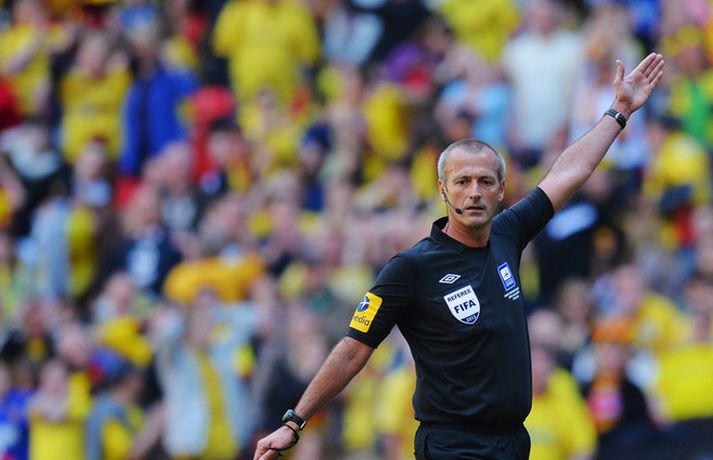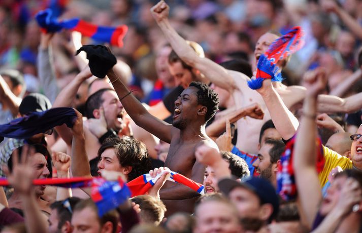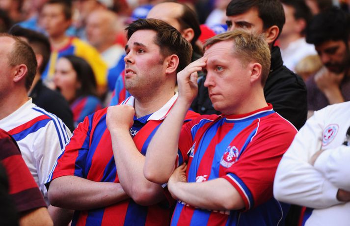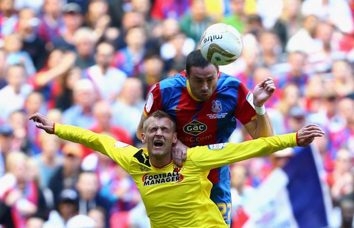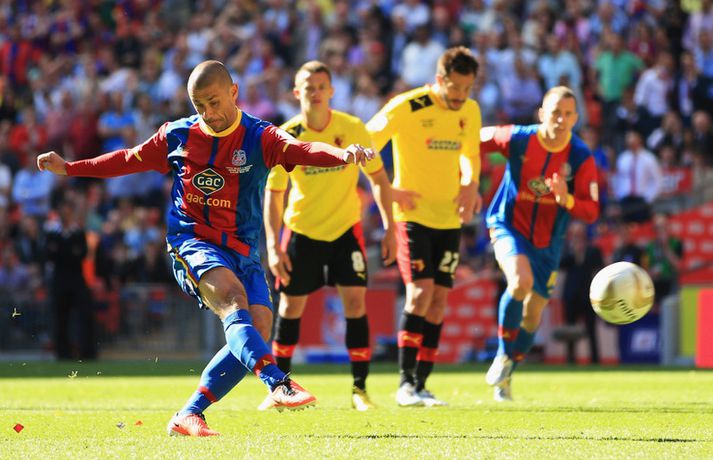 Gamla brýnið Kevin Phillips tryggði Crystal Palace sæti í ensku úrvalsdeidlinni í knattspyrnu þegar liðið lagði Watford 1-0 í framlengdum leik á Wembley. Eina markið kom úr vítaspyrnu undir lok fyrri hálfleiks framlengingar. Spennustigið var hátt á Wembley enda mikið í húfi. Leikurinn er oft nefndur 120 milljóna punda leikurinn vegna þeirra gífurlegu fjárhæða sem félögin í ensku úrvalsdeildinni fá vegna sjónvarpsréttar. Dramatík er árlegur viðburður í úrslitaleik umspilsins og á því varð engin undantekning þótt betri fótbolti og fleiri mörk hafi oftar en ekki verið á dagskránni. Úr leiknum á Wembley í dag.Nordicphotos/Getty Wilfried Zaha, leikmaður Manchester United sem er í láni hjá Crystal Palace, var sprækur í fyrri hálfleiknum en annars var lítið um færi í venjulegum leiktíma. Það var hins vegar Zaha sem sótti vítaspyrnuna dýrmætu undir lok fyrri hálfleiks framlengingar. Marco Cassetti, lánsmaður frá Udinese, braut á Zaha og ljóst að Ítalinn vill gleyma leiknum sem fyrst. Phillips skoraði af miklu öryggi úr spyrnunni og stuðningsmenn Lundúnarliðsins ærðust af fögnuði. Phillips verður fertugur í júlí og mikill styrkur fyrir Palace að geta sett svo reynslumikinn leikmann á vítapunktinn þegar svo mikið var í húfi. Ian Holloway og Gianfranco Zola á hliðarlínunni í dag.Nordicphotos/Getty Watford reyndi hvað það gat til að jafna metin og komst nálægt því í tvígang undir lok framlengingar. Í annað skiptið björguðu liðsmenn Palace á línu og í síðara skiptið fór boltinn hárfrínt fram hjá. Það er því ljóst að Cardiff, Hull og Crystal Palace eru liðin þrjú sem bætast í hópinn í ensku úrvalsdeildina á næstu leiktíð. Reading, Wigan og QPR féllu hins vegar úr deildinni. Ian Holloway endurnýjar því kynnin við ensku úrvalsdeildina. Hann stýrði Blackpool í deild hinna bestu leiktímabilið 2010-2011. Gianfranco Zola og hans menn í Watford þurfa að sætta sig við annað ár í næstefstu deild.