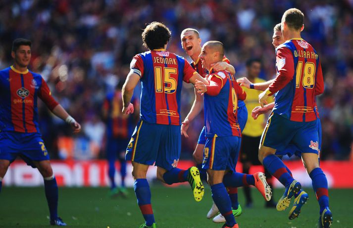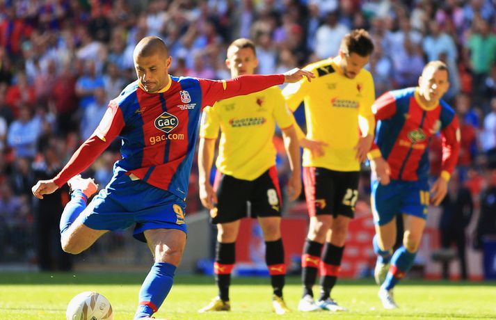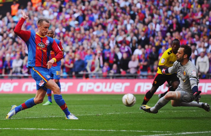 Phillips skaut Crystal Palace í ensku úrvalsdeildina Kolbeinn Tumi Daðason skrifar 27. maí 2013 10:28 Kevin Phillips skorar sigurmark Crystal Palace úr vítaspyrnu. Nordicphotos/Getty Gamla brýnið Kevin Phillips tryggði Crystal Palace sæti í ensku úrvalsdeidlinni í knattspyrnu þegar liðið lagði Watford 1-0 í framlengdum leik á Wembley. Eina markið kom úr vítaspyrnu undir lok fyrri hálfleiks framlengingar. Spennustigið var hátt á Wembley enda mikið í húfi. Leikurinn er oft nefndur 120 milljóna punda leikurinn vegna þeirra gífurlegu fjárhæða sem félögin í ensku úrvalsdeildinni fá vegna sjónvarpsréttar. Dramatík er árlegur viðburður í úrslitaleik umspilsins og á því varð engin undantekning þótt betri fótbolti og fleiri mörk hafi oftar en ekki verið á dagskránni. Úr leiknum á Wembley í dag.Nordicphotos/Getty Wilfried Zaha, leikmaður Manchester United sem er í láni hjá Crystal Palace, var sprækur í fyrri hálfleiknum en annars var lítið um færi í venjulegum leiktíma. Það var hins vegar Zaha sem sótti vítaspyrnuna dýrmætu undir lok fyrri hálfleiks framlengingar. Marco Cassetti, lánsmaður frá Udinese, braut á Zaha og ljóst að Ítalinn vill gleyma leiknum sem fyrst. Phillips skoraði af miklu öryggi úr spyrnunni og stuðningsmenn Lundúnarliðsins ærðust af fögnuði. Phillips verður fertugur í júlí og mikill styrkur fyrir Palace að geta sett svo reynslumikinn leikmann á vítapunktinn þegar svo mikið var í húfi. Ian Holloway og Gianfranco Zola á hliðarlínunni í dag.Nordicphotos/Getty Watford reyndi hvað það gat til að jafna metin og komst nálægt því í tvígang undir lok framlengingar. Í annað skiptið björguðu liðsmenn Palace á línu og í síðara skiptið fór boltinn hárfrínt fram hjá. Það er því ljóst að Cardiff, Hull og Crystal Palace eru liðin þrjú sem bætast í hópinn í ensku úrvalsdeildina á næstu leiktíð. Reading, Wigan og QPR féllu hins vegar úr deildinni. Ian Holloway endurnýjar því kynnin við ensku úrvalsdeildina. Hann stýrði Blackpool í deild hinna bestu leiktímabilið 2010-2011. Gianfranco Zola og hans menn í Watford þurfa að sætta sig við annað ár í næstefstu deild. Enski boltinn Mest lesið Ungu strákarnir mætast í úrslitaleiknum á HM í pilu Sport Luke „the Nuke“ Littler í úrslitaleikinn þriðja árið í röð Sport Amorim segir að engar viðræður séu í gangi Enski boltinn Skírður í sjónum á ströndinni í Bournemouth Enski boltinn Fann liðsfélaga sinn látinn Sport Segja að Liverpool líti á Harvey Elliott sem vandamál Aston Villa Enski boltinn Nýja árið byrjaði á flengingu á heimavelli Körfubolti Þá fáum við að vita meira um líf Schumacher eftir slysið Formúla 1 Al Amri stal sviðsljósinu af Ronaldo og Toney tók frá honum stigin Fótbolti Searle vann fyrsta settið á móti Littler Sport Fleiri fréttir Skírður í sjónum á ströndinni í Bournemouth Segja að Liverpool líti á Harvey Elliott sem vandamál Aston Villa Amorim segir að engar viðræður séu í gangi Losnar Sterling úr frystikistunni hjá Chelsea? Brennan Johnson er orðinn leikmaður Crystal Palace „Þú færð ekkert fyrir að vera heiðarlegur“ „Bara plástur á sár, hann mun ekki vera þarna í mörg ár“ Ungur varnarmaður sagður á leið til Liverpool Sjáðu mörkin sem voru skoruð á nýársdag Færir sig um set í Lundúnum Skilur baulið hjá stuðningsmönnum vel Strákurinn fékk VAR í jólagjöf Sunderland hjálpaði Arsenal með því að taka stig af Man. City „Mjög svekkjandi“ Líklegast að Chelsea ráði stjóra Strassborg Fyrsta mark Mateta í langan tíma dugði ekki Palace til að taka öll stigin Bitlausir meistarar byrjuðu árið á því að tapa stigum á heimavelli Arsenal græddi á mistökum dómarans í 1-0 sigrinum á Everton Sjáðu Mateta skora fyrsta mark ársins 2026 Biðin mikla hjá Unai Emery tók aðeins nokkrar sekúndur Tók báða Íslendingana út af í hálfleik „Ekki jólin sem ég bjóst við“ Andri Lucas missti af þriðja leiknum í röð og áfram markaleysi án hans Aganefndin í fríi og Romero fær að spila í dag Chelsea búið að reka Enzo Maresca Slá því upp að Maresca gæti verið rekinn frá Chelsea í dag Hvað á Liverpool að gera með Mo Salah og Alexander Isak? Sjáðu allt það besta úr enska boltanum á árinu 2025 Alls ekki síðasti leikur Semenyo Segir dómarana bara hafa verið að giska Sjá meira