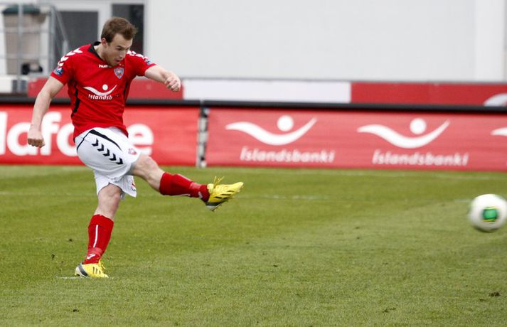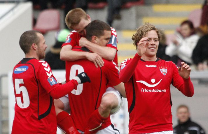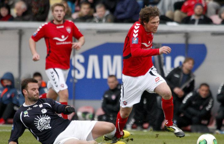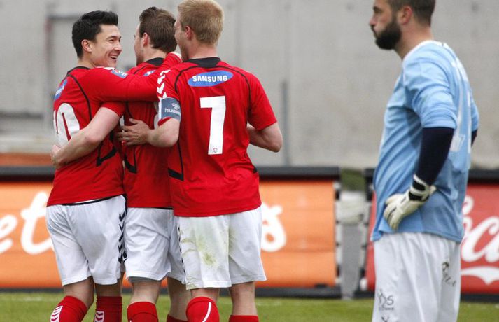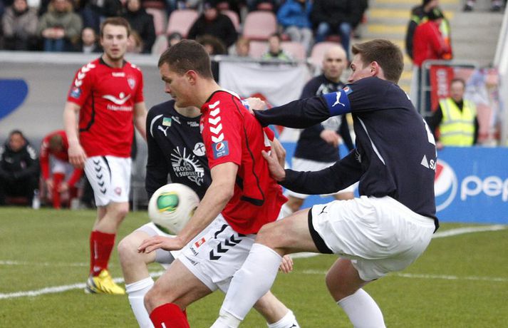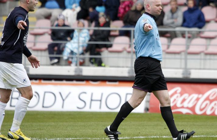 Valsmenn unnu 4-0 stórsigur á Keflavík á Vodafone-vellinum á Hlíðarenda þegar liðin mættust í 5. umferð Pepsi-deildar karla. Valsmenn buðu upp á knattspyrnuveislu á kostnað Keflvíkinga og veislustjóri var Rúnar Már Sigurjónsson. Rúnar Már Sigurjónsson lagði upp fyrsta markið fyrir Haukur Páll Sigurðsson í fyrri hálfleiks og skoraði síðan næstu tvö sjálfur. Varamaðurinn Kolbeinn Kárason innsiglaði síðan sigurinn. Samúel Kári Friðjónsson fékk beint rautt spjald átta mínútum fyrir leikslok en tíu Keflvíkingar sluppu við að fá á sig fleiri mörk. Anton Brink, ljósmyndari Fréttablaðsins og Vísis, var á vellinum og má sjá myndirnar hans hér fyrir ofan. Valsmenn eru enn taplausir eftir 5 umferðir í Pepsídeild karla eftir sannfærandi sigur á Keflavík á heimavelli sínum við Hlíðarenda. Þeir rauðklæddu sem sigruðu Suðurnesjamenn tvívegis með markatölunni 4-0 síðastliðið sumar kjöldrógu Keflvíkinga þriðja skiptið í röð og enn og aftur með sömu markatölu. 4-0 fyrir Val. Fyrri hálfleikurinn í leik Valsmanna og Keflvíkinga gaf ekkert sérstök fyrirheit um markasúpu. Valsmenn sóttu gegn vindi en náðu þó að stýra leiknum án þess þó að skapa sér mörg teljandi færi. Gestirnir frá Keflavík lágu hinsvegar aðeins aftur og áttu erfiðara með að halda boltanum innan liðsins. Eftir 18. mínútna leik tóku Valsmenn forystu í leiknum er Haukur Páll Sigurðsson stökk hæst allra í teignum og stangaði boltann í netið eftir hornspyrnu Rúnars Sigurjónssonar. Keflvíkingar komust næst því að jafna á síðustu sekúndum hálfleiksins þegar Frans Elvarsson náði föstu skoti frá markteig en Fjalar í marki Vals varði meistaralega. Mark frá Frans hefði getað breytt leiknum en því miður fyrir Keflvíkinga var Fjalar vel á verði. Keflvíkingar byrjuðu seinni hálfleikinn af ágætis krafti en eftir 15 mínútna leik í seinni hálfleik breytti Rúnar Már stöðunni í 2-0. Rúnar fékk þá boltann við vítateigsbogann, hann þurfti ekki mikið pláss til munda skotfótinn og staðsetja skot sitt alveg í bláhornið óverjandi fyrir Preece í marki gestanna. Við mark Rúnars tóku Valsmenn öll völd á vellinum og gerðu Valsmenn endanlega út um leikinn fjórum mínútum síðar eða á 69. mínútu þegar títtnefndur Rúnar skoraði af öryggi úr vítaspyrnu. Kolbeinn Kárason sem var nýkomin inn á sem varamaður innsiglaði svo 4-0 sigur Hlíðarendapilta með skallamarki á 78. mínútu. Rúnar og Williamson tóku stutt horn og Kolbeinn sem var dauðafrír inn í teig Keflvíkinga afreiddi boltann með enninu í mark gestanna. Við fjórða markið fjaraði leikurinn út og endapunktinn á niðurlægingu Keflvíkinga setti hinn 16 ára Samúel Kári Friðjónsson með því að fá beint rautt spjald fyrir kjaftbrúk á 82. mínútu. Valsmenn eru greinilega á góðu róli undir stjórn Magnúsar Gylfasonar. Skemmtilegt er að sjá þá spila og má vel merkja mikið öryggi í þeirra leik. Fjórir öftustu reyna nær undantekningarlaust að spila boltanum meðfram jörðinni úr frá vörninni. Miðjumennirnir Ian og Haukur berjast og láta finna vel fyrir sér og þá sérstaklega er gaman að fylgjast með Hauki sem tapar vart skallabolta á miðsvæðinu auk þess hann ógnar mikið þegar í teig andstæðinganna er komið. Rúnar Már er svo potturinn og pannan í spili Vals og eiga þeir rauðu eflaust eftir að styrkjast enn meira þegar hann nær sínu besta formi. Keflvíkingar voru kannski eins og tölurnar gefa til kynna slakir. Það má segja að þeir hafi spilað sæmilega í klukkutíma en það var eins og þeir hafi misst hausinn við það að fá annað markið á sig. Einhvern brodd vantaði í sóknarleik þeirra og oft voru ákvarðanatökur rangar á síðasta þriðjung vallarins. Lykilmenn þeirra eins og Jóhann Birnir, Frans og Arnór þurfa að spila betur ef þeir ætla að hala inn einhver stig á næstunni. Út frá þessum úrslitum má ætla að Valsmenn séu efni í toppbaráttu lið sem getur barist um Íslandsmeistaratign. Keflvíkingar hinsvegar þurfa að taka sig á og það vel og mikið.Rúnar Már: Ég var gjörsamlega búinn á því síðustu 20 mínúturnarRúnar Már Sigurjónsson miðjumaður Valsmann þótt bera af í leik sinna manna og var hann ap vonum sáttur með 4-0 sigur. „Þetta var fínn fótboltaleikur og þá sérstaklega í seinni hálfleik. Við reynum alltaf að spila boltanum meðfram jörðinni og ef spilið gengur hratt þá náum við að láta andstæðinginn hlaupa svolítið. Þetta var auðvitað erfitt í vindinum en við náðum þrátt fyrir það að bjóða upp á góðan leik“. Aðspurður um frammistöðu sína í leiknum sagði Rúnar: „Ég var gjörsamlega búinn á því síðustu 20-25 mínúturnar en ég sáttur að vera loksins byrjaður að spila fótbolta aftur eftir leiðinleg meiðsli. Ég á ennþá svolítið í land með ná heilsu. Ég var að kljást við bakmeiðsli í Hollandi en eftir að ég jafnaði mig af því hefur hællinn verið að stríða mér, en ég verð bara að hugsa vel um mig á næstunni“. Eins og oft áður tók Valsliðið miklum breytingum núna í vetur og vill Rúnar meina að vel hafi tekist til: „Liðið tók auðvitað breytingum. Margir út og margir inn.Maggi hinsvegar hefur sett þetta aðeins öðruvísi, bæði hvernig við verjumst og sækjum og hingað til hefur þetta gengið vel og við erum því bara bjartsýnir“.Haraldur Guðmundsson: Mörk breyta leikjumHaraldur Guðmundsson fyriliði Keflvíkinga var súr í bragði í samtali við blaðamann Vísis. „Valsmenn byrja leikinn betur en við og skora frekar snemma, eftir það náðum við að komast inn í leikinn og þorðum að spila boltanum, Fransi var óheppinn að skora ekki í lok fyrri hálfleiks auk þess sem Jói brenndi af góðu færi í upphafi seinn