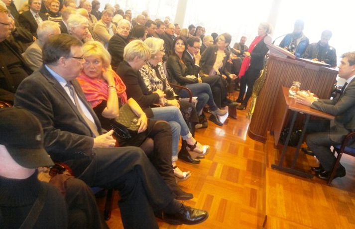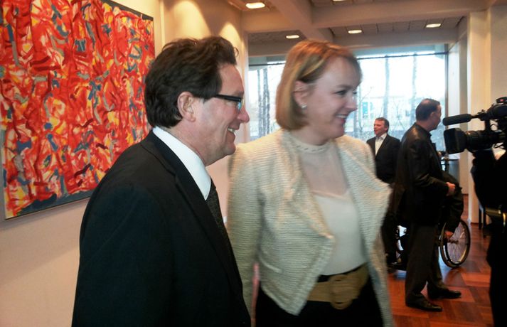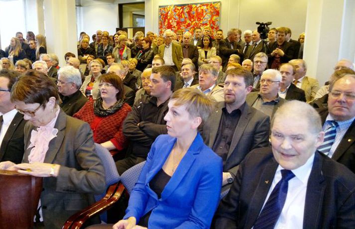 Aðgerðarhópur gegn ESB fagnar myndun „fullveldisstjórnar“ 21. maí 2013 20:42 Aðgerðarhópurinn gegn ESB. Mynd / Hrund Fundir Flokksráðs Sjálfstæðisflokksins í Valhöll og Miðstjórn Framsóknarflokksins í Rúgbrauðsgerðinni, eru byrjaðir, en þar verður nýr stjórnarsáttmáli kynntur fyrir félagsmönnum og atkvæði greidd um hann. Aðgerðarhópur gegn aðild að Evrópusambandinu hefur tekið sér stöðu fyrir utan báða fundarstaðina en samkvæmt einum í hópnum er verið að fagna því að verið sé að mynda „fullveldisstjórn“. Fagna myndun fullveldisstjórnar. Innan við tíu einstaklingar eru á vegum hópsins fyrir utan Valhöll en þar sagði einn að tilgangurinn væri sá að minna flokkana á að standa við stefnumál sín um að hafna ESB og slíta aðildarviðræðum. Fjölmargir eru mættir á báða fundina, en í Valhöll er meðal annars Geir H. Haarde, fyrrverandi formaður flokksins og forsætisráðherra. Eins og Vísir greindi frá fyrr í kvöld þá verður stjórnarsamstarfið kynnt formlega í Héraðsskólanum á Laugarvatni í fyrramálið. Hægt er að skoða myndir hér fyrir ofan af fundi Sjálfstæðismanna. Mest lesið Davos-vaktin: Trump bakkar Erlent Sex sagt upp í menntamálaráðuneytinu Innlent Unnu að því að stofna „Vélfag 2.0“ og tölvur með teikningum fjarlægðar Innlent Miðflokkurinn nálgast Samfylkingu Innlent Stjórnarformaður Vélfags handtekinn í aðgerðum saksóknara Innlent Fyrstu viðbrögð við ræðu Donalds Trump: „Ég bíð enn eftir að mennirnir í hvítu sloppunum nái í hann“ Erlent „Það er ekki laust við að það fari um mann“ Innlent „Ramma framtíðarsamkomulags“ náð um Grænland og hætt við tolla Erlent Hvað býr bakvið sólgleraugu Macron? Erlent Vél Trump snúið við en ræðan enn á dagskrá Erlent Fleiri fréttir Þjóðaröryggisráð boðað til fundar Skýrsla Félagsbústaða kolsvört Formaður Sjálfstæðisflokksins fer yfir þunga stöðu Hættu við lendingu í miðju aðflugi Taldi sig mega birta nektarmyndir af fyrrverandi en dómarinn hélt ekki Unnu að því að stofna „Vélfag 2.0“ og tölvur með teikningum fjarlægðar Drógu dauðan hval lengst út í hafsauga Segir gagnrýni minnihlutans til þess gerða að dreifa athygli Nú má heita Friðálv Gletting Lucíuson Náðu sex byssum úr byssuskáp á Akureyri Parísarheimsókn fjárlaganefndar „mjög fróðleg“ Með 29 kíló af maríjúana í töskunum Brúnni yfir Helluvatn lokað í fimm vikur Stjórnarformaður Vélfags handtekinn í aðgerðum saksóknara „Það er ekki laust við að það fari um mann“ Miðflokkurinn nálgast Samfylkingu Milljarða útspil meirihlutans „fullkomlega ábyrgðarlaust“ og lykti af prófkjörsbaráttu Ákærður fyrir nauðgun á nýársdag Markverð tíðindi í nýrri Maskínukönnun um fylgið á landsvísu Hátt í tíu þúsund manns án atvinnu í desember Sex sagt upp í menntamálaráðuneytinu Hættur í Viðreisn og sækist eftir formennsku í SI Vinnuslys þar sem maður „missti höndina inn í vals“ Baráttan um Framsókn muni snúast um sögulega stöðu Ráðherra segir ríkisvaldið gefa í með framkvæmdir Sverrir Bergmann hættir í bæjarstjórn Norðfirðingar gleðjast að sjá loðnuna birtast Annasamasti dagur á bráðamóttöku í lækna minnum Neituðu að greiða starfsfólki á leið í eigin rekstur uppsagnarfrest Gríðarleg fjölgun hótana og dæmi um að setið sé fyrir lögreglumönnum Sjá meira
