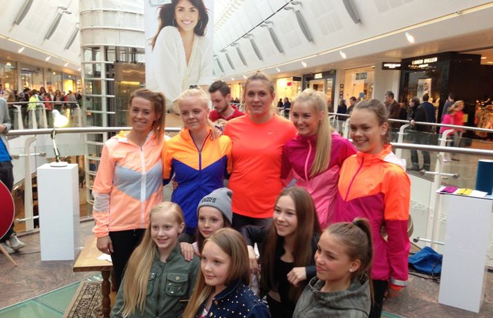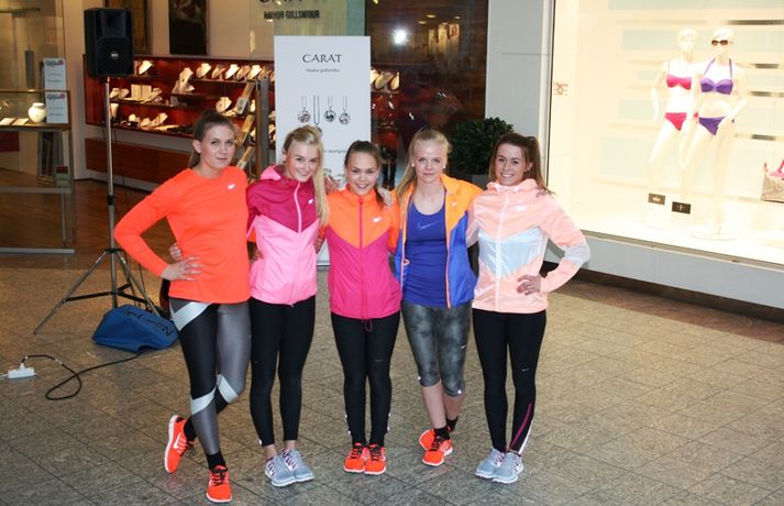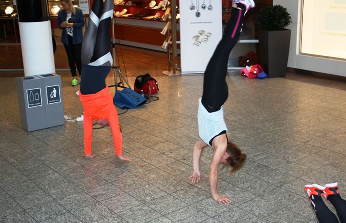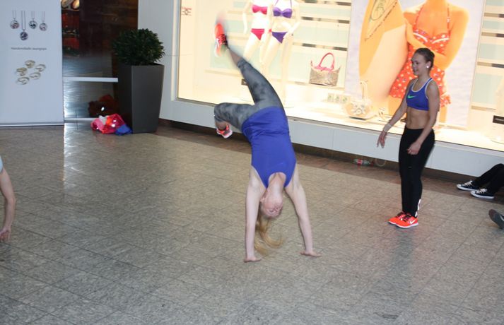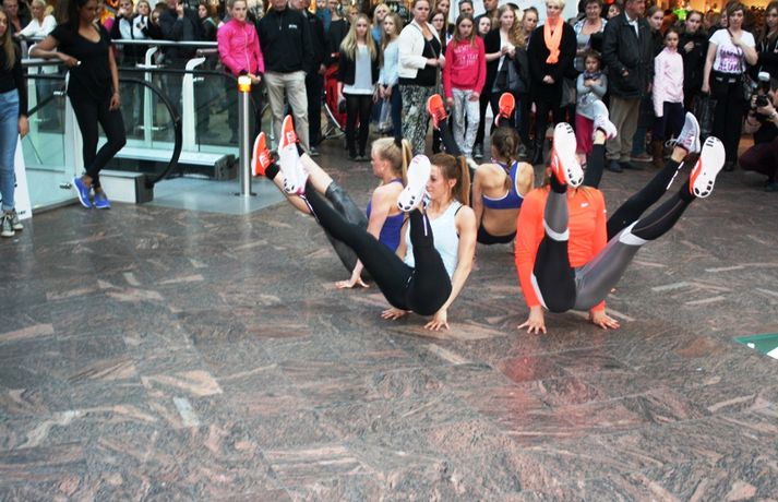 Meðfylgjandi myndir voru teknar á miðnæturopnun Smáralindar í gær af stúlkunum í meistaraflokk kvenna í Gerplu þegar þær sýndu þrjár pop-up tískusýningar á vegum Nike. Margmenni fylgdist með þessum skemmtilega og óvænta viðburði. Stúlkurnar sýndu flott dansatriði klæddar í sumarlínu Nike. Þá frumsýndu þær nýja liti af Nike Free skónum. Smelltu á efstu mynd í frétt til að skoða allar myndirnar.Hér má sjá myndskeið af stúlkunum: Já og svo brosa...Prófaðu að standa svona á höndunum með lappirnar beint upp - auðvelt?Brosandi eins og ekkert sé auðveldara. Það er vinna á bak við þessa æfingu. Ó já!Flottar fyrirmyndir hér á ferð.
