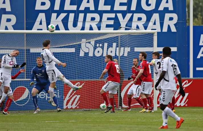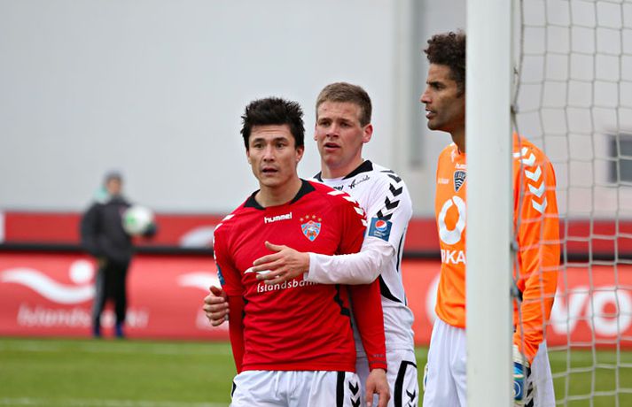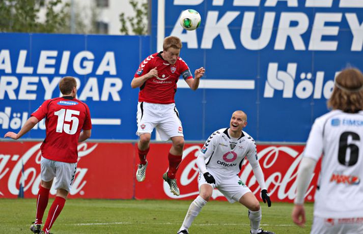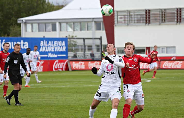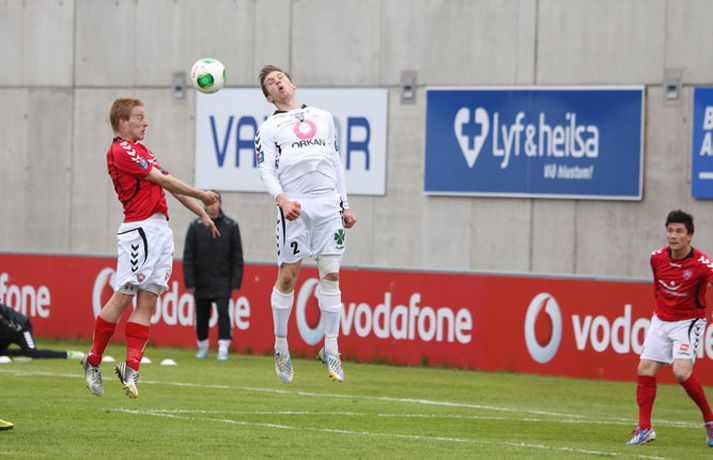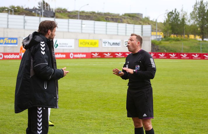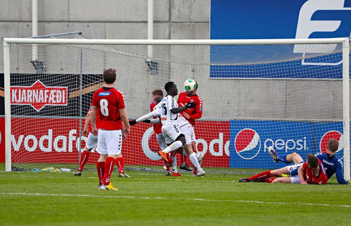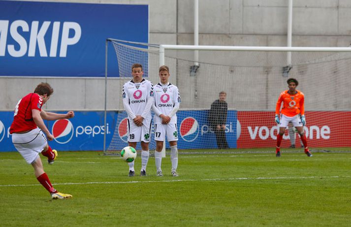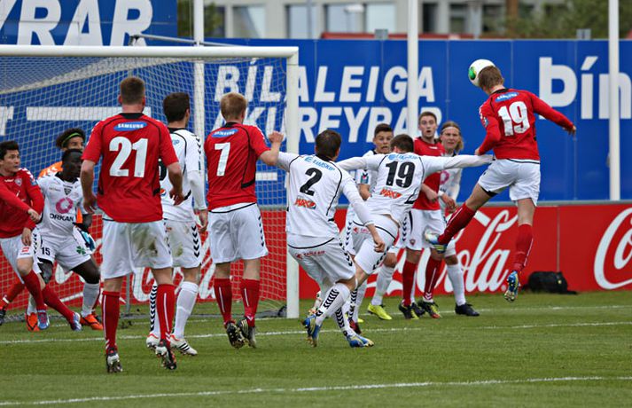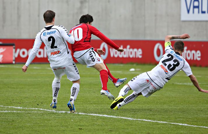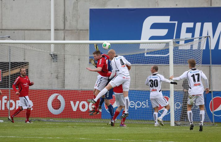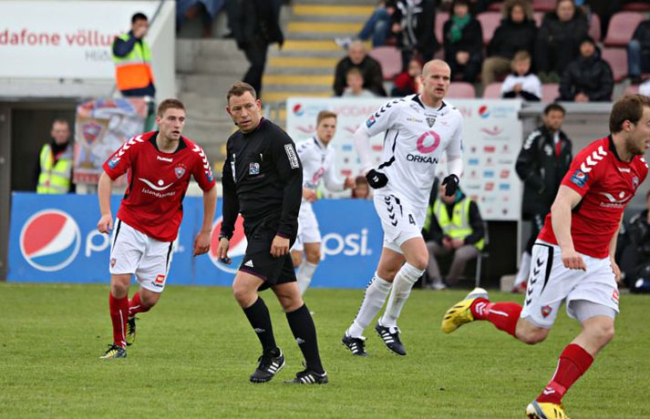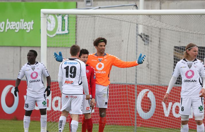 Valur og ÍBV gerðu 1-1 jafntefli í lokaleik sjöundu umferð Pepsi-deildar karla í knattspyrnu í kvöld. Leikurinn fór fram á Vodafone-vellinum en Eyjamenn gerðu eina mark fyrri hálfleiksins og Valsmenn eina mark síðari hálfleiksins. Leikurinn hófst nokkuð rólega og liðin lengi að finna taktinn. Eyjamenn voru aftur á móti örlítið sterkari í fyrri hálfleiknum og mun markvissari í sínum sóknaraðgerðum. Gestirnir sóttu meira og meira í sig veðrið þegar leið á hálfleikinn sem endaði með marki frá Tonny Mawejje fimm mínútum fyrir lok fyrri hálfleik. Gunnar Már Guðmundsson, leikmaður ÍBV, átti skalla í þverslána og þaðan barst boltinn til Mawejje sem potaði honum yfir marklínuna. Skrautlegt mark sem hafði legið í loftinu í töluverðan tíma. Staðan var því 1-0 fyrir gestina í hálfleik. Leikurinn var verulega bragðdaufur í upphafi síðari hálfleiksins en Valsmenn reyndu hvað þeir gátu að koma sér á ný inn í leikinn. Þegar um hálftími var eftir af leiknum setti Magnús Gylfason, þjálfari Vals, Kolbein Kárason inná völlinn og það tók hann aðeins fjórar mínútur til þess að jafna metin fyrir Val. Arnar Sveinn Geirsson átti frábæra fyrirgjöf inn í vítateig Eyjamanna sem Kolbeinn skallaði í gagnstætt horn, alveg óverjandi fyrir David James í marki ÍBV. Eftir mark Valsmanna tóku heimamenn öll völd á vellinum. Heimamenn náðu samt sem áður ekki að nýta sér yfirburði sína í síðari hálfleiknum og leiknum lauk því með 1-1 jafntefli. Valur því enn í fjórða sæti deildarinnar með 15 stig og Eyjamenn með 12 stig í sjötta sæti. Rúnar Már: Svekktur, pirraður og reiður„Ég er svekktur, pirraður og reiður,“ segir Rúnar Már Sigurjónsson, leikmaður Vals, eftir jafnteflið í kvöld. „Maður er sérstaklega pirraður eftir frammistöðu okkar í fyrri hálfleiknum og við erum orðnir gríðarlega leiðir á því að þurfa alltaf að koma til baka eftir að lenda undir. Það sýnir samt sem áður einnig mikinn karakter að við komum alltaf til baka.“ „Það virðist alltaf eins og við þurfum að fá á okkur mark til þess að fara í gang og við verðum einfaldlega að fara finna lausn á því.“ „Við erum alltaf mikið mun betri aðilinn í leiknum eftir að við fáum á okkur mark, sem er einkennilegt.“ Valur er í fjórða sæti deildarinnar með 15 stig. „Ég hefði viljað vera með 2-4 stig í viðbót eftir sjö umferðir en við erum taplausir sem er gott.“ Hægt er að sjá myndband af viðtalinu hér að ofan. Hermann: Haukur Páll fer í þessa tæklingu eins og fljúgandi skítakamar„Þetta voru mjög sanngjörn úrslit,“ sagði Hermann Hreiðarsson, þjálfari ÍBV, eftir leikinn í kvöld. „Við vorum hættulegri aðilinn í fyrri hálfleiknum og áttum betri færi. Liðið náði að nýta þetta eina færi gríðarlega vel.“ „Gott lið eins og Valur fær alltaf að eiga sína góðu kafla í hverjum leik og það gerðist í kvöld. Það var virkilega svekkjandi hvað við duttum aftarlega í síðari hálfleiknum og Valur uppsker mark eftir það.“ „1-0 er stórhættuleg staða og við ætluðum alls ekki að falla til baka, heldur halda okkur við sama leikskipulag en það gekk ekki upp og því var jafntefli sanngjörn úrslit.“ Hermann Hreiðarsson ærðist út í Hauk Pál, leikmann Vals, eftir eina tæklingu í síðari hálfleiknum og lét hann heldur betur heyra það. „Hann kemur hérna eins og fljúgandi skítakamar, allt of seinn í tæklinguna og átti ekki möguleika í boltann. Ég er svosem ekki að biðja um nein spjöld þegar ég bregst svona við en mér fannst þetta bara nokkuð léleg tækling hjá honum. Hann þarf bara að læra svona hluti og ég get alveg tekið hann í smá kennslu í þessu.“Hægt er að sjá myndbandið af viðtalinu við Hermann með því að ýta hér.