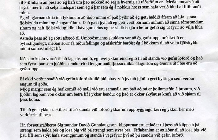 Berst til síðasta blóðdropa Ingveldur Geirsdóttir skrifar 24. júní 2013 18:55 Hestamaður sem reið að Stjórnarráðinu í morgun og ætlaði að færa forsætisráðherra skæri til að klippa á strengina sem stýra honum og fíflabana til að reka fíflin sem eru í kringum hann í burtu segist blöskra ástandið í þjóðfélaginu. Vegna íbúðarláns er hann að missa allar eignir sínar, meðal annars hesta fjölskyldunnar. Í morgun reið Friðrik Helgason frá hesthúsahverfinu Heimsenda í Kópavogi að Alþingishúsinu og þá að Stjórnarráðinu með von um að hitta Sigmund Davíð Gunnlaugsson forsætisráðherra. Honum varð ekki að ósk sinni en hitti þess í stað lögreglumenn sem gerðu fararskjóta hans upptækann auk skæra og fíflabana sem hann ætlaði að færa ráðherra. „Ég ákvað að færa honum skæri svo hann geti klippt á strengina því að þetta eru auðsjáanlega stór hópur sem stýrir þessum drengjum. Þessi góði maður vill kannski framkvæma þessi loforð sem hann stóð fyrir og þá er ég að bjóða honum að gera það og nota svo fíflabanann til þess að losa sig við fíflin í kringum sig og standa við þessi loforð og þá verður hann þjóðhetja," segir Friðrik. Friðrik ætlaði einnig að afhenda forsætisráðherra bréf en í því skýrir hann stöðu sína og hvetur ráðherra til að standa strax við kosningaloforðið um að laga skuldastöðu heimilanna. „Mér bara blöskrar ástandið í þjóðfélaginu og búinn að fá alveg upp í kok af mjög langvarandi aðgerðarleysi sem nær alveg aftur í fyrri ríkisstjórn. Reiðin fór að ólga í mér þegar þeir fóru að bjarga bönkunum. Þau voru kosin til þess að bjarga heimilunum, voru með skjaldborg heimilanna en það var farið að bjarga bönkunum og allskonar fyrirtækjum. Nú kemur ný ríkisstjórn með svaka loforð og mér finnst ekkert vera að gerast þar." Eignir Friðriks hafa brunnið upp í verðbólgubálinu og nú er svo komið að það á að taka þær allar af honum, meðal annars nokkra hesta sem eru líf og yndi fjölskyldunnar. „Ég skulda 21 milljón króna, þegar við keyptum þessa íbúð hérna uppfrá og við borguðum tæpar níu milljónir í henni. Við stóðum alveg fram í rauðan dauðan í skilum og gáfust upp fyrir tæpu ári síðan. Ég er búinn að bjóða bankastjóranum að taka íbúðina sem við vorum að vinna fyrir, þessa litlu eign sem við áttum en hann vildi það ekki. Svo hafði hann samband eftir mánuð og sagði að hann væri tilbúinn að taka íbúðina, hjólið, mýrina fyrir austan og hestana en þá skuldaði ég honum rúmar níu milljónir þegar hann er búinn að fá allt saman. Hvaða sanngirni er þetta og svo eru þeir að aflétta einhverjum fleiri trilljónum af einhverjum sérhagsmuna hópum og elítum." Sem stendur er Friðrik atvinnulaus. Hann segist alltaf hafa unnið fyrir sínu hörðum höndum. Fyrir utan íbúðina er hann skuldlaus og hestamennskuna stundar hann mikið í skiptivinnu, m.a með því að járna og temja. „Ég vil vinna og róa þessari skútu áfram. Þeir ætla að taka allt af mér en ég er ekki tilbúinn að láta allt af hendi og flýja eins og einhver pokamaður til Noregs. En það er samt inn í myndinni ef þetta gengur svo langt en við ætlum að berjast fyrir þessu sem við eigum til síðasta blóðdropa," segir Friðrik. Mest lesið Trump fer mikinn á Truth Social og virðist ætla sér Kanada Erlent Hrókering hjá Helga og Miðflokknum vex Áss megin Innlent Rauð norðurljós vegna kórónugoss Innlent Lamdi konu stuttu eftir að hann var stunginn Innlent Fyrsta árinu af fjórum lokið Erlent Ingibjörg býður sig fram í formanninn Innlent Fjórar hákarlaárásir á aðeins 48 klukkustundum Erlent Vöruðu við slæmum skilyrðum á brautinni Erlent Þrír fullir Íslendingar lausir úr haldi Innlent Á þriðja tug á bráðamóttöku vegna hálkuslysa Innlent Fleiri fréttir Þrjátíu á slysadeild vegna hálku og sjúkrabílar á leiðinni með fleiri Mannréttindaráðið ræðir Íran að frumkvæði Íslands Fimm starfslokasamningar kostað Hafró 35 milljónir Ögranir Trumps halda áfram og tugir leituðu á bráðamóttöku í hálkunni Á þriðja tug á bráðamóttöku vegna hálkuslysa Ingibjörg býður sig fram í formanninn Þrír fullir Íslendingar lausir úr haldi Hrókering hjá Helga og Miðflokknum vex Áss megin Sandra tekin við af Guðbrandi Flughált í höfuðborginni og víðar um land Lamdi konu stuttu eftir að hann var stunginn Sænski herinn með viðbúnað á Íslandi Loðnuvertíð hafin og floti farinn til loðnumælinga Deilt um verðhækkanir Veitna Veita hjúkrunarheimilum ráðgjöf vikulega vegna drykkju eldri borgara Ráðherra hafi gefið veiðileyfi á sig Rauð norðurljós vegna kórónugoss Hljóp á sig Ósanngjarnt að skattgreiðendur borgi framkvæmdaruslið Vegagerðin ræðst í úrbætur á slysstað banaslyss Össur um öryggismálin, vandi vinstrisins og falin fíkn eldri borgara Íslendingur handtekinn á EM Ráðuneytið vill að fleiri bjóði sig fram Ólafur sakar Ingu um að vera sjúka í að láta mynda sig við skóflustungur „Dapurlegt að gera ákvarðanirnar tortryggilegar“ Hundaeigendur hvattir til að vera á varðbergi Hafi brotist inn til föður barnsmóður sinnar og reynt að myrða hann Handtökur, húsleit og haldlögð vopn í lögregluaðgerðum á Akureyri Vegagerðin bæti hringveginn eftir að grjót banaði ferðamanni Bréf Trumps til Norðmanna og væringar innan VG Sjá meira