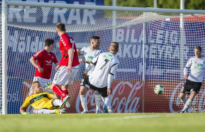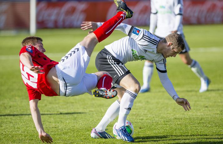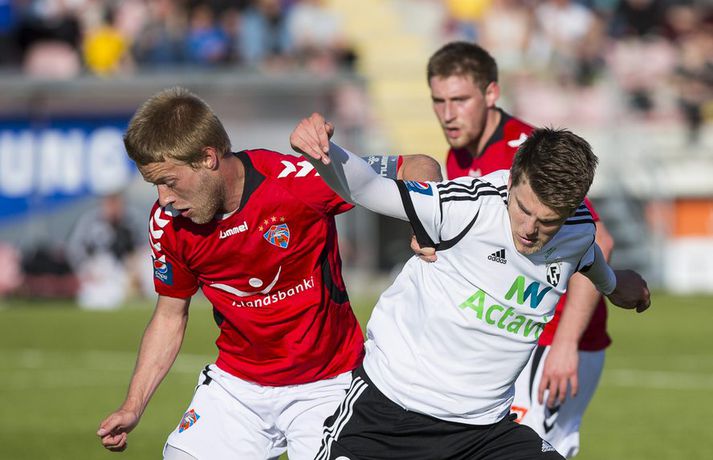Umfjöllun, viðtöl og einkunnir: Valur - FH 1-1 | Bragðdauft jafntefli Guðmundur Marinó Ingvarsson skrifar 30. júní 2013 18:10 Myndir / Vilhelm Gunnarsson Valur og FH skildu jöfn 1-1 í bragðdaufum leik þar sem Valur var mun sterkari aðilinn lengst af. Valur var 1-0 yfir í hálfleik. FH átti ekki eitt einasta skot að marki í fyrri hálfleik og Valur réð lögum og lofum á vellinum án þess þó að skapa sér mörg færi. Bjarni Ólafur Eiríksson skoraði eina mark fyrri hálfleiks eftir góða hornspyrnu Rúnars Más Sigurjónssonar en helst skapaðist hætta við góðar fyrirgjafir hans úr hornum í fyrri hálfleik. FH mætti mun ákveðnara til leiks í seinni hálfleik. Liðið barðist en engin barátta var í liðinu fyrstu 45 mínúturnar. Þrátt fyrir það var gerðist fátt markvert fram á við hjá FH framan af seinni hálfleik og Valur fékk frábært færi til að komast í 2-0 en Kolbeinn Kárason skaut hátt einn gegn Róberti rétt utan markteigs. FH refsaði Val grimmilega fyrir klúðrið þegar Ólafur Páll Snorrason opnaði vörn Vals með glæsilegri sendingu á Albert Brynjar Ingason sem hafði nægan tíma til að leggja fyrir sig boltann, horfa á markvörðinn og rúlla boltanum framhjá honum. Ólafur Páll bjó til annað færi skömmu seinna en Atli Guðnason náði ekki að nýta það og þar fór síðasta færi leiksins og jafntefli staðreynd. FH er enn í öðru sæti deildarinnar með 20 stig eins og Stjarnan, fimm stigum á eftir KR á toppnum. Valur er í 5. sæti með 16 stig. Heimir: Maður þarf að mæta á svæðið sjálfur„Ég held að ef maður lítur á leikinn heilt yfir þá held ég að við getum verið sáttir við jafntefli,“ sagði Heimir Guðjónsson þjálfari FH. „Valsmenn voru töluvert sterkari en við í fyrri hálfleik en náðu skora bara eitt mark. „Eftir að við skorum fannst mér við ná ágætis tökum á þessu og það voru ágætis möguleikar til að gera góða hluti og við fengum einhver færi en það vantaði að opna þá betur þannig að við getum verið sáttir við þetta stig,“ sagði Heimir sem hefur óneitanlega áhyggjur af því hve seinir FH-ingar eru í gang leik eftir leik. „Við lögðum það upp að reyna að byrja leikinn þegar dómarinn flautaði á en það virkaði ekki og við þurfum að athuga hvort við náum að breyta því. „Valsmenn gengu yfir okkur í fyrri hálfleik. Þeir stigu fram fyrir okkur, tóku af okkur boltann og unnu öll návígi. Það þýðir ekki að mæta á fótboltavöll og fylgjast með andstæðingnum taka boltann af manni. Maður þarf að mæta á svæðið sjálfur,“ sagði Heimir. Magnús: Yfirspiluðum FH„Ég er gríðarlega svekktur að hafa ekki náð að halda þetta út. Mér fannst við mikið betra liðið á vellinum. Við misstum einbeitingu í smá stund þar sem við héldum að það væri brotið á okkar leikmanni og þeir skora upp úr því. Fyrir utan það er ég mjög sáttur við mína menn,“ sagði Magnús Gylfason þjálfari Vals. „Við sundurspilum þá einu sinni og það er grátlegt að Kolbeinn skuli ekki setja hann. Við spiluðum þá upp úr skónum og vorum komnir inn að markteig og ég hélt að við værum að gera út um þetta þar,“ sagði Magnús um dauðafærið sem Kolbeinn Kárason fékk í seinni hálfleik. Magnús var ekki síður ósáttur við að Valur hafi ekki fengið aukaspyrnu í aðdraganda þess að FH jafnaði metin. „Kolbeinn er stinga boltanum framhjá og það er hlaupið inn í hann. Ég skil ekki að það sé ekki dæmt þó það sé einhver lína sem er búið að gefa. Þetta er púra brot. En ég ætla ekki að kenna dómaranum um þetta. Við klúðruðum þessu sjálfir. „Ég var heilt yfir ánægður með mína menn. Við áttum eins og ég segi að gera út um þetta. Að yfirspila FH á heimavelli er mjög gott. „Þeir komast inn í leikinn í korter. Þeir eru með leikreynt lið og ná að jafna á þeim tíma sem þeir eru inni í leiknum og það gera bara góð lið og FH er auðvitað með frábært lið,“ sagði Magnús að lokum. Pepsi Max-deild karla Mest lesið Spálíkan kippir okkur niður á jörðina fyrir EM Handbolti „Donald Trump er algjör hálfviti“ Sport „Búið að rífa úr honum stælana, egóið og hrokann“ Handbolti Sektaðir um hálfa milljón: Kane og þjálfarar þriggja liða borga mest Körfubolti „Hann hefði bara átt að kyngja þessu, vera stór og halda áfram úti“ Körfubolti Virtur handboltasérfræðingur spáir því að EM-bronsið fari til Íslands Handbolti KR í samstarf við akademíu í Gana Fótbolti Áhugamaður vann meistarann og milljón dollara Sport EM í dag: Sushi og sjónskekkja í Svíþjóð Handbolti Stjarnan - Keflavík | Stórleikur í Garðabæ Körfubolti Fleiri fréttir Trúin eykst á Suðurnesjum með komu McLaughlin Blikar farnir að fylla í skörðin Víkingur og Breiðablik mætast í fyrsta leik Bestu deildarinnar Rafael Máni eltir rætur sínar upp á Skaga Tveir ungir varnarmenn til FH Kristín Dís áfram í herbúðum Blika Miðbær Reykjavíkur er Íslandsmeistari Snýr aftur til Íslands og tekur við ÍBV Róbert með þrennu í sigri KR Fram lagði Leiknismenn Landsliðsbræður Palestínu sameinast í Keflavík Bikarhetjan til KA Þrótti berst mikill liðsstyrkur úr Keflavík Jón Guðni aðstoðar Ólaf Inga Blikarnir eru búnir að missa 34 mörk og 25 stoðsendingar Birta eltir ástina og semur við Genoa Júlíus Mar seldur til Kristiansund Bæði Blikaliðin fá sánuklefa fyrir komandi tímabil Feginn að vera fluttur heim úr fátækrahverfinu í Kína Svekktur að fá ekki leyfi til að taka við ÍBV Alfreð hættur hjá Breiðabliki Skipulagsbreytingar á skrifstofu KSÍ Nýliðarnir fá bandarískan markvörð Júlíus sagður á förum frá KR til Noregs Vestri opnar knattspyrnuakademíu í Senegal Valur fær Dana til að fullmóta 