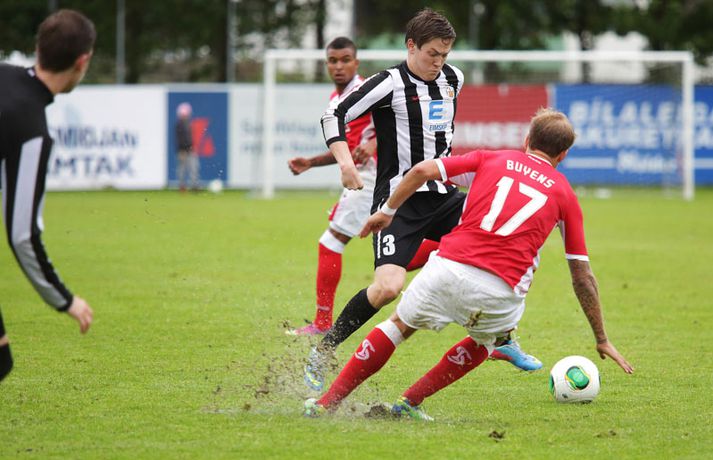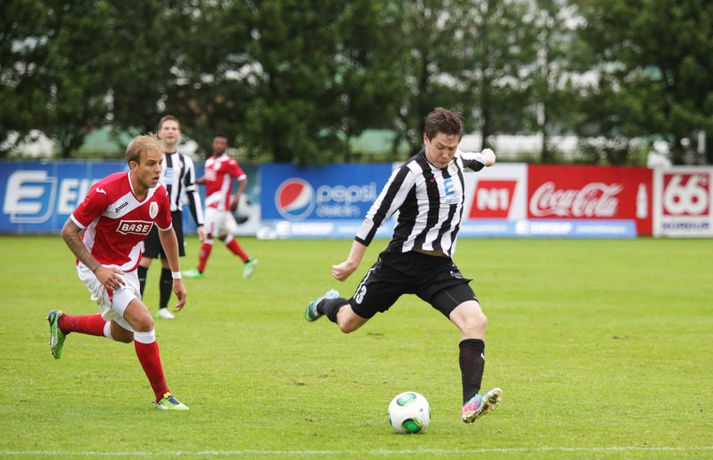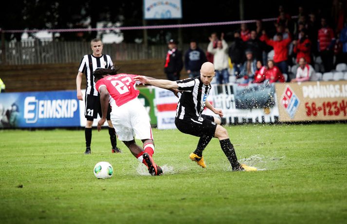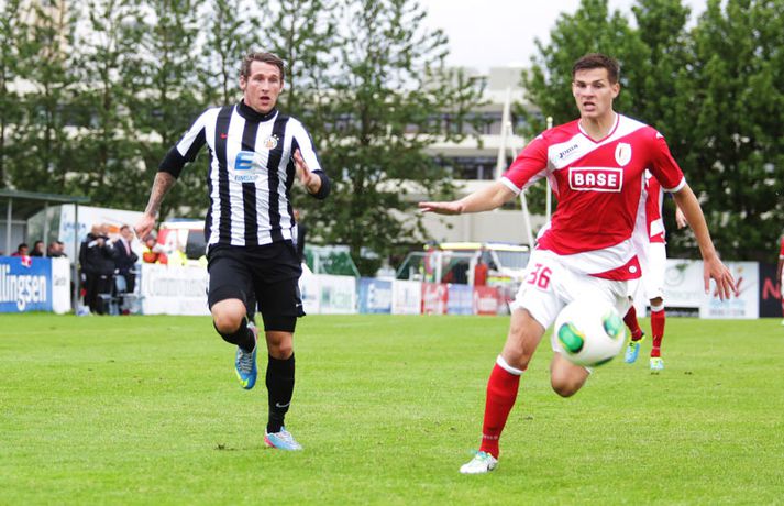 Umfjöllun, viðtöl og myndir: KR - Standard Liège 1-3 Kristinn Páll Teitsson skrifar 18. júlí 2013 15:07 Standard Liege reyndist KR-ingum of stór biti í 3-1 sigri Belganna í Frostaskjólinu í kvöld. Heimamenn náðu forskotinu í fyrri hálfleik en Belgarnir sigu fram úr í seinni hálfleik og unnu að lokum öruggan sigur. Fyrirfram var vitað að verkefnið yrði erfitt. Standard Liege endaði í sjötta sæti í Belgísku deildinni á síðasta ári og hefur verið virkur þáttakandi í Evrópukeppnum síðastliðin ár. Aðstæður voru erfiðar og áttu menn erfitt með að fóta sig á blautum vellinum og mikið um slakar sendingar í upphafi. KR-ingar náðu forskotinu eftir 35 mínútur, þá átti Guðmundur Reynir hættulega fyrirgjöf milli varnar og markmanns sem Kjartan Henry var fyrstur að átta sig á og vippaði boltanum yfir Eiji Kawashima. Rétt fyrir hálfleik náðu Belgarnir að jafna metin, á 44 mínútu fengu þeir hornspyrnu sem fór beint á ennið á Kanu, varnarmanni Standard sem var aleinn og skallaði boltann af öryggi í netið. Sofandiháttur í varnarleik KR-inga því Kanu var einn á auðum sjó í miðjum vítateignum. Eftir þetta fylgdi mikil pressa frá gestunum sem voru nálægt því að ná forskotinu fyrir hálfleik en heimamenn náðu að halda út. Gestirnir höfðu undirtökin í seinni hálfleik og náðu verðskuldað forskotinu eftir rúmlega korter í seinni hálfleik. Þá átti Mujangi-Bia fyrirgjöf sem fann Michy Batshuayi við vítateiginn. Michy náði að skapa sér pláss og skoraði með föstu skoti sem Hannes réði ekki við. Gestirnir gengu svo langt með að klára einvígið þegar þeir skoruðu þriðja markið á 90 mínútu. Dæmd var aukaspyrna við vítateigsbogann sem Paul-José Mpoku skrúfaði í hornið og tryggði sigurinn. Leiknum lauk því með 3-1 sigri Belganna sem gengu langt með að klára einvígið í kvöld. Leikmenn liðsins reyndust of sterkir fyrir heimamenn sem börðust hetjulega í kvöld og voru óheppnir að fá á sig þriðja markið sem gerir verkefnið í næstu viku gríðarlega erfitt. Rúnar: Komu okkur ekki á óvart„Ég er mjög ósáttur með að fá á mig mark bæði á lokamínútu fyrri og seinni hálfleiks, það gerir úrslitin frekar slæm fyrir okkur," sagði Rúnar Kristinsson, þjálfari KR eftir leikinn. „Þetta breyttist mikið í seinni hálfleik, við vorum mjög flottir í fyrri hálfleik og þeir voru oft ráðalausir í sínum leik. Hornspyrnan gefur þeim mark og svo fá þær færi rétt undir lokin, annað fengu þeir ekki í fyrri hálfleik," Jafnt var í hálfleik eftir að heimamenn náðu forskotinu eftir rúmlega hálftíma leik. „Við lékum vel í fyrri hálfleik og áttum skilið að fara inn í hálfleik með forystuna sem hefði eflaust breytt leiknum. Það dróg af okkur í síðari hálfleik og þeir gengu á lagið við það," Aðstæður voru erfiðar í kvöld, völlurinn var blautur og þungur og áttu menn oft í erfiðleikum með að ná upp góðu spili. „Það er alveg rétt, völlurinn var þungur og blautur og það seig svolítið í hjá okkur í seinni hálfleik. Það er búið að vera mikið álag á okkur en við börðumst alveg fram til lokamínútunnar, við reyndum að bæta í sóknina og tókum sénsa." „Við reyndum að sækja jöfnunarmarkið og fórnuðum okkur fram á völlinn þótt við vissum að við gætum fengið mark í andlitið. Maður vonaðist auðvitað til að sleppa með að fá á sig mark, 2-1 hefði verið allt önnur úrslit en 3-1 en strákarnir lögðu allt í þetta og ég er stoltur af þeim í kvöld," Rúnar sagði að KR-ingar hefðu verið vel undirbúnir fyrir leikinn og spilamennska Standard kom honum ekki í opna skjöldu. „Við vorum búnir að sjá nokkra leiki með þeim og þetta var svipað og þeir hafa verið að gera. Þótt það sé nýr þjálfari er þetta sama og þeir hafa verið að gera svo þeir komu okkur ekki mikið á óvart, þeir eru líkamlega sterkir og í góðu standi og leyfðu okkur lítið að spila boltanum," sagði Rúnar. Guy Luzon: Tek hatt minn ofan KR-ingum„Við byrjuðum leikinn ekki vel, við vorum hræddir, ekki nægilega vinnusamir og ekki nógu ákveðnir í fyrri hálfleik," sagði Guy Luzon, þjálfari Standard Liege eftir leikinn. „Í seinni hálfleik snerum við þessu við, við breyttum gangi leiksins og breyttum okkar spilamennsku. Við reyndum að spila boltanum eftir jörðinni og hratt og fengum færi til að skora. Við skoruðum þrjú mörk sem er glæsilegt og við verðum tilbúnir í næsta leik," Guy var hrifinn af spilamennsku KR-inga og hrósaði þeim sérstaklega fyrir fyrri hálfleikinn. „Þeir spiluðu vel, sérstaklega í fyrri hálfleik, ég tek hatt minn ofan fyrir þeim. Í seinni hálfleik vorum við aftur að spila eins og við viljum, spiluðum hraðari fótbolta og unnum sterkan sigur. Við verðum að bæta okkur fyrir seinni leikinn, við munum reyna að spila betri fótbolta og vinna leikinn," Aðstæður voru erfiðar í leiknum, völlurinn var blautur og var eitthvað um polla sem gerði mönnum erfitt fyrir að spila á milli sín. „Í fyrri hálfleik lentum við í miklum vandræðum með völlinn, við áttum í erfiðleikum með að spila boltanum meðfram jörðinni eins og við vildum. Í seinni hálfleik hætti að rigna og við gátum reynt að spila boltanum betur," sagði Guy að lokum. Grétar: Gefum þeim þrjú mörk„Þetta er fínt lið en við gefum þeim þrjú mörk og það er pirrandi að fara með þrjú mörk á okkur út," sagði Grétar Sigfinnur Sigurðsson, leikmaður KR eftir leikinn. „Við ætlum að fara út og reyna að vinna, gera okkar besta, spila fótbolta og hafa gaman. Hvort þetta sé búið í ár veit ég ekki, við ætlum allaveganna að sjá hvað gerist," Verkefnið verður erfitt fyrir KR-inga sem þurfa að eiga stórleik í Belgíu til að 