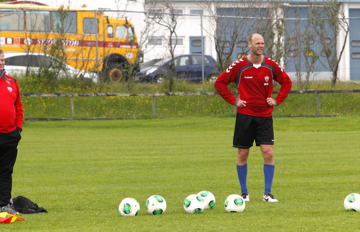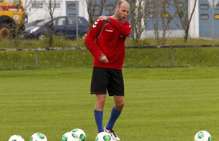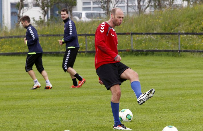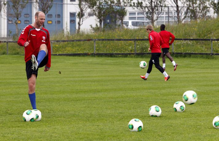 „Ég held að hann hafi klobbað einhvern,“ sagði Magnús Gylfason, þjálfari Vals, en Ólafur Stefánsson tók þátt í æfingu liðsins í dag. „Hann var nú reyndar bara á leið út að hlaupa og vildi vera með í reit. Það var nú ekkert flóknara en það,“ bætti Magnús við en sagði að Ólafur hefði sýnt góða takta. „Óli er góður í fótbolta - það er ekki spurning. Hann kemur jafnvel til greina í liðið fyrir næsta leik,“ sagði Magnús í léttum dúr. Pjetur Sigurðsson, ljósmyndari Vísis, kíkti við á Hlíðarenda og tók þessar myndir.