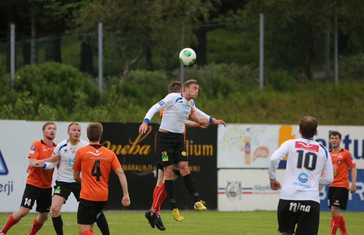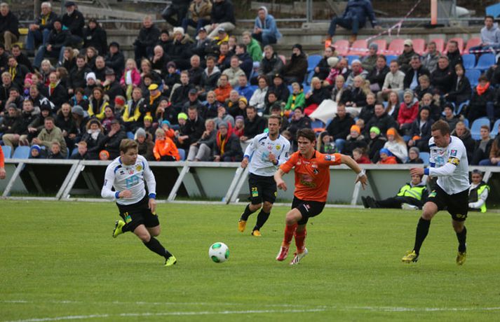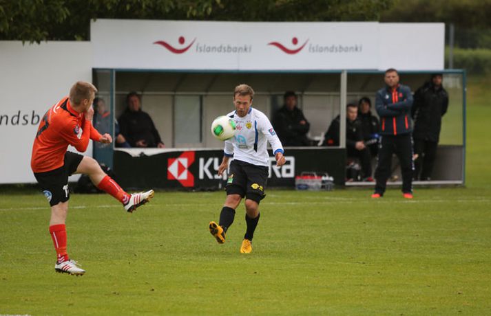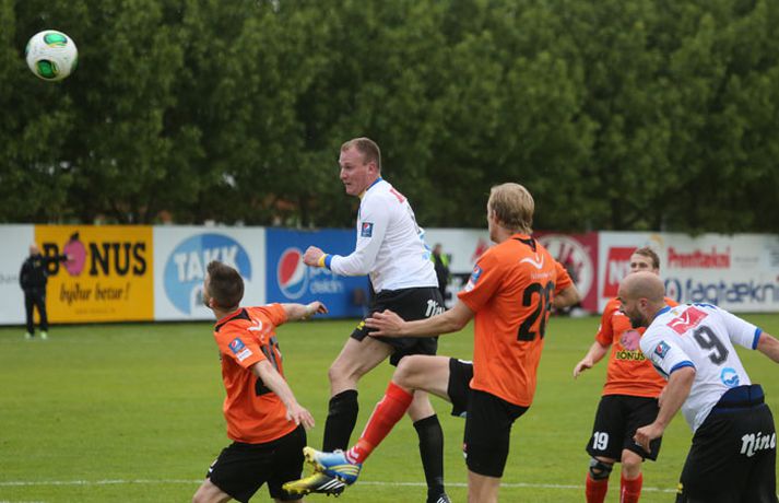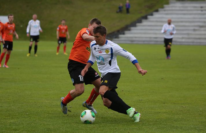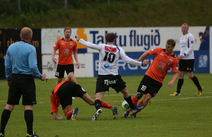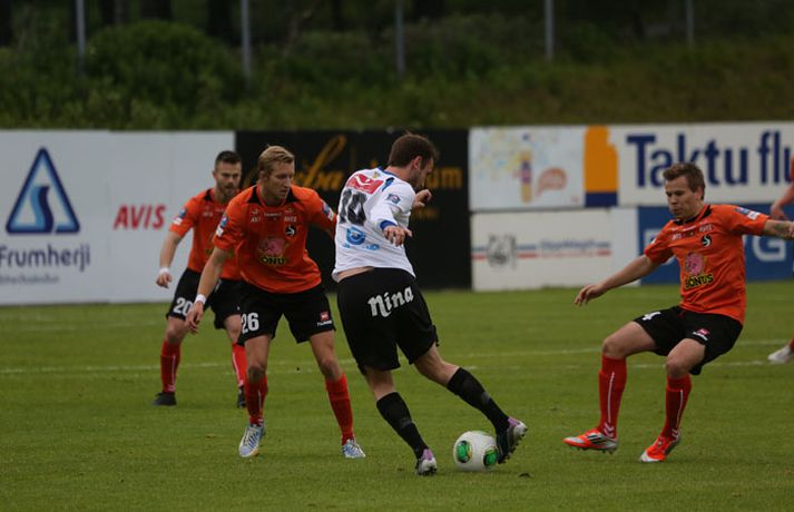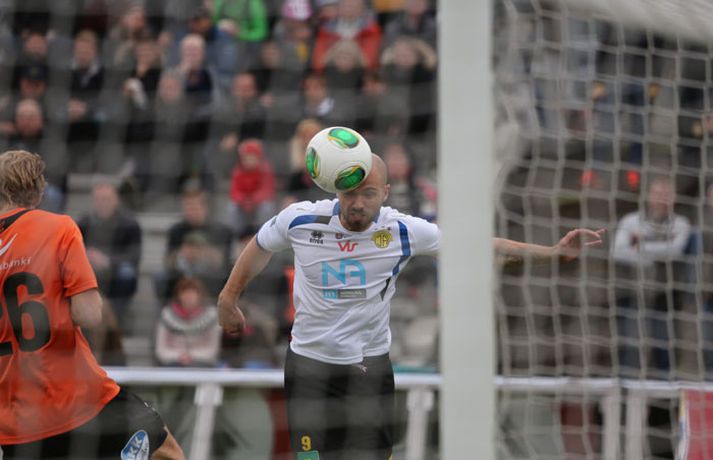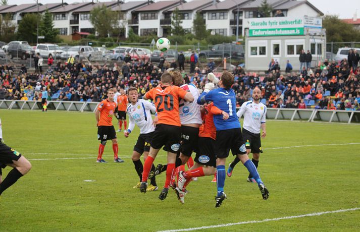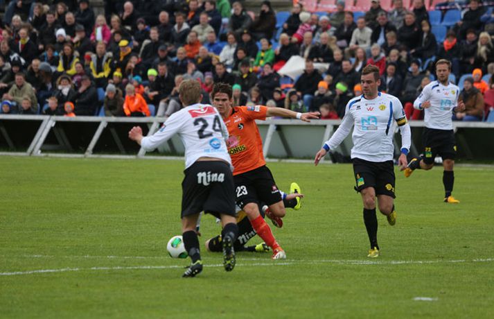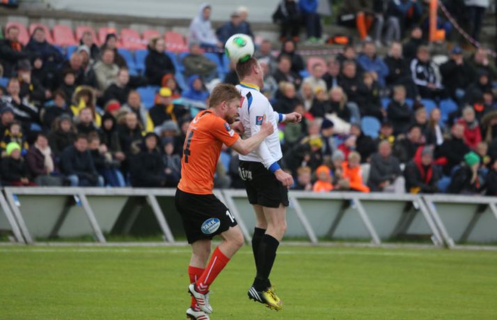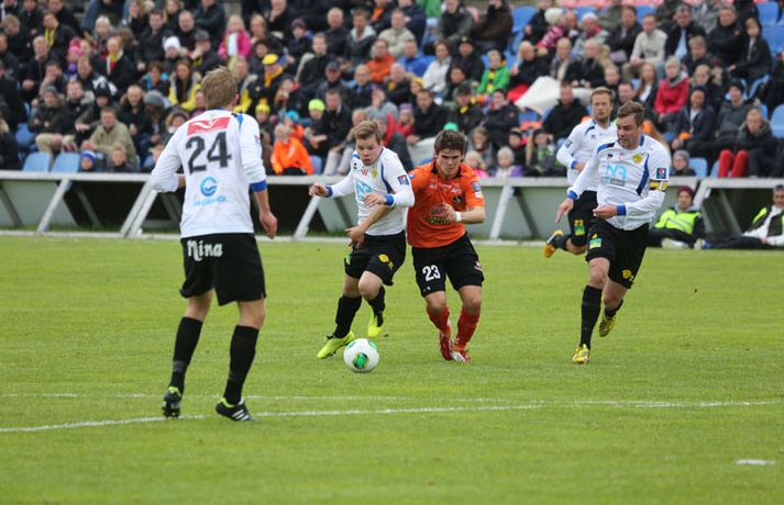 Umfjöllun, viðtöl, einkunnir og myndir: Fylkir - ÍA 1-1 Eiríkur Stefán Ásgeirsson skrifar 15. júlí 2013 15:58 Fylkir og ÍA skildu jöfn í botnslag Pepsi-deildar karla í Árbænum í viðburðarríkum leik í kvöld. Fylkismenn náðu að jafna á lokamínútunum þrátt fyrir að hafa misst mann af velli með rautt spjald í fyrri hálfleik. Tómas Þorsteinsson fékk tvær áminningar í fyrri hálfleik og þar með rautt. Skagamenn komust svo yfir með marki Ármanns Smára Björnssonar á 72. mínútu en Finnur Ólafsson skoraði gott jöfnunarmark fyrir heimamenn undir lokin. Þar með er ljóst að liðin eru enn jöfn að stigum í tveimur neðstu sætum deildarinnar með fjögur stig hvort. Fylkismenn eru enn að bíða eftir fyrsta sigri sínum í sumar en þetta var fyrsta stig liðsins á heimavelli í sumar. Þetta var einnig fyrsta stig Þorvalds Örlygssonar sem þjálfara ÍA. Fylkismenn voru sterkari aðilinn í fyrri hálfleik og duglegir að sækja upp báða vængina. Andrés Már og Ásgeir Örn voru sprækir og þá var Viðar Örn líklegur þegar hann fékk boltann við teig Skagamanna. Heimamönnum gekk þó á löngum köflum ekki nógu vel að skapa sér almennileg færi en þeir náðu þó að halda leikmönnum ÍA algjörlega í skefjum. Gestirnir áttu varla almennilegt færi í fyrri hálfleik og ekkert skot sem rataði í markið. Bakvörðurinn Tómas Þorsteinsson hafði verið duglegur að sækja fram og var misfljótur að skila sér til baka. Hann var ekki í stöðu þegar að Eggert Kári, hægri kantmaður Skagamanna, lagði af stað í sókn. Tómas, sem var með gult á bakinu, renndi sér í boltann en tók Eggert niður um leið. Erlendur Eiríksson, dómari, mat brotið svo að það verðskuldaði aðra áminningu og því var Tómas rekinn í sturtu. Fylkismenn voru ósáttir við þessa niðurstöðu enda virtist tæklingin ekki harkaleg. Fylkismenn fengu þó besta færi fyrri hálfleiksins eftir þetta. Andrés Már sótti aukaspyrnu á hættulegum stað og Árni Freyr átti gott skot að marki sem Páll Gísli varði í stöng. Skagamenn voru því stálheppnir að fara inn í leikhlé með markalausa stöðu. Skagamenn, í yfirtölu, tóku völdin hægt og rólega í seinni hálfleik. Garðar Gunnlaugsson kom boltanum í netið strax á 51. mínútu en það var dæmt af vegna brots á Bjarna Þórði, markverði Fylkis. Bjarni var svo í aðalhlutverki næstu mínúturnar og varði nokkrum sinnum glæsilega frá gestunum. Fylkismenn reyndu að sækja inn á milli en sköpuðu sér lítið meira en nokkur hálffæri. Það kom svo að því að ísinn brotnaði. Bakvörðurinn Joakim Wrele fékk góða sendingu á vinstri kantinum og lagði boltann fyrir markið með fastri sendingu. Ármann Smári var þar mættur á fjærstöng og sendi boltann í markið. Fylkismenn gáfust þó ekki upp og náðu að vinna sig aftur inn í leikinn eftir þetta. Skagamenn ætluðu greinilega að verja stöðuna en pressa heimamanna bar á endanum árangur. Fylkir fór í sókn á 86. mínútu sem hófst úti á vinstri kantinum. Boltinn barst þar inn á teig en Skagamenn lentu í vandræðum með að hreinsa frá. Finnur tók boltann til sín, lék framhjá tveimur varnarmönnum og afgreiddi knöttinn snyrtilega í netið. Fylkir hefði svo getað tryggt sér sigur í uppbótartíma en Páll Gísli varði tvö skot í sömu sókninni. Eftir það fjaraði leikurinn út og liðin þurftu því að sættast á skiptan hlut.Viðar Örn: Ég hef ekkert fengið eftir viðtalið við þjálfara KR „Þetta var ágæt niðurstaða úr því sem komið var en mér fannst bara eitt lið vera á vellinum í kvöld,“ sagði sóknarmaðurinn Viðar Örn Kjartansson eftir 1-1 jafntefli Fylkis og ÍA í kvöld. „Þeir áttu ágætar 20 mínútur en heilt yfir fannst mér þeir vera að reyna að drepa leikinn. Ég veit hreinlega ekki hvað þeir voru að gera,“ sagði hann. „Jafntefli var kannski sanngjarnt úr því sem komið var en við hefðum getað stolið þessu í lokin.“ Tómas Þorsteinsson fékk tvær áminningar í fyrri hálfleik og þar með rautt. Viðar segir ákvörðun dómarans umdeilanlega. „Mér fannst þetta nokkuð „soft“ og kannski klaufalegt hjá okkur. Þeir komust upp með ýmsilegt í leiknum og það má deila um fleiri atvik.“ Leikurinn í kvöld var ekki sá fyrsti í sumar þar sem að Fylkismenn spila betur en úrslitin gefa til kynna. „Mér finnst dæmigært að hafa fengið rautt spjald og svo mark í andlitið í seinni þegar við vorum búnir að vera betri í fyrri hálfleik.“ „Þetta hlýtur að vera eitthvað sálrænt því undir venjulegum kringumstæðum ættum við að vera búnir að skora í fyrri hálfleik. Við verðum að takast á við það - það gerir það enginn annar.“ Viðar Örn fékk gult spjald fyrir leikaraskap í leiknum og hann var ekki ánægður með þann dóm Erlendar Eiríkssonar dómara. „Kári Ársælsson stígur mig út. Ég fékk boltann óvænt og var ekki í neinu jafnvægi. Þetta var því ekki neitt og ég sagði dómaranum það. Samt gefur hann mér gult spjald.“ „Þetta er bara grín. Ég hef varla fengið aukaspyrnu eftir viðtalið við þjálfara KR. Ég var bombaður niður fyrir utan teig í fyrri hálfleik en dómarinn lét leikinn halda áfram.“ „Ég get ekki sagt neitt og skil þetta hreinlega ekki. En ég verð bara að halda áfram.“Þorvaldur: 1-0 forysta á að vera nóg „Miðað við það sem við vorum komnir með í hendi þá er ég ekki ánægður með þessa niðurstöðu,“ sagði Þorvaldur Örlygsson, þjálfari ÍA, eftir leikinn. „En við vorum líka þokkalega heppnir að fá ekki á okkur mark í lokin. En heilt yfir gekk þetta þokkalega vel og leikurinn þróaðist eins og við vildum. Það vantaði bara að klára þetta.“ Garðar Gunnlaugsson skoraði mark í upphafi síðari hálfleiks sem var 
