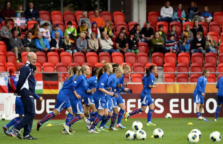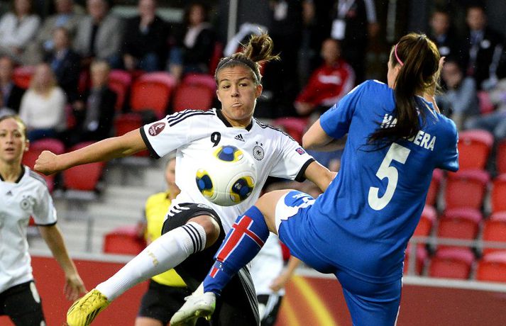 Umfjöllun, viðtöl og einkunnir: Ísland - Þýskaland 0-3 | Aldrei möguleiki gegn Þjóðverjum Óskar Ófeigur Jónsson í Växjö skrifar 14. júlí 2013 00:01 Þjóðverjar fagna marki í leiknum í kvöld. Nordicphotos/AFP Íslenska kvennalandsliðið tapaði 0-3 á móti Evrópumeisturum Þýskalands í Vaxjö í kvöld í öðrum leik liðsins á EM í Svíþjóð. Þetta var langt og erfitt kvöld fyrir íslensku stelpurnar en markvörðurinn Guðbjörg Gunnarsdóttir sá til þess að þýsku mörkin urðu aðeins þrjú. Íslensku stelpurnar voru bara númeri of litlar fyrir þær þýsku í kvöld en þrátt fyrir slæmt tap á liðið enn möguleika á að komast áfram í átta liða úrslitin. Þýska liðið var reyndar smá tíma í gang í leiknum en svo jókst pressan með hverri mínútu eftir að þær þýsku fundu taktinn. Það er hægt að skrifa fyrstu tvö mörkin á varnarmistök en frábær markvarsla Guðbjargar sá til þess að flestar bestu sóknir þýska liðsins enduðu ekki með marki. Guðbjörg varði hvað eftir annað í fyrri hálfleiknum þar á meðal frábært skot Célia Okoyino da Mbabi, stórhættulegan skalal í slá og þrjú skot í röð á nokkrum sekúndum. Í fyrsta markinu sofnuðu íslensku stelpurnar illilega á verðinum. Dzsenifer Marozsan fékk of mikinn tíma á boltanum á miðjunni og stakk knettinum aftur fyrir Hallberu sem var of sein að átta sig. Lena Lotzen kláraði færið mjög vel. Annað markið sitt fengu þær þýsku hinsvegar á silfurfati þegar Hólmfríður Magnúsdóttir tapaði boltanum fyrir framan teiginn. Guðbjörg varði fyrra skotið en kom engum vörnum við þegar Célia Okoyino da Mbabi setti frákastið í markið. Markið átti líklega aldrei að standa enda mikil rangstöðulykt af því. Katrín Ómarsdóttir kom inn á miðjuna í hálfleik og boltinn stoppaði aðeins á miðjunni til að byrja með en síðan tóku þær þýsku öll völd aftur. Katrín fór síðan að kvarta fljótlega undan tognun aftan í læri og entist á endanum aðeins í 25 mínútur. Það hlaut samt að koma að því að þýska liðið fyndi leiðina í markið framhjá Guðbjörgu og Célia Okoyino da Mbabi bætti við sínu öðru marki rétt fyrir leikslok og setti um leið nýtt markamet í einu Evrópumeistaramóti. Þessi úrslit breyta ekki því að íslenska liðið á enn möguleika á því að komast áfram í átta liða úrslitin og leikurinn á móti Hollandi á miðvikudaginn kemur mun eins og flestir bjuggust við ráða örlögum íslensku stelpnanna í keppninni. Þar skipti miklu máli að þýsku mörkin urðu "bara" þrjú því stærra tap hefði gert markatöluna að óvin á lokadegi riðilsins. Þýska liðið gat nefnilega auðveldlega skorað miklu fleiri mörk í kvöld slíkir voru yfirburðirnir. Íslenska liðið á enn möguleika en liðið þarf að spila allt annan og miklu betri leik á móti því hollenska. Markatalan þýðir líka að íslenska liðið verður að vinna Holland til þess að eiga mögulega - jafntefli dugar ekki lengur eftir þetta tap í kvöld. Guðbjörg: Enginn markmaður ánægður með að fá á sig þrjú mörkNordicphotos/AFP„Ég bjóst ekki við því að Þjóðverjar yrðu með svona ótrúlega mikla yfirburði. Ég bjóst að við myndum gefa þeim meiri mótspyrnu en þetta var mjög erfitt. Við ætluðum að reyna að halda núllinu sem lengst en vendipunkturinn var samt annað markið. Á meðan það var 1-0 þá trúir maður alltaf því þá þarf svo lítið til að jafna," sagði Guðbjörg. „Þegar það var komið 0-2 og lítið gekk upp sóknarlega þá misstum við hausinn. Þegar þú missir hausinn þá er þetta búið," sagði Guðbjörg en hún átti stórleik í íslenska markinu og bjargaði því að liðið fékk ekki stóran skell. „Ég þekki ekki neinn markmann sem er ánægður með leik þar sem hann fær á sig þrjú mörk. Það er mjög erfitt að fara kokhraust héðan. Ég verð samt að hugsa jákvætt og að ég hafi gert eitthvað jákvætt í leiknum svona á meðan ég fer yfir öll mörkin sem ég fékk á mig. Ég þarf að horfa á einhverjar markvörslur líka svo að ég haldi nú sjálfstraustinu fyrir næsta leik," sagði Guðbjörg. „Þetta er alls ekki búið. Ég var að heyra það inn í klefa að við þyrftum núna að vinna Holland en þannig er það bara. Við erum upp við vegg og það er pressa á okkur. Við þurfum bara að vinna út úr því eins og atvinnumenn. Við þurfum bara að vinna þær," sagði Guðbjörg. „Við vorum að spila þennan leik og ég þarf að nota kvöldið í það að svekkja sig. Strax og við vöknum í fyrramálið þá förum við að einbeita okkur að Hollandi. Það er mjög jafn leikur því þær eru alls ekki betri en við," sagði Guðbjörg um framhaldið. „Ég held að Ísland og Holland séu mjög svipuð lið. Við spilum svolítið öðruvísi fótbolta en ég held að þetta séu svipuð lið að styrkleika. Við eigum alla möguleika að vinna ef að við náum góðum leik," sagði Guðbjörg. Sigurður Ragnar: Gæðamunurinn á liðunum var of mikillÞjóðverjar fagna.Nordicphotos/Getty„Þær voru mjög góðar í dag og við vorum í basli á móti þeim á stórum köflum í leiknum. Við reyndum að verjast vel en í sóknarleiknum náðum við ekki að búa mikið til. Gæðamunurinn á liðuinum var of mikill," sagði Sigurður Ragnar Eyjólfsson, þjálfari íslenska liðsins. „Þýska liðið spilaði mjög vel í dag og var miklu betra en á móti Hollandi. Svo gæti líka verið að Holland hafi spilað virkilega vel á móti þýska liðinu. Vonandi getum við tekið Hollendingana. Við erum að fara í úrslitaleik á móti þeim um að komast í átta liða úrslit. Við getum náð markmiðinu okkar ennþá og þurfum sigur í þeim leik," sagði Sigurður Ragnar. „Guðbjörg varði rosalega vel of
