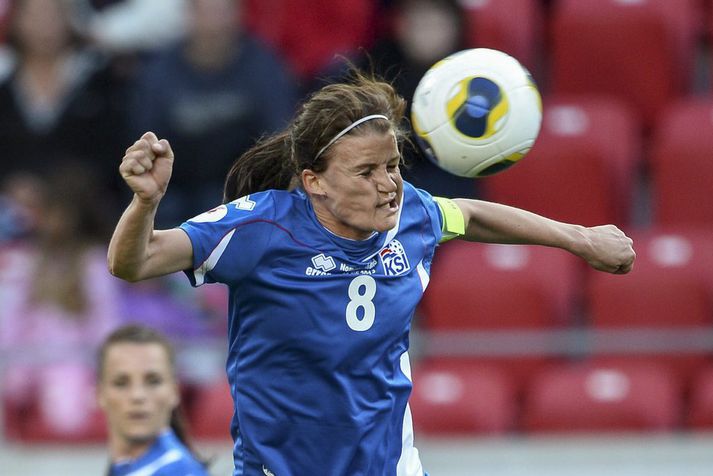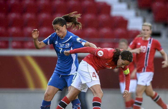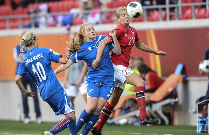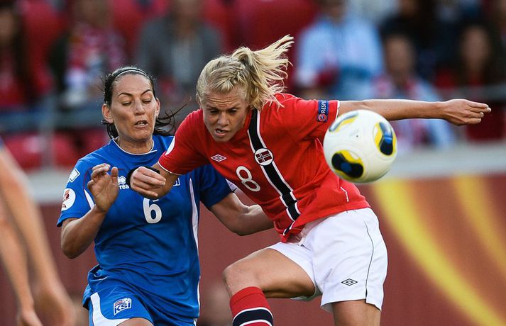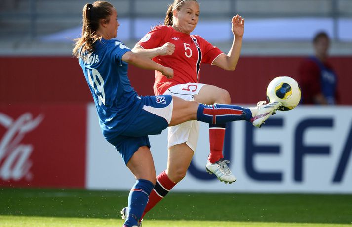 Margrét Lára Viðarsdóttir tryggði Íslandi sögulegt stig þegar að hún skoraði jöfnunamark liðsins gegn Noregi á EM kvenna í Svíþjóð í kvöld. Norðmenn höfðu komist yfir í fyrri hálfleik en stelpurnar voru mun öflugir í síðari hálfeik og uppskáru jöfnunarmark eftir að brotið var á Söru Björk Gunnarsdóttir í vítateig norska liðsins. Ísland mætir næst Evrópumeisturum Þýskalands á sunnudag en Þýskaland gerði jafntefli við Holland, 0-0, í hinum leik dagsins í B-riðli. Reyndar hefur öllum fjórum leikjum keppninnar til þessa lokið með jafntefli. Myndasyrpu úr leik Íslands og Noregs má sjá hér fyrir ofan.