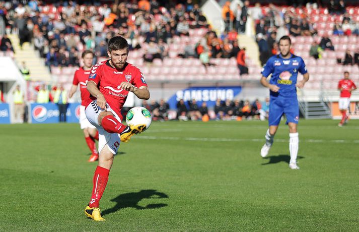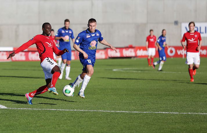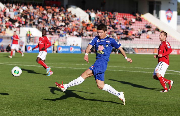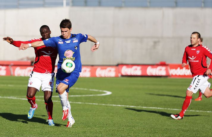 Umfjöllun, viðtöl og einkunnir: Valur - Fylkir 1-3 | Árbæingar úr botnsætinu Kolbeinn Tumi Daðason skrifar 21. júlí 2013 12:52 Fylkismenn fóru á kostum þegar þeir skelltu Valsmönnum 3-1 á Hlíðarenda í 12. umferð Pepsi-deildar karla í kvöld. Ásgeir Börkur Ásgeirsson fór fyrir liði gestanna í sínum fyrsta leik eftir heimkomuna frá Noregi. Eftir jafnar upphafsmínútur tóku Árbæingar völdin. Ásgeir Börkur fór fyrir liðinu í baráttu en aðrir leikmenn liðsins sýndu lipra takta og buðu á tíðum upp á frábæran fótbolta. Viðar Örn Kjartansson náði forystunni fyrir Fylkismenn um miðjan fyrri hálfleikinn. Viðar kláraði færi sitt vel eftir undirbúning Elís Rafns. Þeir félagar áttu eftir að taka höndum saman oftar í leiknum. Stundarfjórðungi síðar kom rothöggið sem Valsmenn jöfnuðu sig aldrei á. Saklaus sending frá Oddi Inga Guðmundssyni virtist fara í gegnum Matarr Jobe og Andrés Már Jóhannesson þakkaði pent fyrir sig. Forysta Fylkis tvö mörk í hálfleik og aðeins eitt lið á vellinum og einnig í stúkunni. Stuðningsmenn Árbæjarliðsins hafa ekki haft mjög tilefni til að brosa í sumar en í kvöld var gaman að vera Fylkismaður. Viðar Örn fékk dauðafæri áður en hann innsiglaði sigur Fylkis á 59. mínútu eftir undirbúning Elísar Rafns. Enn svaf vörn Valsmanna á verðinum en andartökum áður hafði Magnús Gylfason gert tvöfalda skiptingu til að hafa áhrif á gang leiksins. Annar varamannanna, Indriði Áki Þorláksson, minnkaði muninn eftir fallega sendingu Kristins Freys á 83. mínútu. Fylkismenn voru ósáttir enda virtust þeir eiga að fá aukaspyrnu í aðdraganda marksins. Markið skipti þó engu máli hvað fögnuð Árbæinga tíu mínútum síðar snerti. Árbæingar hlupu til stuðningsmanna sem sungu og trölluðu. Þrjú stig í húsi og flugferð úr tólfta sæti deildarinnar upp í það níunda staðreynd. Innkoma Ásgeirs Barkar hafði mikið að segja en einnig var fróðlegt að fylgjast með Agnari Braga Magnússyni í hlutverki fremsta miðjumanns. Agnar Bragi vann hvern skallaboltann á fætur öðrum og varnarmaðurinn lék á alls oddi framar á vellinum en vanalega. Agnar Bragi hefur átt við meiðsli að stríða í langan tíma og endurkoma hans kærkomin. Valsmenn sáu aldrei til sólar og þurfa að fara í alvarlega naflaskoðun eftir tvo slaka leiki í röð. Hafa verður í huga að lykilmenn liðsins á miðjunni eiga við meiðsli að stríða sem hjálpar þeim ekki. Rúnar Már Sigurjónsson verður frá keppni í nokkrar vikur til viðbótar en auk þeirra eru Haukur Páll Sigurðsson og Iain Williamson að jafna sig á meiðslum. Englendingurinn Daniel Racchi komst aldrei í takt við leikinn frekar en flestir Valsmenn. Ásmundur Arnars: Beðið eftir að liðið springi út„Loksins, loksins, loksins. Það var virkilega gaman að fara inn í klefa í dag. Þetta var frábær dagur,“ sagði Ásmundur Arnarsson þjálfari Fylkis. Hann sagðist hafa verið að bíða eftir spilamennsku sem þessari í allt sumar, að liðið springi út. „Við fáum Ásgeir Börk heim og það kemur góð stemmning í kringum hann og mikil vinnsla. Við höfum spilað vel á köflum í sumar en vantað herslumun til að klára dæmið. Hann kom í dag og við hefðum getað unnið stærra ef eitthvað var,“ sagði Ásmundur. Ýmislegt hefur gengið á hjá Fylki í sumar og spurning hvort farið hafi um Ásmund þegar Valsarar minnkuðu muninn. „Kannski eitthvað smá en samt ekki. Mér fannst við vera með þetta allan tímann. Það fór meira um mig þegar Ásgeir Börkur lenti á hnénu hérna. Að öðru leyti leið mér þokkaleg vel í leiknum,“ sagði Ásmundur. Hann vonast eftir því að seinni hluti Íslandsmótsins verði betri hjá Fylkismönnum en sá fyrri. Magnús Gylfa: Í fyrsta skipti lélegra liðið í sumar„Leikur okkar var ekki nógu góður. Við vorum lélegir og töpuðum sannfærandi,“ sagði Magnús Gylfason þjálfari Valsmanna. Hann sagði að erfitt hefði verið að finna lausnir eftir 0-0 jafntefli gegn Víkingi frá Ólafsvík í síðustu umferð. „Já, sérstaklega þegar menn voru að tínast útaf alveg fram á síðustu mínútu. Við áttum von á því að Haukur yrði búinn að jafna sig og jafnvel Williamson. Það er auðvitað skarð fyrir skildi að öll miðjan er farin.“ Magnús sagði sína menn hafa byrjað ágætlega í leiknum, haldið boltanum innan liðsins og verið klárir á flestum sviðum. „Svo kom fyrsta markið og þá virtust menn hreinlega gefast upp, eða gefa eftir, og gáfu fleiri mörk. Þá fór þetta versnandi,“ sagði Magnús. Aðspurður um frammistöðu nýja leikmanns Vals, Daniel Racchi, sagðist Magnús ekki vilja tjá sig um einstaka leikmenn. „Mér er alveg sama hvort einn sé góður og annar ekki. Liðið þarf að vinna leiki,“ sagði Magnús. Sömuleiðis vildi hann lítið ræða um Ný-Sjálendinginn sem liðið samdi við á dögunum en yfirgaf landið skömmu eftir komuna til landsins. „Ég hef minnstar áhyggjur af því núna. Engar eiginlega,“ sagði Magnús. Hann segir lítið að frétta í framherjaleitinni en hún standi vissulega yfir. Hann segir Valsara þurfa að taka fyrsta tapinu á heimavelli eins og menn. „Heilt yfir vil ég meina að þetta sé fyrsti leikurinn í sumar sem við erum lélegra liðið. Þetta hefur verið kaflaskipt en ég held að þessi leikur verði að dæma sig sjálfur. Við verðum að láta okkur þetta að kenningu verða.“ Magnús reiknar með fjarveru Rúnars Más Sigurjónssonar í mánuð að minnsta kosti vegna tognunar aftan í læri. Ásgeir Börkur: Gæjarnir á miðjunni voru frábærirÁsgeir Börkur Ásgeirsson fór á kostum í liði Fylkis í kvöld. Hann sagði sigur sinna manna verðskuldaðan. „Gæðin voru til staðar í dag sem og sjálfstraustið. Mér fannst Valsmenn aldrei kom