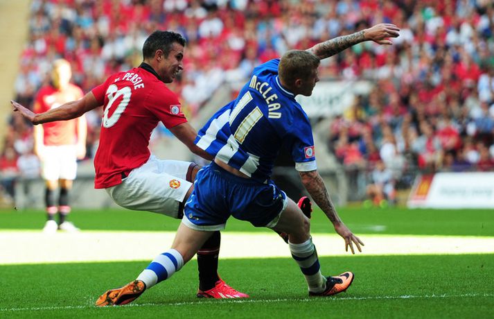 Manchester United vann nokkuð þægilegan 2-0 sigur á Wigan í leiknum um Samfélagsskjöldinn á Wembley í dag. David Moyes hefur því landað sínum fyrsta titli í starfi sem knattspyrnustjóri Mancheser United. Wigan náði óvænt að leggja nágranna United, Manchester City í bikarúrslitaleiknum á síðasta tímabili þrátt fyrir að falla úr úrvalsdeildinni. Það var hinsvegar aldrei neitt óvænt í myndinni í dag. Robin Van Persie, markakóngur síðasta tímabils, skoraði fyrsta mark leiksins eftir rúmlega sex mínútur með góðum skalla eftir fyrirgjöf frá Patrice Evra. Van Persie skoraði annað mark leiksins þegar tæplega korter var búið af seinni hálfleik. Þá fékk Hollendingurinn boltann við vítateigslínuna en skot hans hrökk af varnarmanni og framhjá Scott Carson í marki Wigan. United menn fóru aldrei úr öðrum gír í leiknum en unnu nokkuð sannfærandi. Sigurinn var kærkominn eftir brösugt gengi á undirbúningstímabilinu þar sem þeir unnu aðeins tvo leiki af sjö. Þetta var síðasti leikur liðsins áður en deildin byrjar næstu helgi þar sem þeir ferðast til Wales og mæta Swansea í fyrstu umferð.