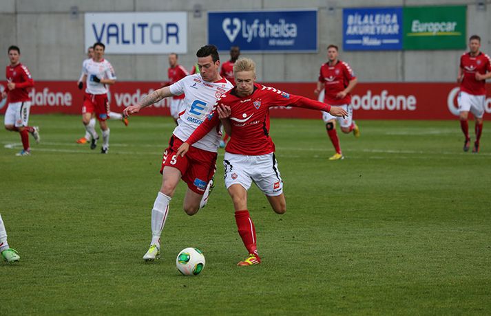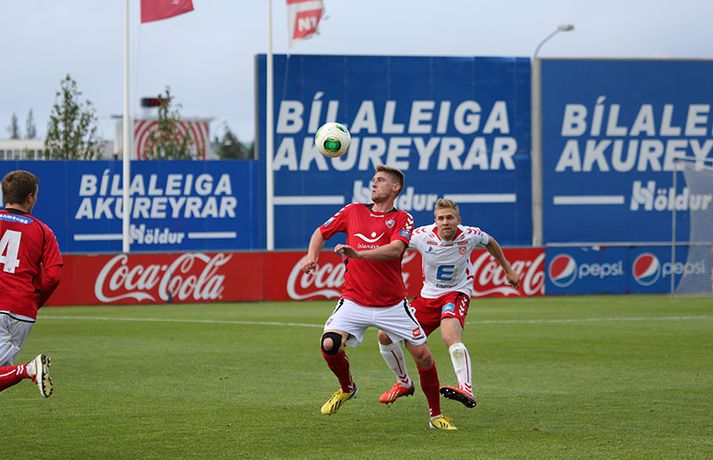 Umfjöllun, viðtöl, einkunnir og myndir : Valur - Þór 2-2 | Tíu Valsmenn héldu út Guðmundur Marinó Ingvarsson skrifar 25. ágúst 2013 12:40 Myndir / Daníel Rúnarsson Valur og Þór gerðu 2-2 jafntefli á Vodafone vellinum í kvöld. Þór var 1-0 yfir eftir bragdaufan fyrri hálfleik en mikið fjör var í þeim seinni en Valsmenn voru einum færri í tæpan hálftíma. Valsmenn byrjuðu leikinn betur en Þór náði að vinna sig inn í leikinn er leið á hálfleikinn og voru mun sterkari seinni hluta fyrri hálfleiks og komust verðskuldað yfir þegar Mark Tubæk skoraði á 37. mínútu eftir laglegan samleik í teig Vals. Valsmenn komu mjög ákveðnir út í seinni hálfleik og jafnaði Matarr Jobe metin strax á 49. mínútu. Þór tók miðju, lék upp vinstri vænginn og Jóhann Helgi Hannesson skallaði boltann í netið þó skallinn hafi verið svo gott sem beint á Fjalar Þorgeirsson markvörð Vals. Fjörið var ekki búið því átta mínútum síðar jafnaði Valur metin á nýjan leik. Patrick Pedersen skoraði þá eftir glæsilegan samleik í teig Þórs. Mínútu síðar fékk Daniel Craig Racchi gula spjaldið og tveimur mínútum síðar fékk hann annað gult spjald og Valsmenn því einum færri í tæpan hálftíma. Valsmenn náðu að loka vel á Þór einum færri en samt sem áður þurfti Fjalar að verja í tvígang og bjargaði þar stigi fyrir Val. Þetta var þriðja jafntefli Þórs í röð en liðið er þremur stigum frá fallsæti í þéttum pakka í botnbaráttunni. Valur er með 25 stig í 5. sæti, með öruggt sæti í deildinni og búið að missa af toppbaráttunni. Magnús: Svona hefur ekki gerst í yngri flokkum„Við ætluðum okkur sigur hér á heimavelli og erum gríðarlega svekktir með þetta,“ sagði Magnús Gylfason þjálfari Vals. „Fyrri hálfleikur var jafn. Við byrjuðum leikinn ágætlega en duttum svo niður og þeir komast inn í leikinn og komast yfir. Við rifum okkur upp af rassgatinu í seinni hálfleik og náðum að jafna. „Það gerist eitthvað ótrúlegt sem ég fatta ekki. Þeir spila boltanum inn í okkar eigið mark án þess að við snertum hann aftur. Það hefur aldrei gerst, ekki einu sinni í yngri flokkum þegar ég hef þjálfað. Þetta óskiljanlegt mark að mínu viti en svona gerast hlutirnir. Við héldum áfram og spiluðum seinni hálfleikinn ágætlega en þetta er ekki í þeim gæðaflokki sem ég ætlast til að Valsliðið sé. „Ég var gríðarlega svekktur með að fá rautt spjald. Menn eiga að geta spilað með gult á bakinu. Hann er óheppinn þegar hann fær seinna gula spjaldið. Leikmaður Þórs rekur hælana í hann en hann var allt of nálægt honum. Hann var æstur á þessum tíma og hefði átt að róa sig en hann var ekki að sparka einhvern niður eða hlaupa á eftir mönnum eða stökkva með tvær fætur á undan sér. Hann fékk bara einhver tvö gul spjöld og við verðum að sætta okkur við það,“ sagði Magnús sem gat ekki notað Hauk Pál Sigurðsson vegna meiðsla í dag. Annar miðjumaður Iain James Williamson fór meiddur af leikvelli undir lok fyrri hálfleiks. „Þetta er staðan sem við höfum verið í í sumar, að ströggla með miðjumenn. Þeir eru seldir og meiddir. Þeir fá spjöld, gul og rauð og allan pakkann. Við verðum að skoða það fyrir næsta leik, það er stutt í næsta leik sem betur fer. Það er gott að það sé stutt í næsta leik þegar maður er svekktur og lítill tími til að velta hlutunum of mikið fyrir sér. „Williamson verður ekki með gegn KR en við getum vonandi tjaslað Hauki Páli saman,“ sagði Magnús. Páll: Fórum aftur til fortíðar og börðumst„Ég er búinn að telja upp að tíu og þetta er klárlega eitt stig unnið fyrir okkur,“ sagði Páll Viðar Gíslason þjálfari Þórs. „Leikurinn gat dottið okkar megin, það er ekki spurning. Við vorum ekki alveg nógu graðir en hann bjargaði þeim á loka mínútunum. Að sama skapi hleyptum við þeim í aksjón í hinum teignum. Fyrirfram hefði ég tekið stigið miðað við söguna, okkur hefur gengið erfiðlega með Val,“ sagði Páll en Þór hefur ekki unnið Val í deildarkeppni síðan í júní 1994. „Það sem ég tek út úr þessu er að Þórsliðið barðist hver fyrir annan hér í kvöld. Menn gerðu það sem fyrir var lagt en við erum ennþá að glíma við einstaklings mistök sem eru að kosta okkur mikið. Heilt yfir er ég sáttur við leik okkar í kvöld og það hefði ekki þurft miklu að muna til að við næðum þremur stigum. „Við náðum að klára, tvær, þrjár sóknir sem markmaðurinn varði mjög vel. Það stóð tæpt en við fengum líka á okkur færi einum fleiri og erum kannski ekki nógu graðir fram á við en auðvitað verðum við að virða stigið sem við erum með og vera ekki of æstir fram á við. „Við erum í harðri baráttu og nú erum við í þeim kafla þar sem við mætum þessum liðum sem við reyttum stig af í fyrri umferðinni. Liðin sem eru í kringum okkur eins og Víkingur Ólafsvík og Fylkir. Við erum með fjögur stig á móti þessum liðum og eigum eftir að mæta þeim fleirum. Þetta eru stóru stigin þó við teljum okkur eiga efni á að stríða honum liðunum líka. Það er ekki svo að við séum að fara í þá með hangandi haus. Það sást í kvöld að okkur langaði mikið til að fá þrjú stig en það tókst ekki. Ég er ánægður að við fórum aftur til fortíðar og börðumst á kostnað kannski knattspyrnunnar og við fengum stig. Við það er ég sáttur,“ sagði Páll. Pepsi Max-deild karla Mest lesið Guðmundur svekktur eftir sniðgöngu: „Finnst þetta skammarlegt“ Handbolti Hlaupabrettið kemst ekki upp í hraða Baldvins Sport Skotinn til bana í jarðarför móður sinnar Fótbolti Skipti Orra inn og út á nokkrum mínútum: „Óásættanlegt“ Fótbolti Mætum „Napóleon