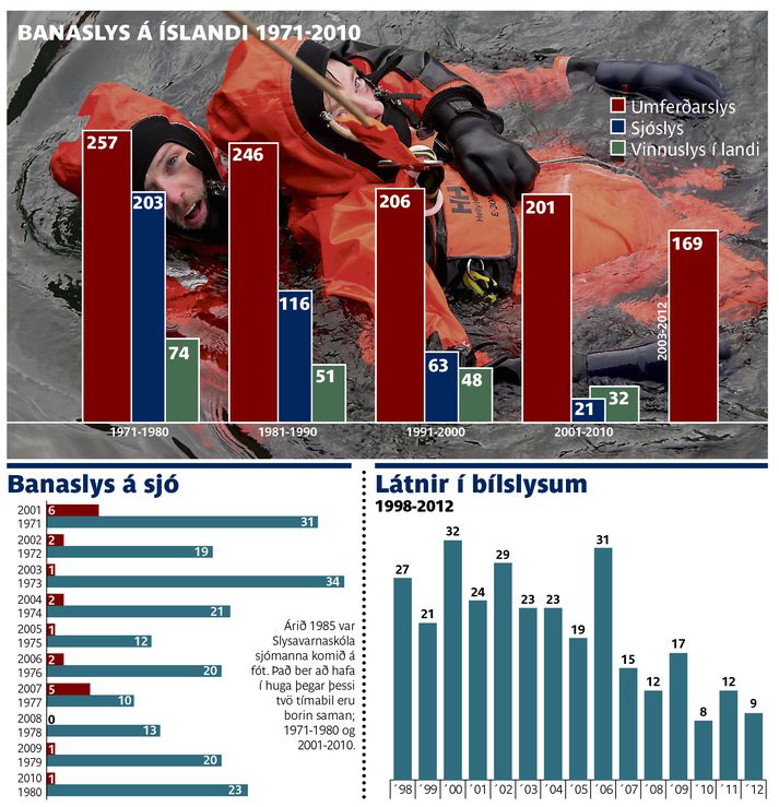 Mannlegi þátturinn skiptir alltaf mestu Svavar Hávarðsson skrifar 22. ágúst 2013 13:20 Grafík/Jónas - Svavar Þrjú dauðaslys í umferðinni á aðeins einni viku, þar sem fjórir einstaklingar létu lífið, vöktu enn á ný upp umræðuna um öryggismál. Óumdeilt er að mikill árangur hefur náðst við að fækka alvarlegum slysum í umferðinni á undanförnum árum, sem á einnig við um vinnutengd slys á sjó og landi á síðustu áratugum. En hvert er næsta skref í öryggismálum, bæði á sjó og í landi?Fræðslan mikilvæg Sverrir Konráðsson, sérfræðingur á siglingasviði Samgöngustofu, segir að vissulega sé mikill árangur á sviði öryggismála sjómanna eftirtektarverður. Hann segir að þann árangur megi þakka framförum á fjölmörgum sviðum; í auknum kröfum um fræðslu og öryggisþjálfun sjómanna, betri skipum og betri öryggisbúnaði á skipum, sífellt betri og aðgengilegri upplýsingum um veður og sjólag, vöktun skipa og skipaeftirliti, auk lögskráningu sjómanna og ströngum mönnunarreglum. „Ég held þó að ástæða sé til að taka sérstaklega út Slysavarnaskóla sjómanna sem var stofnaður árið 1985. Í dag má vart finna sjómann sem ekki hefur lokið þessu námi, nema þá aðeins fáeina stráka sem eru að hefja störf. Þar eru menn þjálfaðir við raunaðstæður, eins og með þyrlu. Erlendis fer svipuð þjálfun víða fram í sundlaugum,“ segir Sverrir. „Í þessu samhengi verður líka að hafa hugfast að kvótakerfið hefur breytt miklu, að ég tel. Sjómenn eiga aðeins tiltekinn afla og sækja því ekki nærri því eins fast. Flestir tefla því ekki í tvísýnu, eins og kannski áður var.“ Þótt dauðaslysum meðal íslenskra sjómanna hafi fækkað mikið er mikilvægt að viðhalda stöðugum umbótum í þágu öruggra siglinga. En hvernig verður það best gert? Sverrir segir nærtækast að þróa áfram það sem vel hefur verið gert og vera á stöðugum verði. „Það sem alltaf er verið að berjast við er mannlegi þátturinn. Við getum misst þetta frá okkur aftur og er þess skemmst að minnast að fjögur banaslys urðu á íslenskum sjómönnum á árinu 2012.“Stendur í stað Ágúst Mogensen, rannsóknastjóri Rannsóknarnefndar samgönguslysa, segir að orsakagreiningar í gegnum tíðina sýni alltaf það sama er kemur að dauðaslysum. Hlutföll standi í stað ár frá ári hvað varðar ölvunar- og hraðakstur og bílbeltanotkun, eða vöntun þar á. „Hvað varðar hraðaksturinn leggjum við þunga áherslu á löggæsluna og okkur hefur sýnst að hraðamyndavélar hafi gefið góða raun. Ég held að mikilvægt sé að fjölga þeim umtalsvert. Þetta á við um þéttbýlisstaði úti um landið, rétt eins og á fjölförnustu leiðunum frá borginni.“ Ágúst leggur þunga áherslu á að fátt komi í stað sýnilegrar löggæslu við að efla umferðaröryggi. „Við megum hreinlega ekki missa þau mál frá okkur. Það er afar brýnt að meira fjármagn sé veitt til löggæslunnar, og það fyrr en seinna.“Fælingarmáttur Spurður hvort fælingarmáttur með þyngri sektargreiðslum eða öðrum viðurlögum sé fær leið segir Ágúst að slíkt virki á ákveðna hópa. „En ef við erum að horfa á ölvunar- og lyfjaakstur verðum við að fjölga úrræðum. Það er tiltekinn hópur samfélagsþegna sem á við vanda að stríða og það þarf að mæta því sérstaklega,“ segir Ágúst. Michael G. Dreznes, aðstoðarforstjóri International Road Federation, hélt fyrirlestur hér á landi í apríl. Dreznes sagði að mistökum í umferðinni verði aldrei útrýmt. Ökumenn séu aðeins mannlegir og því vitað mál að þeir muni sofna undir stýri, gleyma sér við að hækka í útvarpinu eða kíkja á símann, keyra of hratt eða undir áhrifum. Slík mistök eigi hins vegar ekki að vera dauðadómur og lagði hann áherslu á ábyrgð þeirra sem annast hönnun og gerð vega.Ágúst MogensenJákvæð teikn Ágúst segir dæmin sanna mikilvægi þess að bæta vegakerfið. Reykjanesbrautin sé nærtækt dæmi en það sé leiðin á milli Reykjavíkur og Mosfellsbæjar einnig. „Það er mönnum bara ekki ferskt í minni hvað sá vegarkafli var hættulegur og má sennilega segja að það hafi verið einn hættulegasti vegarkafli landsins á sínum tíma,“ segir Ágúst um þá góðu reynslu sem er af því að breikka vegi þar sem umferð er mikil. Almennt séð leggur Ágúst þunga áherslu að umhverfi sé lagað í kringum vegi, þeir breikkaðir og umhverfið hreinsað. „Þannig að ef eitthvað gerist verði ekki mikil meiðsli. Svo eru einfaldir hlutir eins og vegrið og fleira.“ Ágúst nefnir ökunám á Íslandi sem einn þátt sem hefur þróast á mjög jákvæðan hátt. „Námið hefur tekið stakkaskiptum. Verkefni og kröfur hafa aukist í ökuskólunum, svo ekki sé talað um byltinguna sem fólst í því að taka upp æfingarakstur. Við erum að fá mun betri ökumenn inn í umferðina núna, því hver einasti klukkutími í þjálfun skiptir máli. Tölur sýna þetta svart á hvítu. Slysum hjá yngstu ökumönnunum hefur fækkað um 20 til 30% á tiltölulega stuttum tíma.“Eins og mannfall í stríði Dauðaslys eru alltaf óásættanleg. Því er það dapurleg lesning að horfa aftur um fjóra áratugi til að fá yfirlit yfir hversu margir hafa látið lífið við störf sín eða í umferðinni. Eru þá fjölmörg önnur slys þar sem dauði hlýst af ekki tekin með í myndina, til dæmis heimilis- og frístundaslys. Öfgarnar er varða dauðaslys á sjó vekja fyrst athygli. Á árunum 1971 til 1980 létust 203 menn í slysum á sjó, samkvæmt tölfræði frá Rannsóknarnefnd sjóslysa, en 21 á árunum 2001 til 2010. Svo brá við árin 2008 og 2011 að enginn lét lífið við vinnu sína á sjó og hljóta allir að dvelja nokkuð við þessa staðreynd.