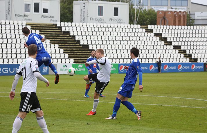 Umfjöllun, viðtöl, einkunnir og myndir: FH - Víkingur 2-2 Stefán Hirst Friðriksson á Kaplakrikavelli skrifar 1. september 2013 00:01 mynd/daníel FH-ingar og Víkingur Ólafsvík gerðu 2-2 jafntefli í átjándu umferð Pepsi-deildarinnar. Leikurinn var virkilega dramatískur en heimamenn náðu tveggja marka forystu áður en markverði FH-inga var vikið af velli og vítaspyrna dæmd. Gestirnir úr Ólafsvík gengu á lagið og jöfnuðu 2-2 og þar við sat. Leikurinn fór rólega af stað í Krikanum en það voru heimamenn í FH sem voru þó sterkari. Þeir náðu forystunni á 27. mínútu þegar Björn Daníel Sverrisson skoraði með skalla eftir hornspyrnu Sam Tillen. Heimamenn héldu áfram að stýra leiknum en gestirnir voru óheppnir að jafna ekki metin undir lok fyrri hálfleiksins þegar Guðmundur Steinn Hafsteinsson skallaði boltann í þverslánna úr dauðafæri. FH-ingar bættu við öðru marki í upphafi síðari hálfleiksins en þar var að verki markavélin Albert Brynjar Ingason með skalla úr hornspyrnu. Ólafsvíkingar fengu heldur betur líflínu á 60. mínútu en þá slapp Guðmundur Steinn Hafsteinsson inn fyrir vörn heimamanna, var felldur af Róberti Erni í marki FH og vítaspyrna dæmd. Dómari leiksins ákvað einnig að gefa Róberti rautt spjald. Antonio Jose Mossi skoraði svo úr vítaspyrnunni. Ólafsvíkingar pressuðu heimamenn nokkuð stíft í kjölfar rauða spjaldsins og tókst þeim að jafna metin á 79. mínútu þegar Insa Bohigues Francisco skoraði með skalla eftir hornspyrnu liðsins. Við tóku bráðfjörugar lokamínútur en bæði lið fengu séns á því að skora sigurmarkið en tókst ekki og jafnteflið því staðreynd. Framundan er mikil fallbarátta hjá Víkingum en FH-ingar virðast vera búnir að missa af lestinni í titilbaráttunni við KR.Heimir: Fíflalæti kostuðu okkur leikinn „Þetta eru auðvitað gríðarleg vonbrigði að ná ekki þremur stigum hérna í dag. Við getum á endanum þakkað fyrir að hafa náð þessu stigi. Við byrjuðum leikinn ekki alveg nógu vel en unnum okkur vel inn í leikinn. Við komumst yfir verðskuldað og bætum svo við öðru marki í seinni hálfleiknum," sagði Heimir. „Í framhaldi á því eiga sér stað einhver fíflalæti og við köstum þessu frá okkur. Við vorum með einhverja kóngastæla inn á vellinum og þeir refsuðu okkur fyrir það. Ef við drögum ekki lærdóm af þessum leik þá er okkur ekki viðbjargandi. „Við vorum í rauninni að kasta endanlega frá okkur möguleikanum að vinna deildina," sagði Heimir Guðjónsson, þjálfari FH-inga í leikslok.Ejub: Hefðum getað stolið þessu„Ég er rosalega sáttur með mína stráka. Við erum mjög ánægðir með stigið sem við náum í hérna og með smá heppni hefðum við getað stolið sigrinum. Við spiluðum flottan fótbolta og sérstaklega eftir að þeir misstu manninn útaf. Við erum inn í öllum leikjum og höfum við verið að standa okkur vel," sagði Ejub. „Menn eru bara bjartsýnir á framhaldið. Við vorum langlíklegustu kandídatarnir til þess að falla en við erum ennþá á lífi og í möguleika á að halda okkur áfram. Við stefnum að sjálfögðu á að gera það," sagði Ejub Purisevic, þjálfari Víkings Ólafsvíkur í leikslok.Albert Brynjar: Buðum hættunni heim„Við vorum með þennan leik í höndunum þangað til að við misstum manninn útaf. Þetta var virkilega lélegt hjá okkur að slaka svona á eftir að Robbi fór útaf og buðum við hættunni heim. Þeir refsuðu okkur svo fyrir þetta. „Ég er kominn í fínasta stand, er búinn að ná núna tveimur leikjum í röð og það í fyrsta skiptið í sumar. Ég vona að ég sé kominn í gott stand og geti hjálpað liðinu á lokasprettinum," sagði Albert Brynjar Ingason í leikslok. Pepsi Max-deild karla Mest lesið Þrír af Strákunum okkar í upptalningu á þeim bestu fyrir EM Handbolti Liverpool áfram í bikarnum og mætir Brighton í næstu umferð Enski boltinn Meistaraþjálfari danska landsliðsins segist hafa breytt um stíl Handbolti Þegar Dagur féll á lyfjaprófi: „Var með magasár í hálft ár“ Handbolti Búast við því að Carrick verði kynntur hjá United innan tíðar Enski boltinn KR ekki í teljandi vandræðum með að tryggja sig í undanúrslit Körfubolti Litla liðið í París sló út stórveldi PSG Fótbolti Sjáðu magnaða vörslu hins 43 ára Gordon: „Ein mín besta á ferlinum“ Fótbolti Katarar vilja halda fyrsta HM félagsliða hjá konunum Fótbolti Mætir Liverpool en fær gæsahúð þegar hann heyrir „You'll Never Walk Alone“ Enski boltinn Fleiri fréttir Kristín Dís áfram í herbúðum Blika Miðbær Reykjavíkur er Íslandsmeistari Snýr aftur til Íslands og tekur við ÍBV Róbert með þrennu í sigri KR Fram lagði Leiknismenn Landsliðsbræður Palestínu sameinast í Keflavík Bikarhetjan til KA Þrótti berst mikill liðsstyrkur úr Keflavík Jón Guðni aðstoðar Ólaf Inga Blikarnir eru búnir að missa 34 mörk og 25 stoðsendingar Birta eltir ástina og semur við Genoa Júlíus Mar seldur til Kristiansund Bæði Blikaliðin fá sánuklefa fyrir komandi tímabil Feginn að vera fluttur heim úr fátækrahverfinu í Kína Svekktur að fá ekki leyfi til að taka við ÍBV Alfreð hættur hjá Breiðabliki Skipulagsbreytingar á skrifstofu KSÍ Nýliðarnir fá bandarískan markvörð Júlíus sagður á förum frá KR til Noregs Vestri opnar knattspyrnuakademíu í Senegal Valur fær Dana til að fullmóta teymi sín Ingimar Stöle semur við Val Adda verður hægri hönd Ian Jeffs í sumar „Mér var bara tjáð að þeir ætluðu að leita eitthvað annað“ Enn kvarnast úr liði Blika Leið Víkings að titlinum rifjuð upp í kvöld Þjálfar 2. flokk samhliða því að spila fyrir KR Færeysk landsliðskona til liðs við ÍBV Býst ekki við að spila aftur fyrir landsliðið Kynntu