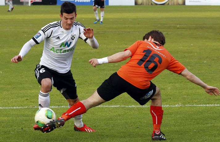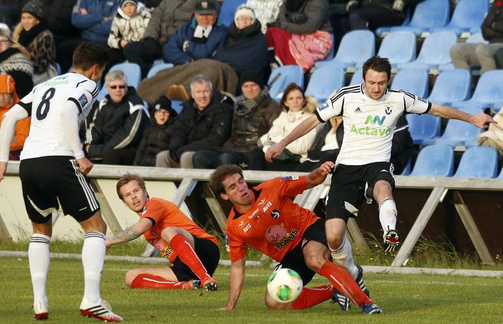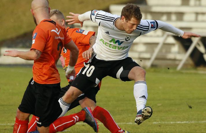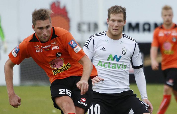 Umfjöllun, viðtöl, einkunnir og myndir: Fylkir - FH 0-1 Árni Jóhannsson í Lautinni skrifar 12. september 2013 08:54 mynd/valli Fylkir og FH mættust á Fylkisvellinum í dag í 19. umferð Pepsi-deildar karla í leik sem myndi falla í gleymskunnar dá ef ekki væri fyrir að úrslit leiksins væru skráð. Leikurinn fór hægt af stað og var mikil stöðubarátta og leikmenn áttu erfitt með að koma boltanum á samherja í fyrri hálfleik. Völlurinn hefur litið betur út má segja og gæti það verið hugsanleg ástæða fyrir því að ekki var mikið um gæði í spilamennsku liðanna. Það fór meira fyrir baráttu leikmanna í þessum leik. Markverðustu atriði fyrri hálfleiks bera þess keim um hvernig leikurinn spilaðist. Davíð Þór Viðarsson fékk gult spjald fyrir tæklingu sem Magnús Þórisson mat sem tveggja fóta en Davíð náði boltanum hreint af Fylkismanninum en Magnús ákvað að veifa gula spjaldinu. Fjórum mínútum seinna lá Davíð í grasinu eftir viðskipti við Ásgeir Börk sem var að skýla boltanum fyrir Davíð og slysaðist til að setja olnbogann í andlit Davíðs. Leikmenn FH vildu fá Ásgeir rekinn af velli en dómari leiksins var ekki á sama máli. Magnús Þórisson dómari, þurfti síðan að skipta sér sjálfum af velli eftir um hálftíma leik og inn á í hans stað kom Erlendur Eiríksson. Þetta er því í annað skiptið í sumar sem skipta þarf um dómara í Árbænum. Fyrri hálfleikur rann út og liðin gengu jöfn til búningsherbergja. Seinni hálfleikur var afrit af þeim fyrri, einkenndist af baráttu og misheppnuðum sendingum og örfáum færum. Engin af færunum eru verð þess að ræða þau eitthvað nánar. Á 74. mínútu leiksins var Atla Viðari Björnssyni skipt inn á í stað Alberts Brynjars Ingasonar og átti hann eftir að hafa mikil áhrif á úrslit leiksins. Fjórtán mínútum síðar fékk hann knöttinn inn í vítateig Fylkis, með varnarmann í bakinu. Hann sneri varnarmanninn snyrtilega af sér og setti boltann síðan á milli fóta Bjarna í markinu og yfir línuna. Staðan orðin 0-1 og FH-ingar létu forystuna ekki af hendi þangað til Erlendur flautaði leikinn af. Eftir leikinn heldur FH enn í við KR sem samt sem áður á tvo leiki inni á þá og verður því að teljast lítil von um að FH nái að landa Íslandsmeistaratitlinum þetta árið. Fylkir er ekki alveg sloppið við falldrauginn en sex stig eru í fallsætið, þeir verða því að halda áfram og reyna að tryggja sæti sitt í næstu leikjum.Davíð Þór Viðarsson: Vantar drápseðlið inn í teig „Þetta var erfiður leikur í dag, Fylkir er náttúrulega með gott lið og þetta var mjög tæpt en við náðum að pota inn einu marki þarna í lokin,“ sagði sigurreifur Davíð Þór Viðarsson, leikmaður FH, eftir sigur sinna manna í Árbænum í kvöld. Aðspurður um hvernig leikurinn leit við honum sagði Davíð: „Við vorum alveg ágætir seinustu 25 mínúturnar í fyrri hálfleik, þá vorum við að halda boltanum ágætlega og náðum að skipta honum á milli kanta en það vantaði þetta síðasta hjá okkur. Eins og er búið að vanta hjá okkur í allt sumar, þetta drápseðli inn í teig“. „Ég var að heyra að KR hafi unnið þannig að það er orðið vonlítið að við náum þeim en við þurfum þá bara að einbeita okkur að Evrópusætinu. Það er ekki orðið öruggt þannig að við þurfum að vinna þá leiki sem eftir eru,“ sagði Davíð að lokum um stöðuna í deildinni og möguleika FH á Íslandsmeistaratitlinum.Ásmundur Arnarsson: Mest svekkjandi að tapa svona Ásmundur Arnarsson var spurður að því hvort það hafi ekki verið svekkjandi að tapa þessum leik sem var jafn alveg þangað til í blálokin. „Þetta eru mest svekkjandi leikirnir, þegar þú ert búinn að vera að berjast fyrir hlutunum allan tímann. Ég verð samt að hrósa strákunum fyrir vinnuframlagið og baráttuna. Skipulagið hélt lengst af, þeir sköpuðu sér lítið og það lá í loftinu að leikurinn myndi fjara út markalaus og auðvitað vill maður að þetta falli sín megin en þeir hafa Atla Viðar og hann er alltaf líklegur til að skora.“ „Það var mjög fátt í þessu, völlurinn náttúrulega erfiður og menn voru ekki að ná að skapa sér neitt af viti. Það komu smá spilkaflar en að mínu mati hefði 0-0 verið sanngjarnt miðað við hvernig þetta spilaðist," sagði Ásmundur um hvernig leikurinn spilaðist. Aðspurður um seinustu leikina og fallbaráttuna hafði Ásmundur þetta að segja: „Við erum fræðilega séð ekki lausir ennþá við fallbaráttuna þannig að við þurfum að halda áfram og taka síðustu leikina á fullu og taka inn fleiri stig.“Heimir Guðjónsson: Það var frábært að vinna þennan leik Heimir Guðjónsson, þjálfari FH, var að vonum ánægður með sigur sinna manna í dag. „Það var frábært að vinna þennan leik, hann var jafn og við byrjuðum ekki hálfleikana vel en við unnum okkur inn í þá og Atli Viðar kom inn á og kláraði þetta fyrir okkur. Fylkir er náttúrulega með mjög gott lið, gott skipulag og með góða leikmenn. Við sáum það bara í seinasta leik þegar þeir unnu Breiðablik 4-1 það var því sterkt að koma hingað og fá þrjú stig." Um spilamennskuna í leiknum hafði Heimir að segja: „Ég hef oft séð betri leik heldur en þennan en ég hef líka séð þá verri, ég kom hérna í fyrra og kvartaði undan vellinum þannig að ég ætla ekki að gera það í dag." Hann var inntur eftir því hvort völlurinn hafi spilað mikið inn í frammistöðu leikmanna í dag. „Nei nei, við unnum þennan leik og það er frábært.“ Heimir var spurður hvort það væri einhver möguleiki á að ná KR að stigum og sagði, „Nei, KR vann held ég þannig að við þurfum bara að fókusera á að klára Evrópusætið. Stjarnan er náttúru