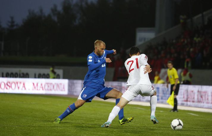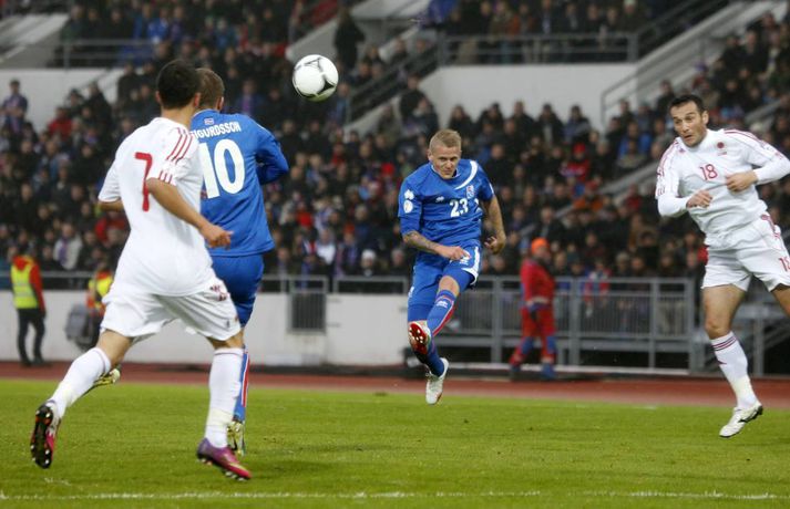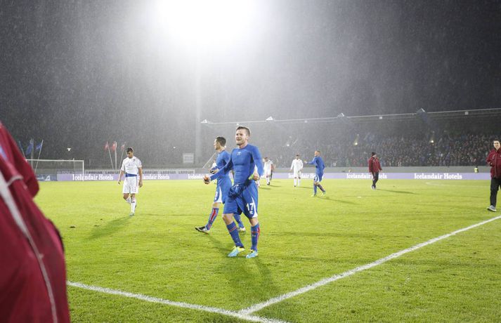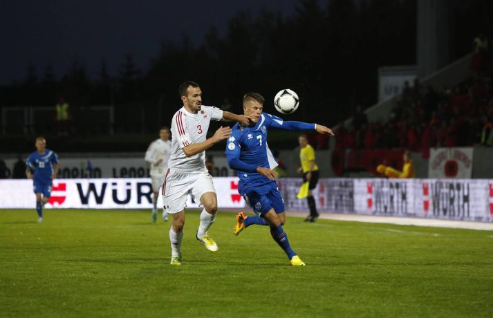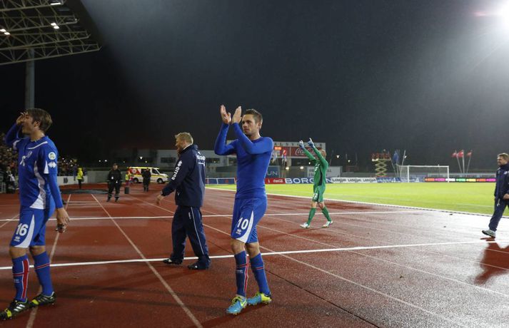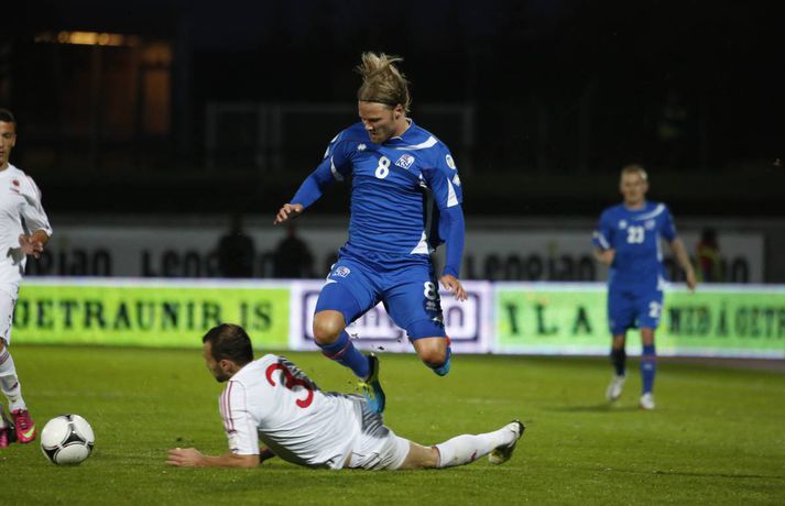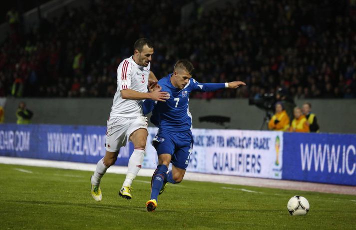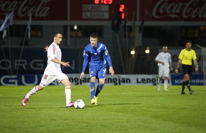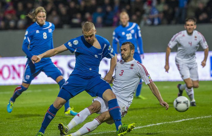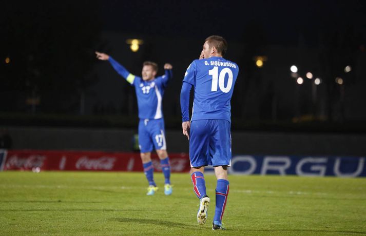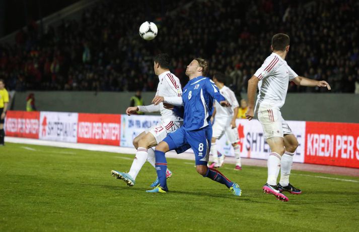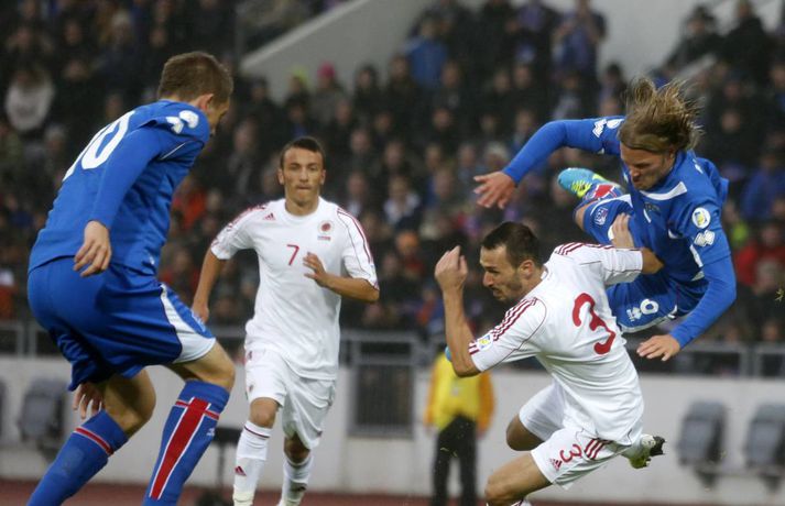 Umfjöllun, viðtöl, einkunnir og myndir: Ísland - Albanía 2-1 Óskar Ófeigur Jónsson á Laugardalsvelli skrifar 10. september 2013 08:39 Mynd/Valli Ísland er í kjör stöðu í öðru sæti E-riðils undankeppni HM eftir 2-1 sigur á Albaínu á Laugardalsvelli í kvöld. Ísland er með stigi meira en Slóvenía í þriðja sæti. Íslenska liðið lék frábærlega í kvöld. Liðið stjórnaði spilinu lengst af leiknum og það var ekki fyrr en síðustu tuttugu mínútur leiksins að Albanía stjórnaði spilinu án þess þó ógna marki Íslands að einhverju marki. Þrátt fyrir það komst Albanía yfir með fyrsta marki leiksins strax á 9. mínútu. Birkir Bjarnason tapaði boltanum klaufalega og gestirnir sóttu hratt og skoruðu með góðu skoti fyrir utan teig. Birkir bætti fyrir mistök sín þegar hann jafnaði metin aðeins fimm mínútum síðar. Birkir Már Sævarsson átti þá fyrirgjöf sem Albanir náðu ekki að hreinsa frá og nafni hans hamraði boltann í netið af stuttu færi á fjærstöng. Skömmu áður hafði Eiður Smári fengið upplagt færi til að jafna metin eftir frábæra sendingu Gylfa Þórs Sigurðssonar en Ísland byrjaði leikinn mjög ákveðið og sótti mikið fyrstu mínútur leiksins þrátt fyrir Albanía hafi skorað fyrst. Þrátt fyrir mikla yfirburði náði Ísland ekki að skapa sér fleiri afgerandi færi í fyrri hálfleik. Liðið lék frábærlega úti á vellinum en herslumuninn vantaði og liðið varð að sætta sig við skot utan af velli sem markvörður Albaníu átti í litlum vandræðum með. Það tók Ísland ekki nema 96 sekúndur að skora í seinni hálfleik. Gylfi Þór Sigurðsson sem var frábær í leiknum átti flotta sendingu á Birki Má sem gerði vel í að komast fram fyrir vinstri bakvörð Albaníu, senda fyrir og þar stýrði Kolbeinn Sigþórsson boltanum í netið af markteig. Frábærlega að verki staðið hjá íslenska liðinu. Albanía færði sig framar við að lenda undir og þó íslenska liðið hafi áfram verið sterkari aðilinn komust gestirnir meira inn í leikinn og áttu nokkrar góðar sóknir sem íslenska liðinu tókst að verjast án teljandi vandræða. Síðustu tíu mínútur leiksins var nánast allt íslenska liðið komið aftur fyrir boltann og sókn Albaníu þyngdist enn án þess að liðið næði að opna íslensku vörnina og verðskuldaður íslenskur sigur staðreynd. Íslenska liðið sýndi mikinn styrk í að brotna ekki við að lenda undir snemma leiks eftir hið mikla tal um hripleka vörn liðsins í undankeppninni. Varnarleikur liðsins var að mestu leiti til mikilar fyrirmyndar og fékk Albanía fá færi til að skora fleiri mörk í leiknum. Íslenska liðið hefði hæglega getað skorað fleiri mörk en þegar á þurfti að halda síðustu mínútur leiksins sýndi liðið að það getur vel varist sem heild. Liðið innbyrti þrjú ákaflega mikilvæg stig og er með örlög sín í eigin hendi þegar tvær umferðir eru eftir af riðlinum.Gylfi Þór: Fólk sér ekki hve duglegur Aron er „Þetta var ógeðslega gaman, fullur völlur og frábær stemmning. Það var markmiðið að ná í fjögur stig í þessarri viku og við náðum því. Það eru því allir sáttir," sagði Gylfi Þór við hóp íslenska blaðamanna eftir leikinn. „Við vorum mikið betri í þessum leik en á móti Sviss. Við gerðum ekki eins mikið af mistökum og í þeim leik enda var varnarlínan hærri og það var minna bil á milli allra í liðinu. Þetta var mikið betur," sagði Gylfi. Gylfi fékk slæmt spark frá Lorik Cana í seinni hálfleik en harkaði af sér og kláraði leikinn. „Löppin er svolítið marin og svolítið bólgin en ég held að hún verði orðin ágæt eftir tvo daga," sagði Gylfi. Gylfi lék að þessu sinni á miðjunni og við hlið Aron Einars Gunnarssonar. „Hann er svo duglegur og ég held að fólk sjái ekki hversu duglegur hann er í raun. Hann er vinna fullt af tæklingum og fullt af seinni boltum. Hann er hirða upp draslið á miðjunni og ég fær um leið meira leyfi til þess að fara fram á við til að spila boltanum. Við erum að ná mjög vel saman," sagði Gylfi. Íslenska liðið er í 2. sæti í riðlinum og í frábærri stöðu til þess að komast í umspilið um sæti á HM í Brasilíu. „Þetta er langt frá því að vera búið því það eru tveir mjög erfiðir leikir eftir. Kýpur er ekki með frábært lið en þeir eru lúmskir og það er erfitt að spila á móti þeim. Svo eigum við mjög erfiðan leik úti á móti Noregi. Vonandi náum við líka jákvæðum úrslitum í næsta mánuði," sagði Gylfi.Lagerbäck: Verðum meðal þeirra bestu í Evrópu„Sendingarnar í fyrri hálfleik voru stórkostlegar. Ég hef ekki séð þá spila svona vel ef frá er talinn seinni hálfleikurinn í Sviss,“ sagði Lars Lagerbäck, þjálfari karlalandsliðsins á blaðamannafundi eftir leikinn. Gylfi Þór Sigurðsson og Eiður Smári Guðjohnsen náðu einkar vel saman í fyrri hálfleiknum. Sá fyrrnefndi var raunar í sérflokki í leiknum. „Það besta við Gylfa er að þótt hann sé leikmaður með mikil gæði þá leggur hann afar hart að sér í níutíu mínútur. Það sér maður ekki oft hjá leikmönnum í hans gæðaflokki,“ sagði Lagerbäck um frammistöðu Gylfa. Svíinn benti á að nú væri örlög landsliðsins í þess höndum. Liðið gæti tryggt sæti sitt í umspilinu án þess að þurfa að treysta á aðra. Mikilvægt sé þó að halda sér á jörðinni og einbeita sér að leiknum gegn Kýpur. „Þeir hafa ekki unnið marga leiki en við töpuðum gegn þeim úti. Ég tek engu sem sjálfsögðu hlut í fótbolta,“ sagði Svínn. Ísland tekur á móti Kýpur 11. október og sækir Noreg heim fjórum dögum síðar. Aðspurður sagðist Lagerbäck alveg hafa ímyndað sér að landsliðið ætti möguleika þegar tveir leikir væru eftir 