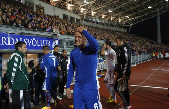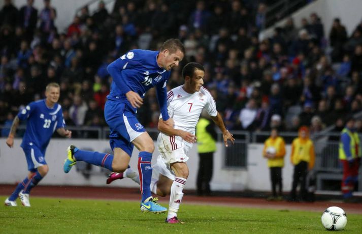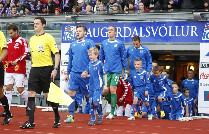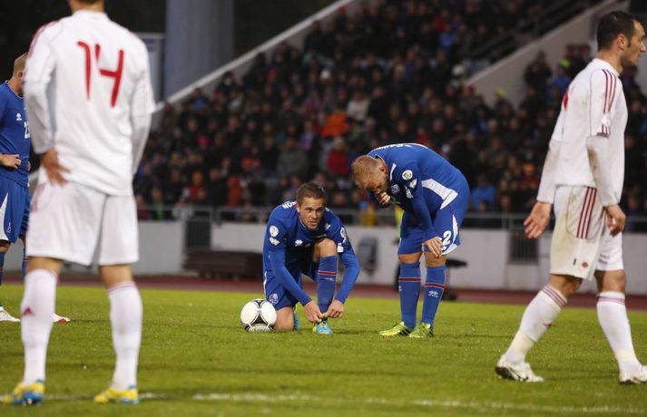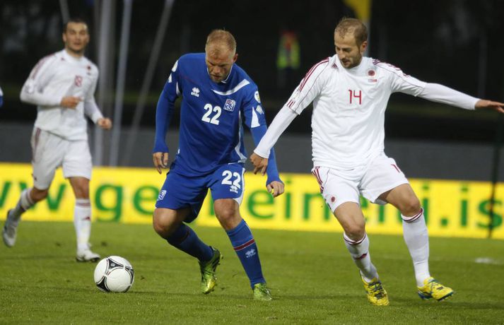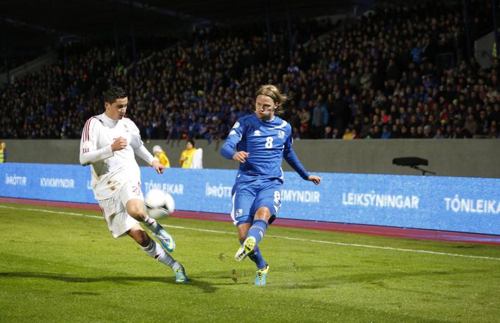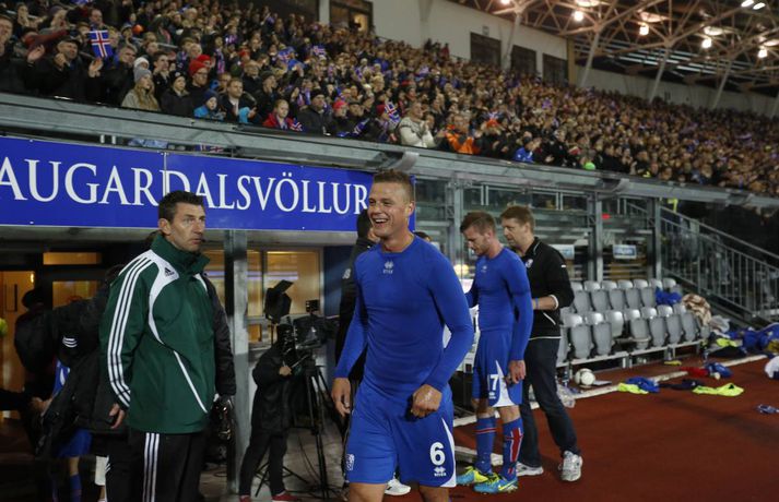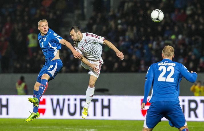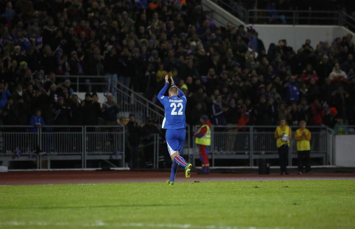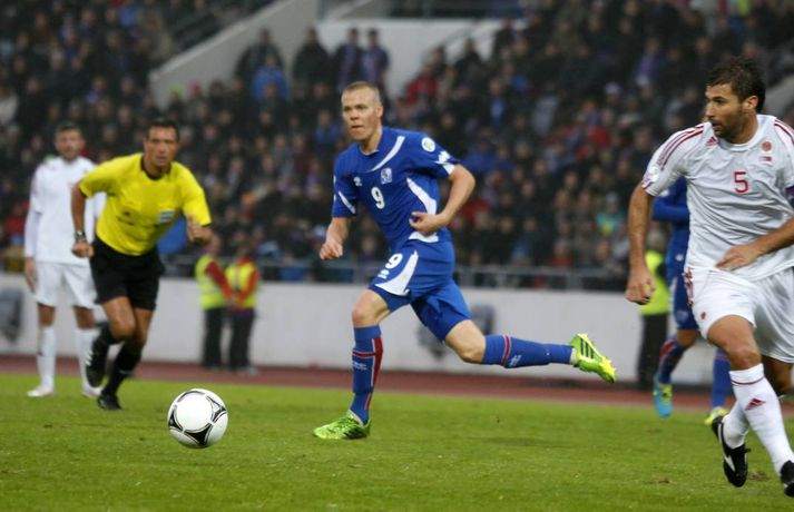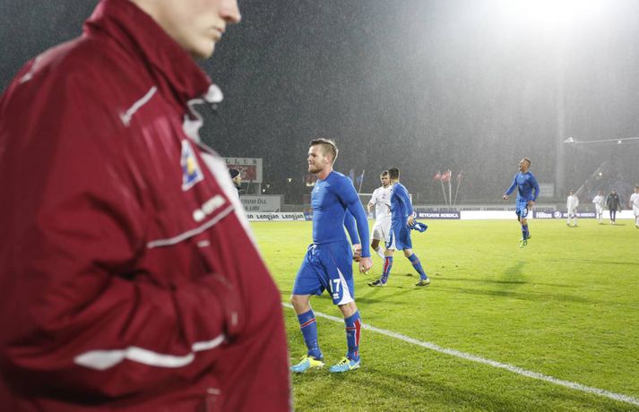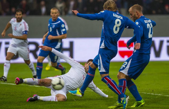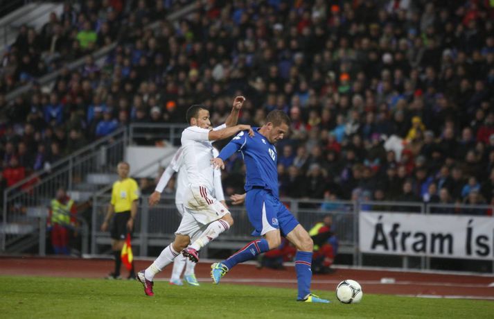 Umfjöllun, viðtöl, einkunnir og myndir: Ísland - Albanía 2-1 Óskar Ófeigur Jónsson á Laugardalsvelli skrifar 10. september 2013 08:39 Mynd/Valli Ísland er í kjör stöðu í öðru sæti E-riðils undankeppni HM eftir 2-1 sigur á Albaínu á Laugardalsvelli í kvöld. Ísland er með stigi meira en Slóvenía í þriðja sæti. Íslenska liðið lék frábærlega í kvöld. Liðið stjórnaði spilinu lengst af leiknum og það var ekki fyrr en síðustu tuttugu mínútur leiksins að Albanía stjórnaði spilinu án þess þó ógna marki Íslands að einhverju marki. Þrátt fyrir það komst Albanía yfir með fyrsta marki leiksins strax á 9. mínútu. Birkir Bjarnason tapaði boltanum klaufalega og gestirnir sóttu hratt og skoruðu með góðu skoti fyrir utan teig. Birkir bætti fyrir mistök sín þegar hann jafnaði metin aðeins fimm mínútum síðar. Birkir Már Sævarsson átti þá fyrirgjöf sem Albanir náðu ekki að hreinsa frá og nafni hans hamraði boltann í netið af stuttu færi á fjærstöng. Skömmu áður hafði Eiður Smári fengið upplagt færi til að jafna metin eftir frábæra sendingu Gylfa Þórs Sigurðssonar en Ísland byrjaði leikinn mjög ákveðið og sótti mikið fyrstu mínútur leiksins þrátt fyrir Albanía hafi skorað fyrst. Þrátt fyrir mikla yfirburði náði Ísland ekki að skapa sér fleiri afgerandi færi í fyrri hálfleik. Liðið lék frábærlega úti á vellinum en herslumuninn vantaði og liðið varð að sætta sig við skot utan af velli sem markvörður Albaníu átti í litlum vandræðum með. Það tók Ísland ekki nema 96 sekúndur að skora í seinni hálfleik. Gylfi Þór Sigurðsson sem var frábær í leiknum átti flotta sendingu á Birki Má sem gerði vel í að komast fram fyrir vinstri bakvörð Albaníu, senda fyrir og þar stýrði Kolbeinn Sigþórsson boltanum í netið af markteig. Frábærlega að verki staðið hjá íslenska liðinu. Albanía færði sig framar við að lenda undir og þó íslenska liðið hafi áfram verið sterkari aðilinn komust gestirnir meira inn í leikinn og áttu nokkrar góðar sóknir sem íslenska liðinu tókst að verjast án teljandi vandræða. Síðustu tíu mínútur leiksins var nánast allt íslenska liðið komið aftur fyrir boltann og sókn Albaníu þyngdist enn án þess að liðið næði að opna íslensku vörnina og verðskuldaður íslenskur sigur staðreynd. Íslenska liðið sýndi mikinn styrk í að brotna ekki við að lenda undir snemma leiks eftir hið mikla tal um hripleka vörn liðsins í undankeppninni. Varnarleikur liðsins var að mestu leiti til mikilar fyrirmyndar og fékk Albanía fá færi til að skora fleiri mörk í leiknum. Íslenska liðið hefði hæglega getað skorað fleiri mörk en þegar á þurfti að halda síðustu mínútur leiksins sýndi liðið að það getur vel varist sem heild. Liðið innbyrti þrjú ákaflega mikilvæg stig og er með örlög sín í eigin hendi þegar tvær umferðir eru eftir af riðlinum.Gylfi Þór: Fólk sér ekki hve duglegur Aron er „Þetta var ógeðslega gaman, fullur völlur og frábær stemmning. Það var markmiðið að ná í fjögur stig í þessarri viku og við náðum því. Það eru því allir sáttir," sagði Gylfi Þór við hóp íslenska blaðamanna eftir leikinn. „Við vorum mikið betri í þessum leik en á móti Sviss. Við gerðum ekki eins mikið af mistökum og í þeim leik enda var varnarlínan hærri og það var minna bil á milli allra í liðinu. Þetta var mikið betur," sagði Gylfi. Gylfi fékk slæmt spark frá Lorik Cana í seinni hálfleik en harkaði af sér og kláraði leikinn. „Löppin er svolítið marin og svolítið bólgin en ég held að hún verði orðin ágæt eftir tvo daga," sagði Gylfi. Gylfi lék að þessu sinni á miðjunni og við hlið Aron Einars Gunnarssonar. „Hann er svo duglegur og ég held að fólk sjái ekki hversu duglegur hann er í raun. Hann er vinna fullt af tæklingum og fullt af seinni boltum. Hann er hirða upp draslið á miðjunni og ég fær um leið meira leyfi til þess að fara fram á við til að spila boltanum. Við erum að ná mjög vel saman," sagði Gylfi. Íslenska liðið er í 2. sæti í riðlinum og í frábærri stöðu til þess að komast í umspilið um sæti á HM í Brasilíu. „Þetta er langt frá því að vera búið því það eru tveir mjög erfiðir leikir eftir. Kýpur er ekki með frábært lið en þeir eru lúmskir og það er erfitt að spila á móti þeim. Svo eigum við mjög erfiðan leik úti á móti Noregi. Vonandi náum við líka jákvæðum úrslitum í næsta mánuði," sagði Gylfi.Lagerbäck: Verðum meðal þeirra bestu í Evrópu„Sendingarnar í fyrri hálfleik voru stórkostlegar. Ég hef ekki séð þá spila svona vel ef frá er talinn seinni hálfleikurinn í Sviss,“ sagði Lars Lagerbäck, þjálfari karlalandsliðsins á blaðamannafundi eftir leikinn. Gylfi Þór Sigurðsson og Eiður Smári Guðjohnsen náðu einkar vel saman í fyrri hálfleiknum. Sá fyrrnefndi var raunar í sérflokki í leiknum. „Það besta við Gylfa er að þótt hann sé leikmaður með mikil gæði þá leggur hann afar hart að sér í níutíu mínútur. Það sér maður ekki oft hjá leikmönnum í hans gæðaflokki,“ sagði Lagerbäck um frammistöðu Gylfa. Svíinn benti á að nú væri örlög landsliðsins í þess höndum. Liðið gæti tryggt sæti sitt í umspilinu án þess að þurfa að treysta á aðra. Mikilvægt sé þó að halda sér á jörðinni og einbeita sér að leiknum gegn Kýpur. „Þeir hafa ekki unnið marga leiki en við töpuðum gegn þeim úti. Ég tek engu sem sjálfsögðu hlut í fótbolta,“ sagði Svínn. Ísland tekur á móti Kýpur 11. október og sækir Noreg heim fjórum dögum síðar. Aðspurður sagðist Lagerbäck alveg hafa ímyndað sér að landsliðið ætti möguleika þegar tveir leikir væru eftir 