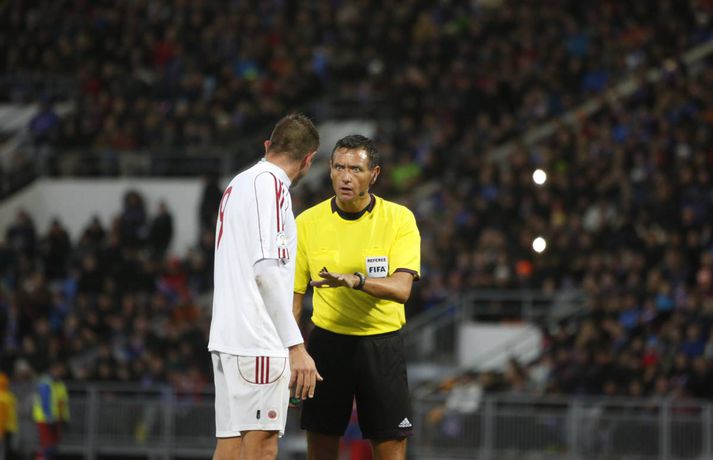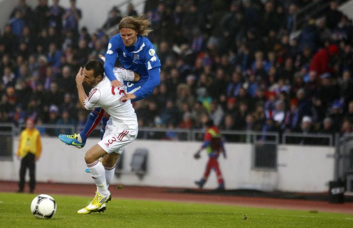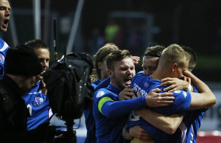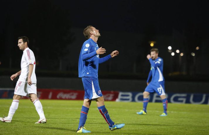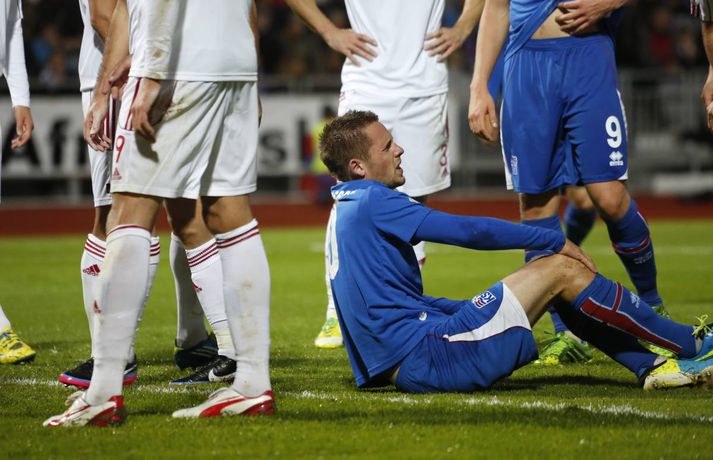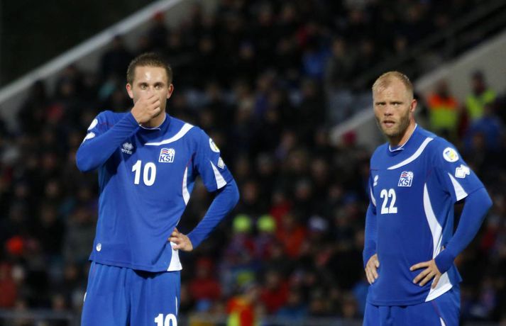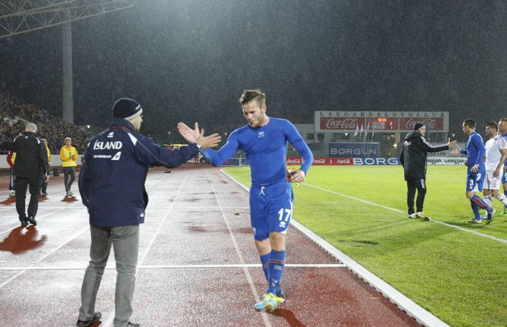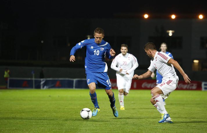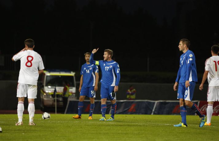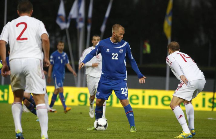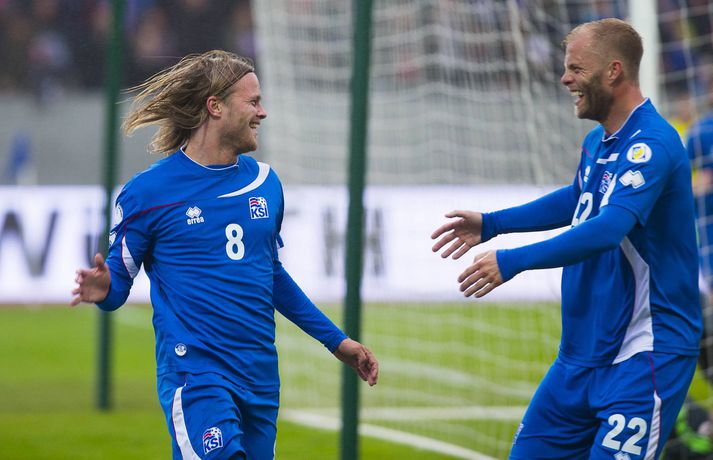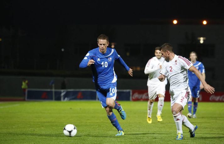 Umfjöllun, viðtöl, einkunnir og myndir: Ísland - Albanía 2-1 Óskar Ófeigur Jónsson á Laugardalsvelli skrifar 10. september 2013 08:39 Mynd/Valli Ísland er í kjör stöðu í öðru sæti E-riðils undankeppni HM eftir 2-1 sigur á Albaínu á Laugardalsvelli í kvöld. Ísland er með stigi meira en Slóvenía í þriðja sæti. Íslenska liðið lék frábærlega í kvöld. Liðið stjórnaði spilinu lengst af leiknum og það var ekki fyrr en síðustu tuttugu mínútur leiksins að Albanía stjórnaði spilinu án þess þó ógna marki Íslands að einhverju marki. Þrátt fyrir það komst Albanía yfir með fyrsta marki leiksins strax á 9. mínútu. Birkir Bjarnason tapaði boltanum klaufalega og gestirnir sóttu hratt og skoruðu með góðu skoti fyrir utan teig. Birkir bætti fyrir mistök sín þegar hann jafnaði metin aðeins fimm mínútum síðar. Birkir Már Sævarsson átti þá fyrirgjöf sem Albanir náðu ekki að hreinsa frá og nafni hans hamraði boltann í netið af stuttu færi á fjærstöng. Skömmu áður hafði Eiður Smári fengið upplagt færi til að jafna metin eftir frábæra sendingu Gylfa Þórs Sigurðssonar en Ísland byrjaði leikinn mjög ákveðið og sótti mikið fyrstu mínútur leiksins þrátt fyrir Albanía hafi skorað fyrst. Þrátt fyrir mikla yfirburði náði Ísland ekki að skapa sér fleiri afgerandi færi í fyrri hálfleik. Liðið lék frábærlega úti á vellinum en herslumuninn vantaði og liðið varð að sætta sig við skot utan af velli sem markvörður Albaníu átti í litlum vandræðum með. Það tók Ísland ekki nema 96 sekúndur að skora í seinni hálfleik. Gylfi Þór Sigurðsson sem var frábær í leiknum átti flotta sendingu á Birki Má sem gerði vel í að komast fram fyrir vinstri bakvörð Albaníu, senda fyrir og þar stýrði Kolbeinn Sigþórsson boltanum í netið af markteig. Frábærlega að verki staðið hjá íslenska liðinu. Albanía færði sig framar við að lenda undir og þó íslenska liðið hafi áfram verið sterkari aðilinn komust gestirnir meira inn í leikinn og áttu nokkrar góðar sóknir sem íslenska liðinu tókst að verjast án teljandi vandræða. Síðustu tíu mínútur leiksins var nánast allt íslenska liðið komið aftur fyrir boltann og sókn Albaníu þyngdist enn án þess að liðið næði að opna íslensku vörnina og verðskuldaður íslenskur sigur staðreynd. Íslenska liðið sýndi mikinn styrk í að brotna ekki við að lenda undir snemma leiks eftir hið mikla tal um hripleka vörn liðsins í undankeppninni. Varnarleikur liðsins var að mestu leiti til mikilar fyrirmyndar og fékk Albanía fá færi til að skora fleiri mörk í leiknum. Íslenska liðið hefði hæglega getað skorað fleiri mörk en þegar á þurfti að halda síðustu mínútur leiksins sýndi liðið að það getur vel varist sem heild. Liðið innbyrti þrjú ákaflega mikilvæg stig og er með örlög sín í eigin hendi þegar tvær umferðir eru eftir af riðlinum.Gylfi Þór: Fólk sér ekki hve duglegur Aron er „Þetta var ógeðslega gaman, fullur völlur og frábær stemmning. Það var markmiðið að ná í fjögur stig í þessarri viku og við náðum því. Það eru því allir sáttir," sagði Gylfi Þór við hóp íslenska blaðamanna eftir leikinn. „Við vorum mikið betri í þessum leik en á móti Sviss. Við gerðum ekki eins mikið af mistökum og í þeim leik enda var varnarlínan hærri og það var minna bil á milli allra í liðinu. Þetta var mikið betur," sagði Gylfi. Gylfi fékk slæmt spark frá Lorik Cana í seinni hálfleik en harkaði af sér og kláraði leikinn. „Löppin er svolítið marin og svolítið bólgin en ég held að hún verði orðin ágæt eftir tvo daga," sagði Gylfi. Gylfi lék að þessu sinni á miðjunni og við hlið Aron Einars Gunnarssonar. „Hann er svo duglegur og ég held að fólk sjái ekki hversu duglegur hann er í raun. Hann er vinna fullt af tæklingum og fullt af seinni boltum. Hann er hirða upp draslið á miðjunni og ég fær um leið meira leyfi til þess að fara fram á við til að spila boltanum. Við erum að ná mjög vel saman," sagði Gylfi. Íslenska liðið er í 2. sæti í riðlinum og í frábærri stöðu til þess að komast í umspilið um sæti á HM í Brasilíu. „Þetta er langt frá því að vera búið því það eru tveir mjög erfiðir leikir eftir. Kýpur er ekki með frábært lið en þeir eru lúmskir og það er erfitt að spila á móti þeim. Svo eigum við mjög erfiðan leik úti á móti Noregi. Vonandi náum við líka jákvæðum úrslitum í næsta mánuði," sagði Gylfi.Lagerbäck: Verðum meðal þeirra bestu í Evrópu„Sendingarnar í fyrri hálfleik voru stórkostlegar. Ég hef ekki séð þá spila svona vel ef frá er talinn seinni hálfleikurinn í Sviss,“ sagði Lars Lagerbäck, þjálfari karlalandsliðsins á blaðamannafundi eftir leikinn. Gylfi Þór Sigurðsson og Eiður Smári Guðjohnsen náðu einkar vel saman í fyrri hálfleiknum. Sá fyrrnefndi var raunar í sérflokki í leiknum. „Það besta við Gylfa er að þótt hann sé leikmaður með mikil gæði þá leggur hann afar hart að sér í níutíu mínútur. Það sér maður ekki oft hjá leikmönnum í hans gæðaflokki,“ sagði Lagerbäck um frammistöðu Gylfa. Svíinn benti á að nú væri örlög landsliðsins í þess höndum. Liðið gæti tryggt sæti sitt í umspilinu án þess að þurfa að treysta á aðra. Mikilvægt sé þó að halda sér á jörðinni og einbeita sér að leiknum gegn Kýpur. „Þeir hafa ekki unnið marga leiki en við töpuðum gegn þeim úti. Ég tek engu sem sjálfsögðu hlut í fótbolta,“ sagði Svínn. Ísland tekur á móti Kýpur 11. október og sækir Noreg heim fjórum dögum síðar. Aðspurður sagðist Lagerbäck alveg hafa ímyndað sér að landsliðið ætti möguleika þegar tveir leikir væru eftir 